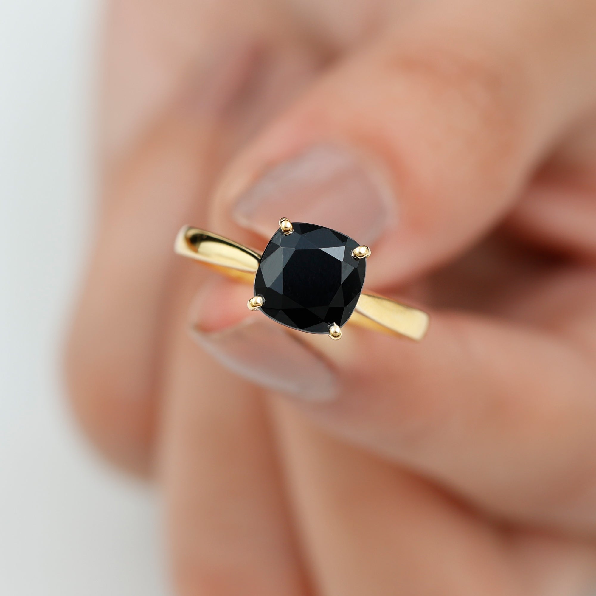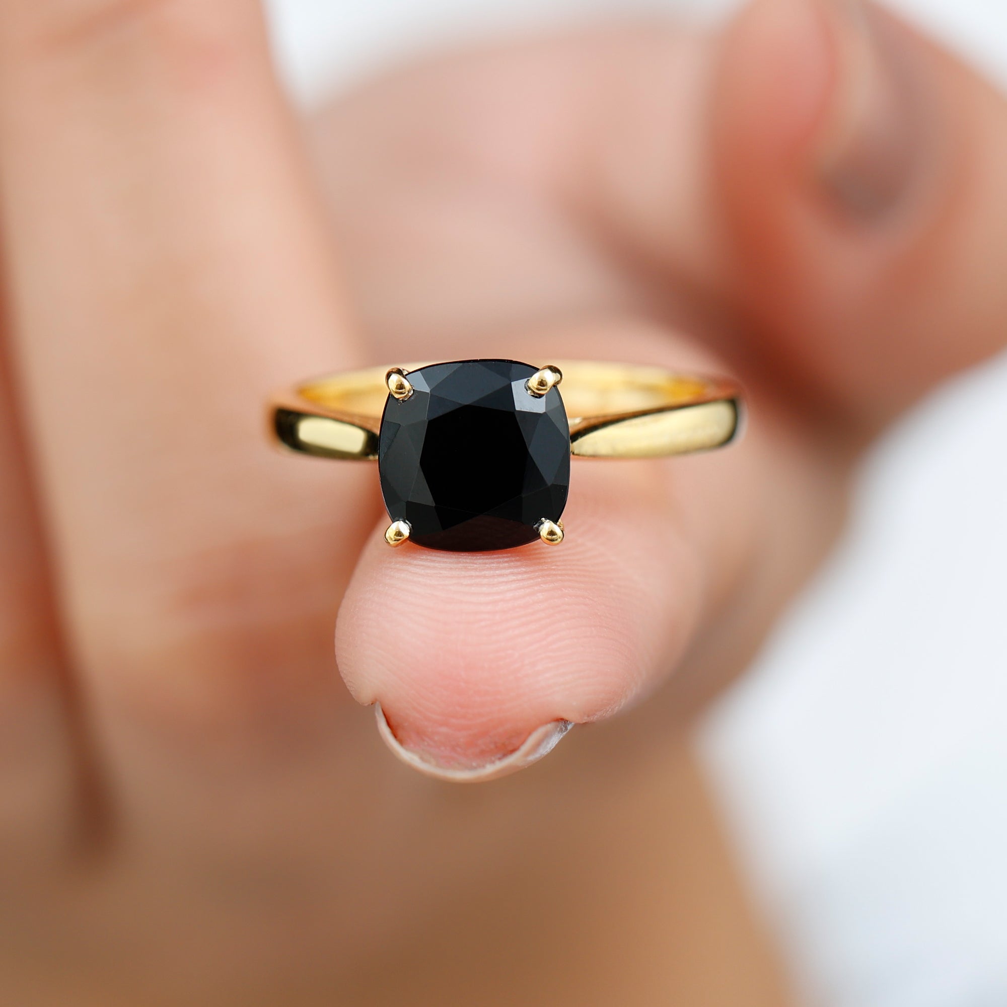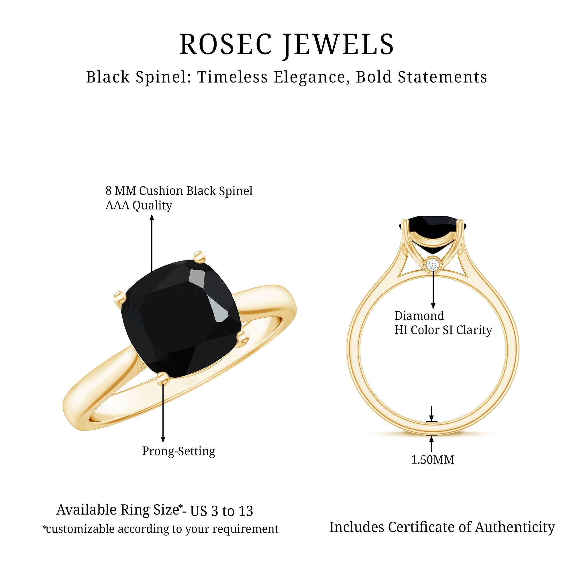 Designed beautifully for the special days of your life, this Black Spinel Solitaire Ring is adorned with a 8 MM Cushion Shape Black Spinel Solitaire in 4 prong setting. The Solitaire Ring crafted in Solid Gold has a beautiful Round Shape Diamond hidden on the shank in bezel setting.