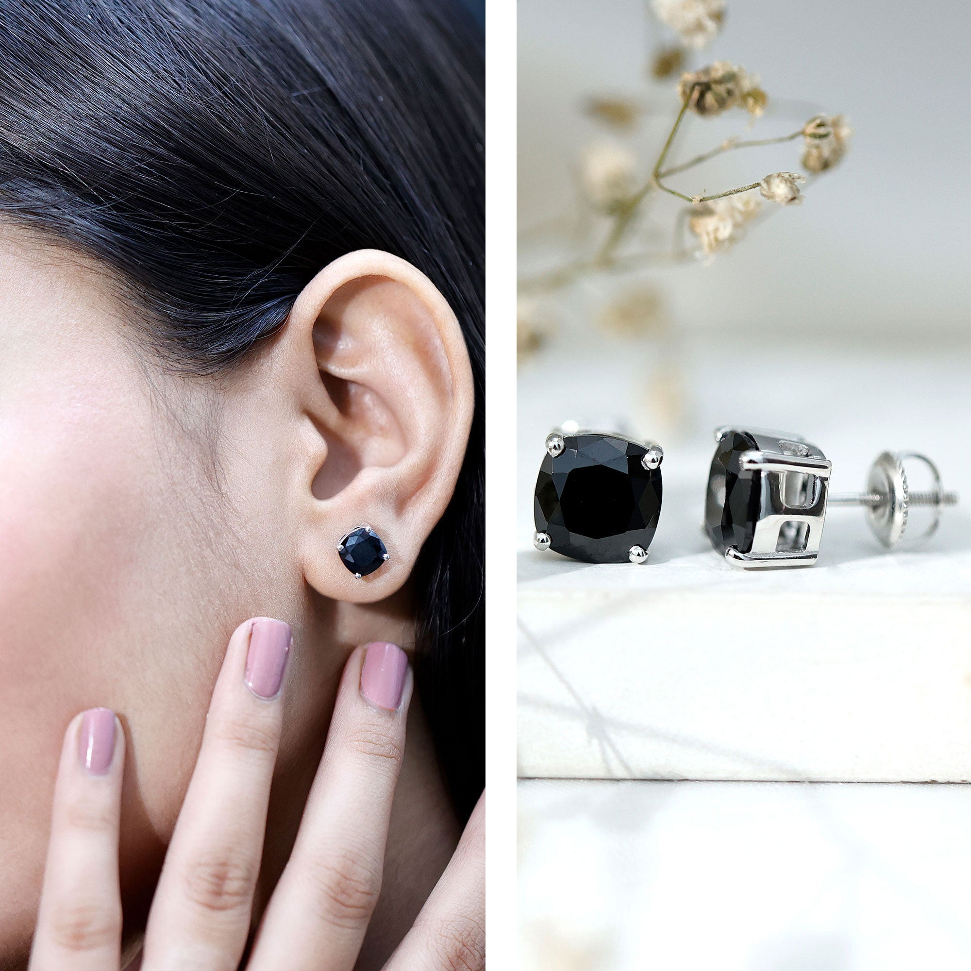 Indulge her with the enchanting allure of these Lab Created Black Diamond Stud Earrings. Adorned with a captivating Cushion Cut Created Black Diamond in a secure 4-prong setting, these earrings are a true expression of love. These Solitaire Stud Earrings are an exquisite symbol of affection. Surprise your beloved with this perfect gift, sure to make her fall in love all over again.