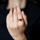 Capture attention with this elegant Solitaire Ring, showcasing a Round Cut Created Ruby delicately nestled in a secure 4 Prong Setting, embellished with a Simple Band. This dainty Red Gemstone Ring is designed to make her feel like royalty on her special Engagement Day.