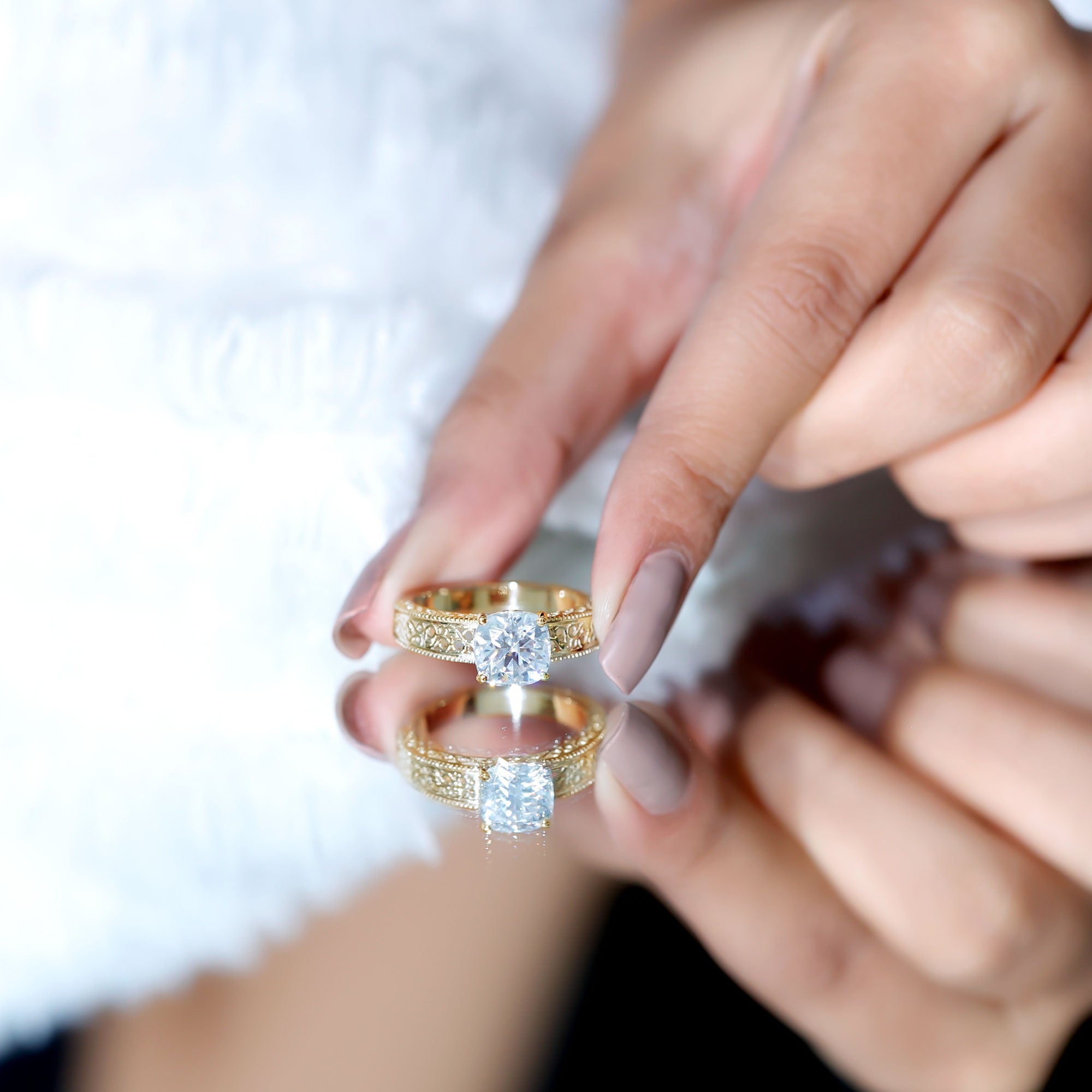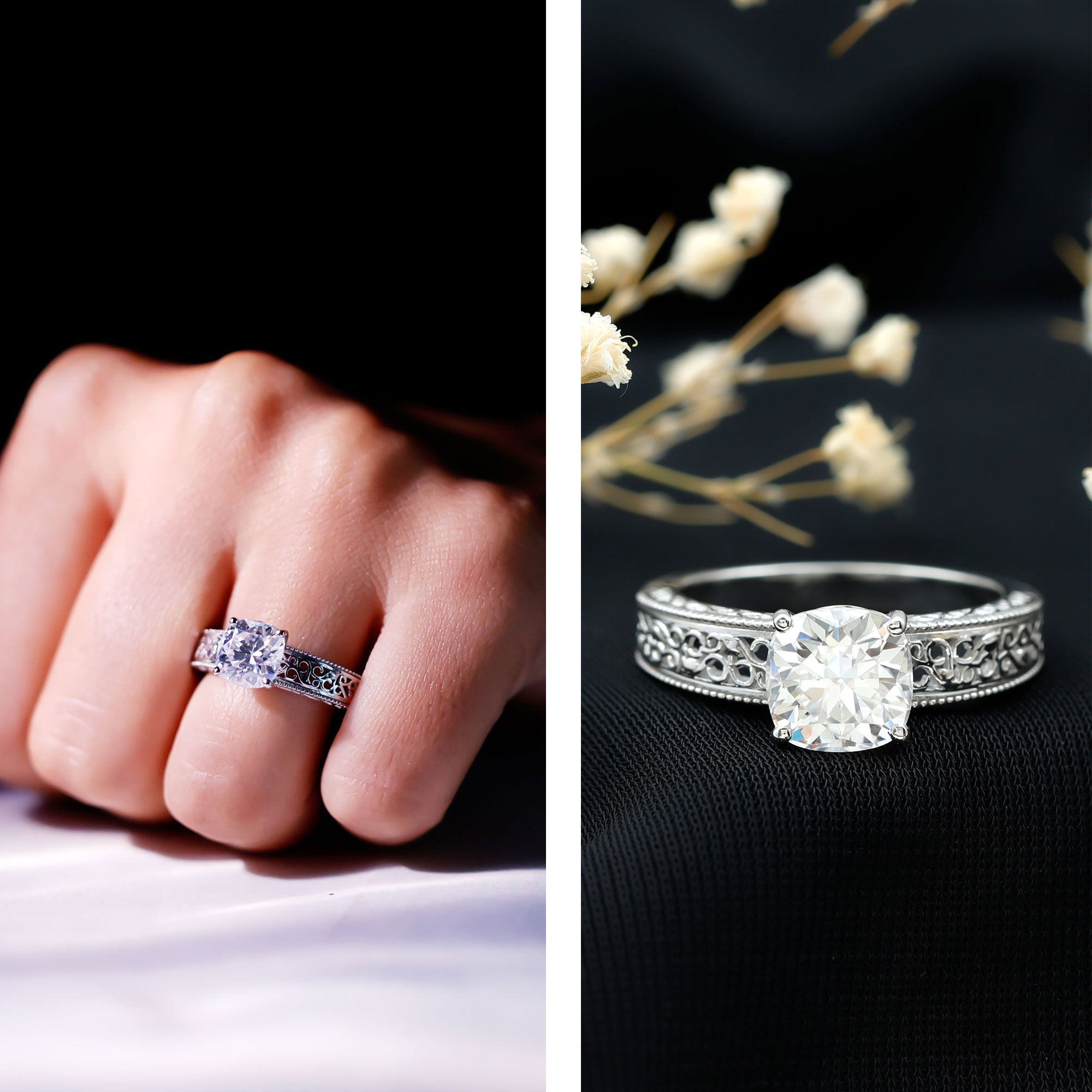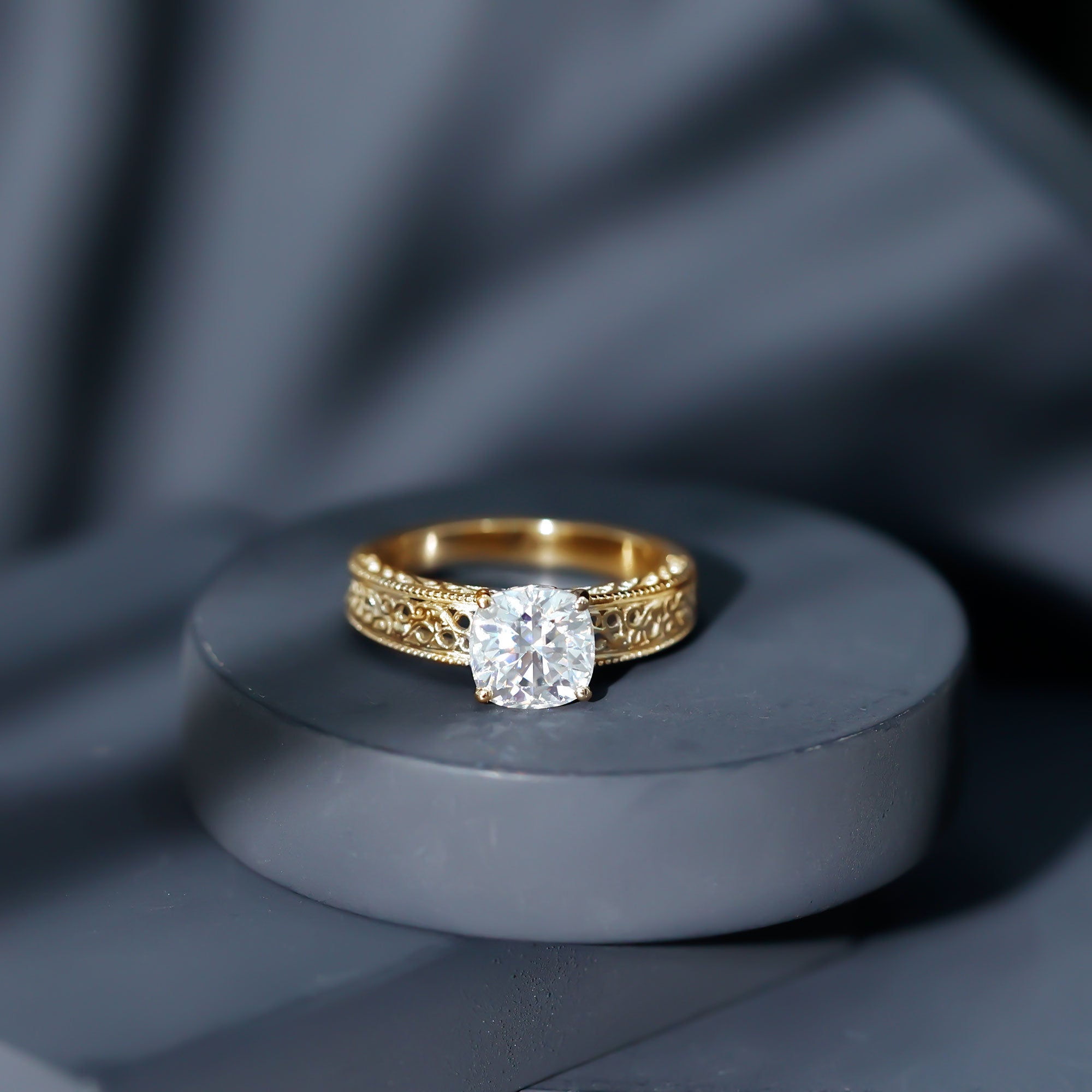 8 MM Cushion Cut Moissanite Engagement Ring with Filigree Details