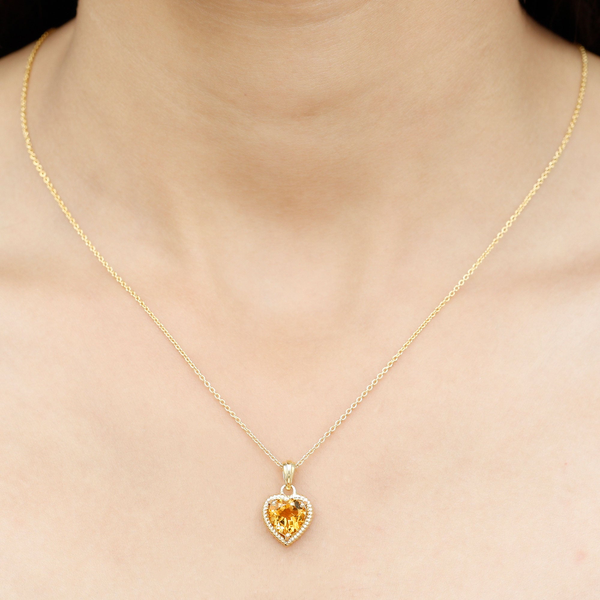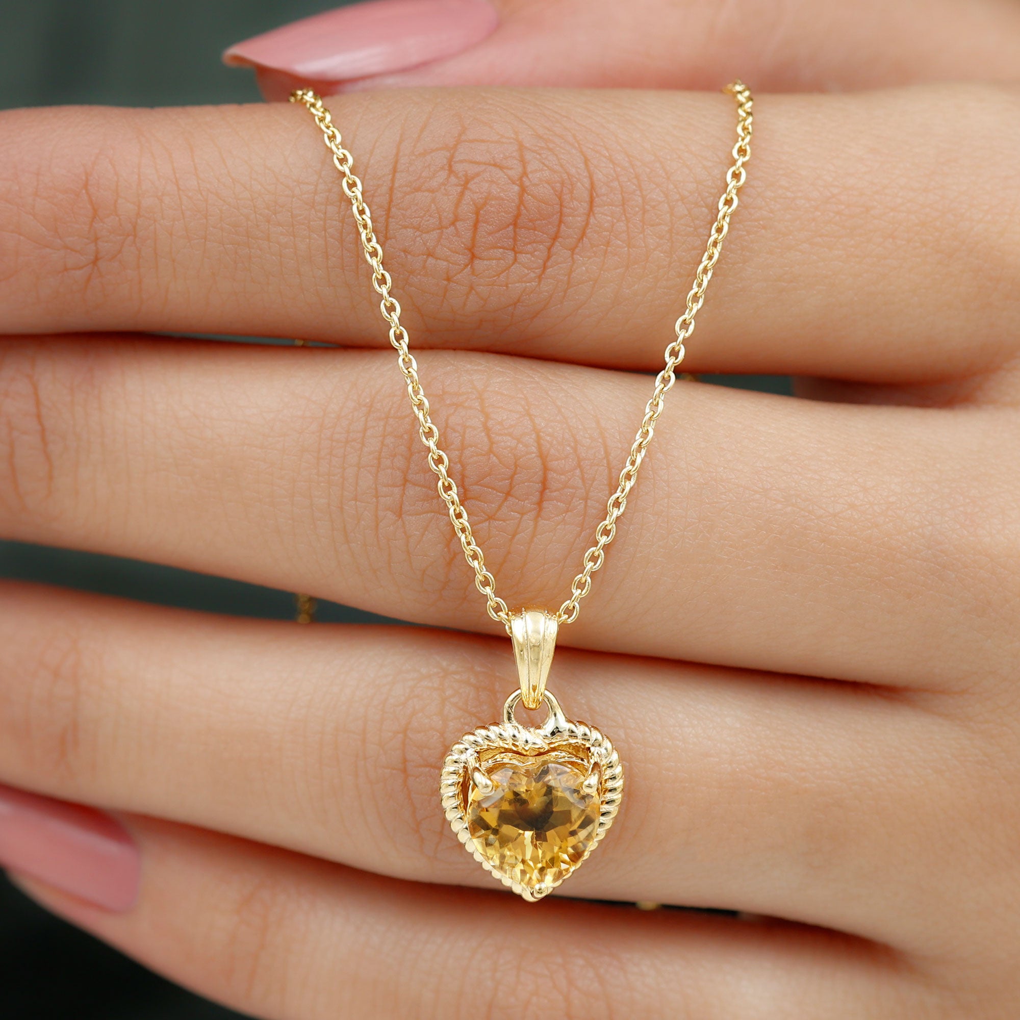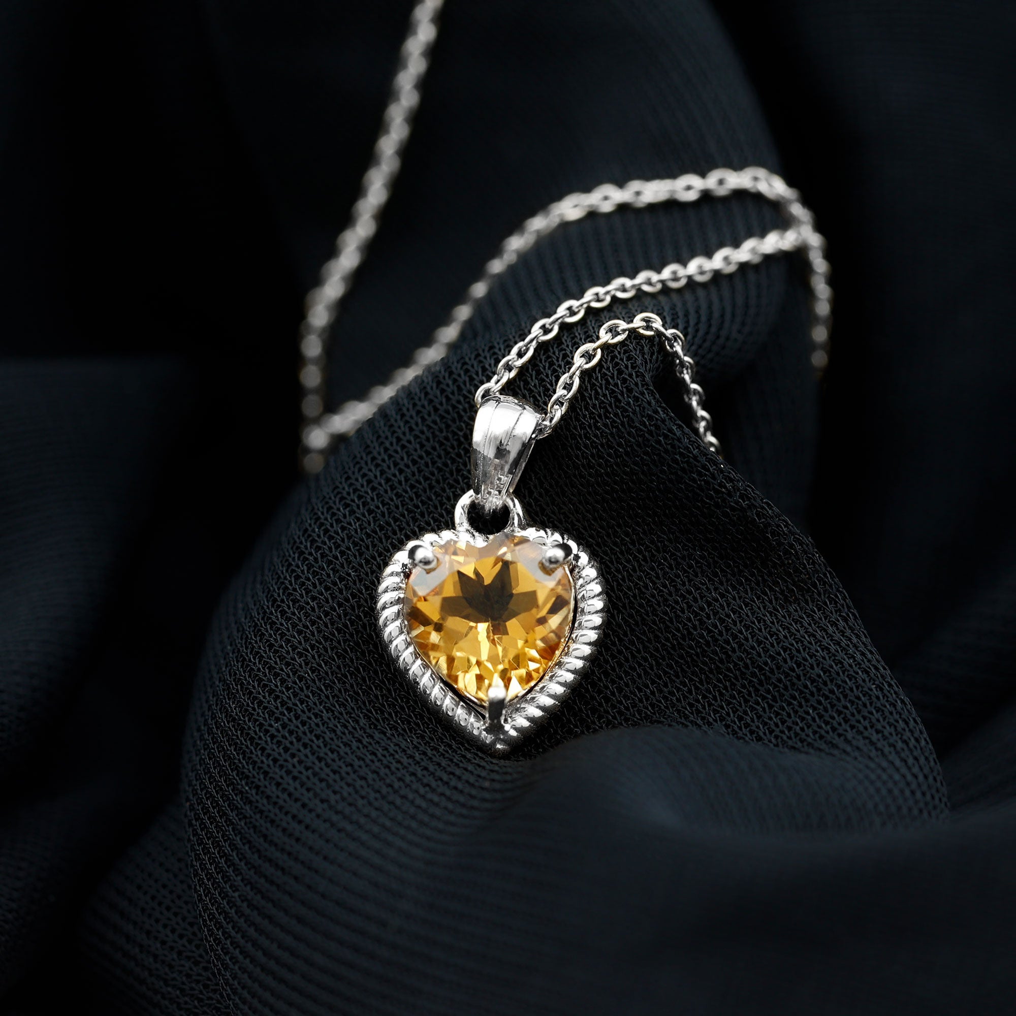 Behold the Citrine Solitaire Pendant, a radiant masterpiece embraced by a delicate Rope Frame. An 8 MM Heart Shape Citrine gemstone set in 3 Prong Setting shines with a warm, golden glow, exuding positivity and joy. Adorn your neckline with this unique creation, and let its beauty and elegance brighten your every day.