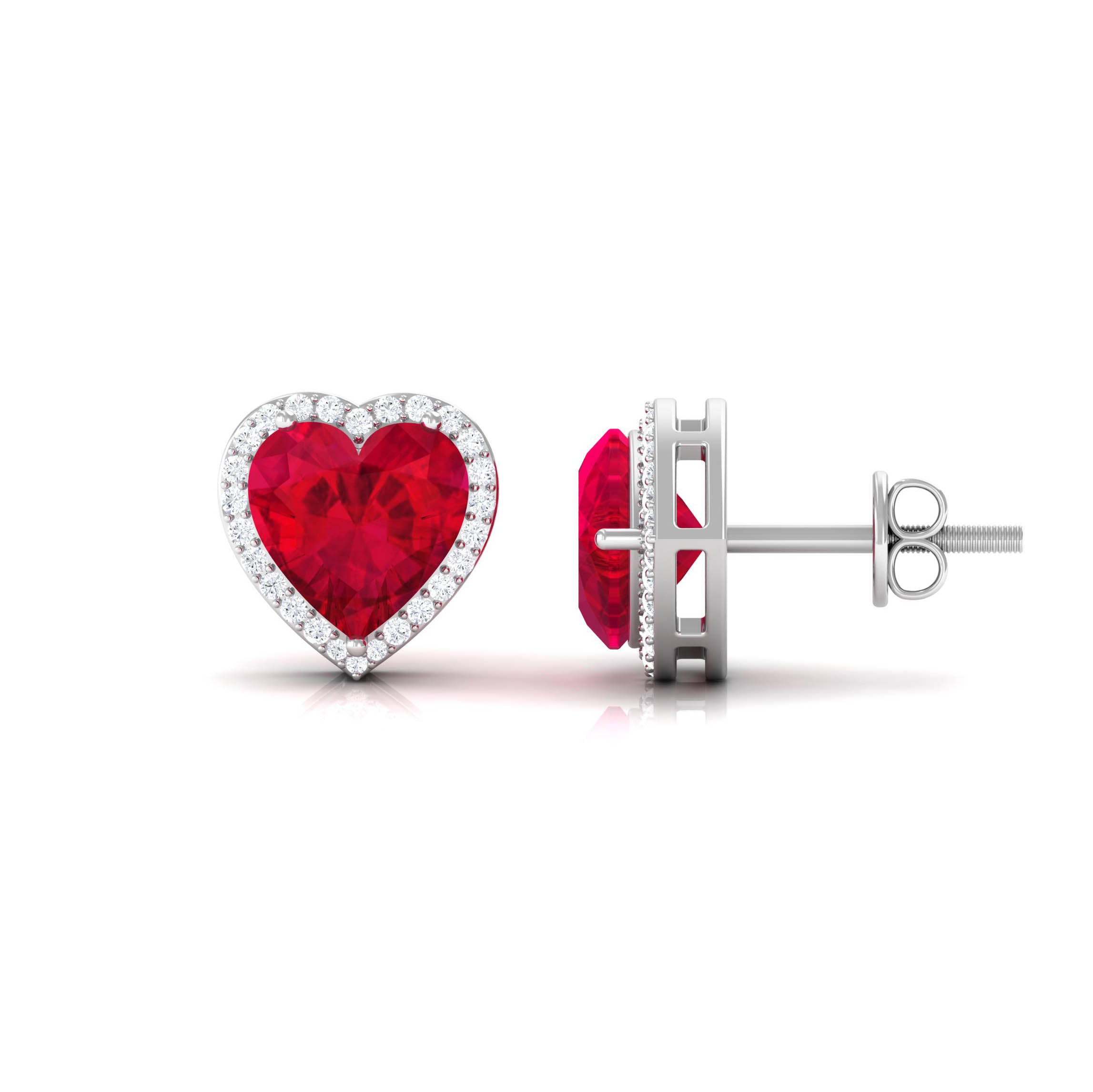 Enhance your style with these elegant Heart Earrings that effortlessly bring a pop of color to any outfit. These Halo Stud Earrings feature a sleek and minimalist design, adorned with a captivating Heart Shape Lab Created Ruby at the center. The vibrant red gemstone is beautifully complemented by a halo of dazzling Round Diamond, adding a touch of sparkle to the overall look. With secure screw backs, these Heart Stud Earrings ensure a comfortable and worry-free wearing experience. Surprise your loved one on their birthday with these mesmerizing Created Ruby Earrings, and witness the priceless smile that lights up their face.