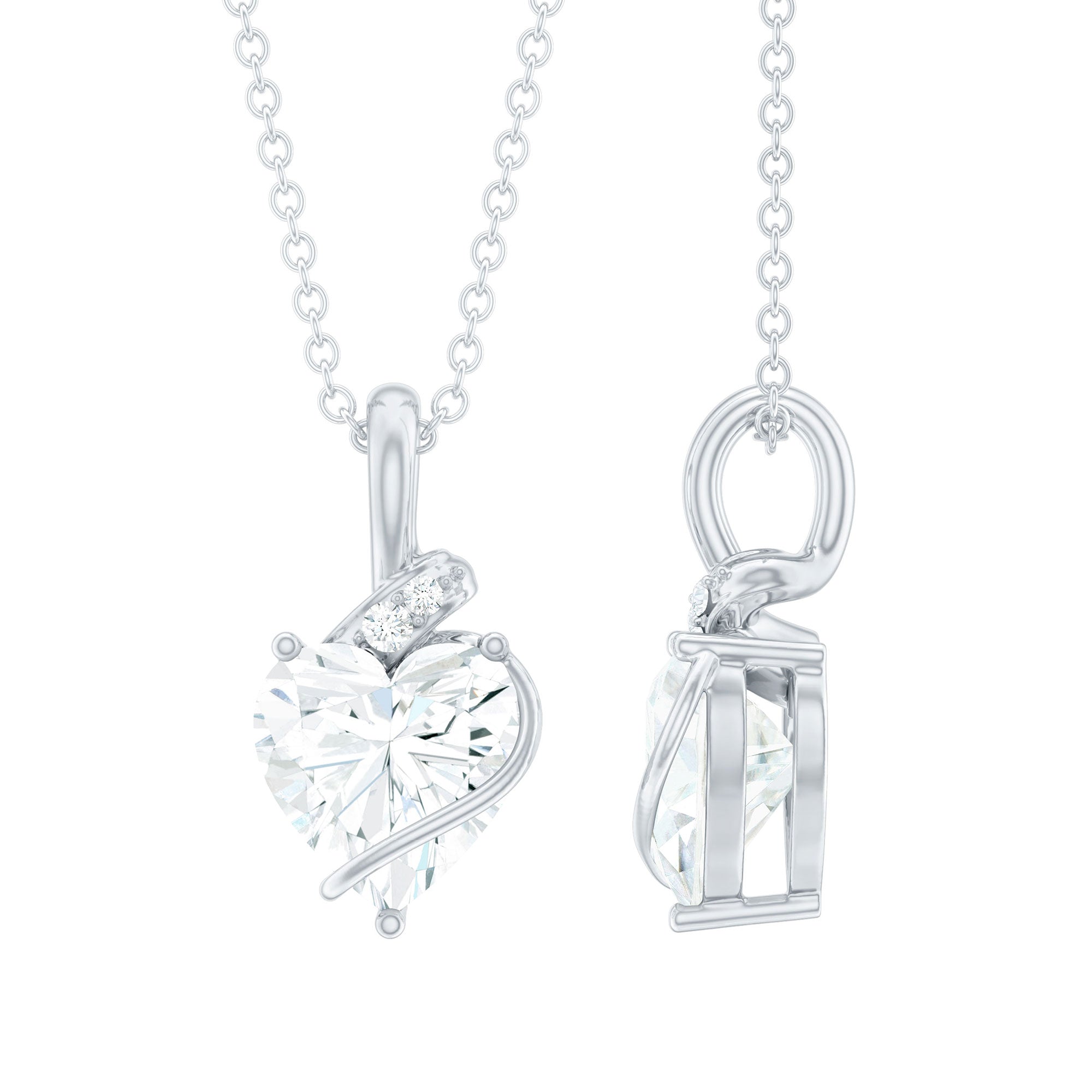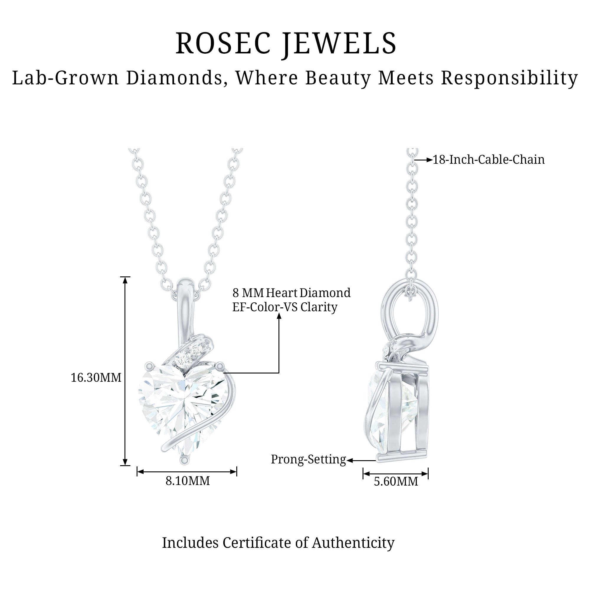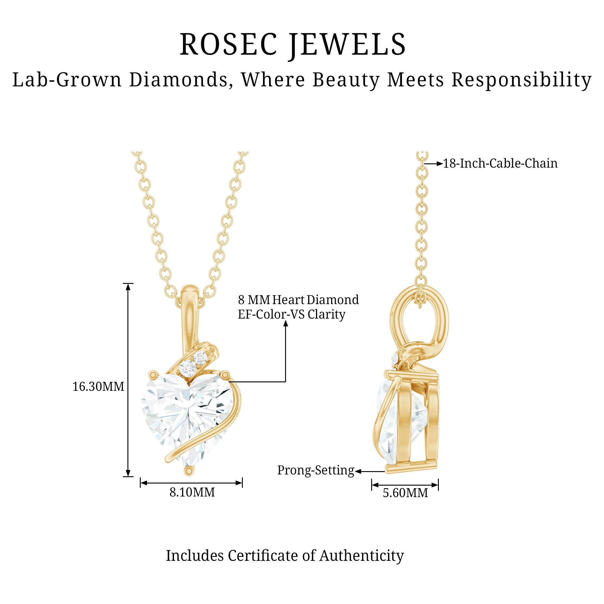 Surprise her by gifting this stunning Lab Grown Diamond Pendant Necklace. This charming Solitaire Pendant is sure to captivate her with its refined beauty, featuring an 8 MM heart-shaped lab-grown diamond elegantly set in prong setting, complemented by two small round diamonds positioned above the heart. Crafted with EF-VS quality diamonds, radiating sophistication and allure. This Diamond Heart Necklace is presented in a luxurious box that can be used for storage when not worn, and it comes in a variety of metal colors and purity options. Experience ethical luxury with Rosec Jewels, a name that stands for exceptional craftsmanship and innovation.