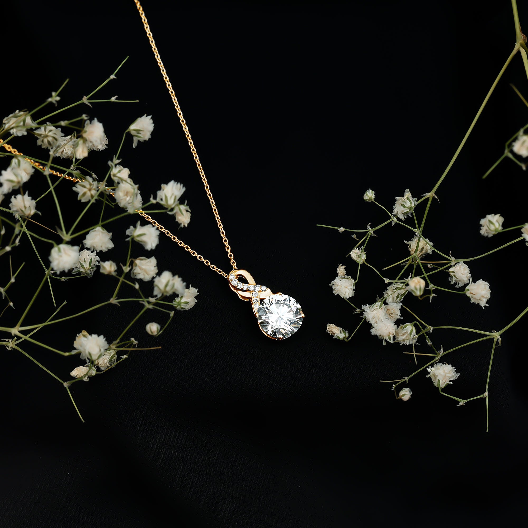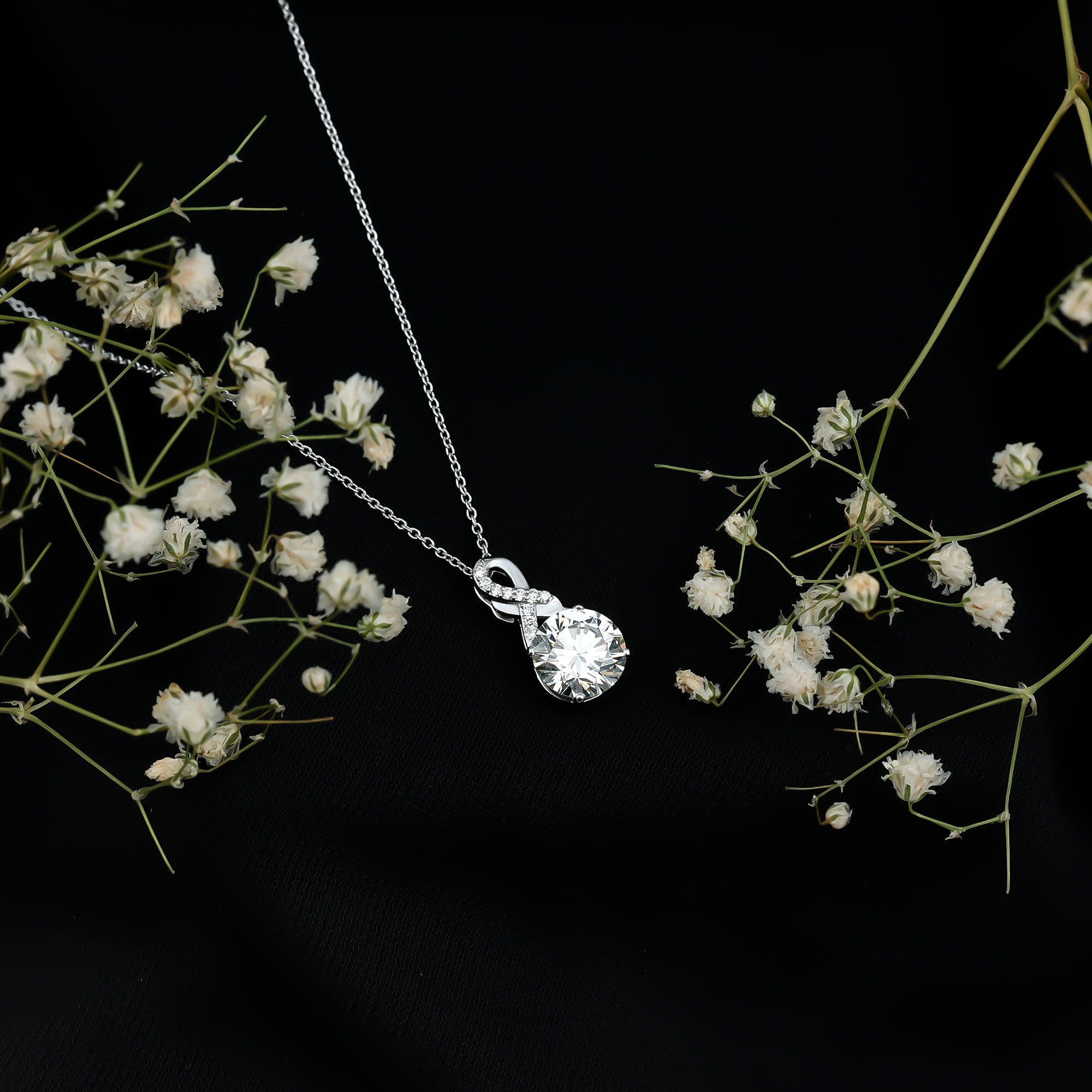 Make yourself the talk of the town with this Diamond Infinity Necklace. Handcrafted with care, this Solitaire Pendant features a sleek, vertical infinity sign encrusted with small diamonds and skillfully designed with high-quality metal. An 8 MM round cut diamond (lab grown) is set in prong setting at the bottom of the Infinity Sign Necklace. Our Diamond Pendant Necklace is a symbol of forever love, perfect for gifting on special occasions such as Valentines Day, Anniversaries, Birthdays, New Year, Christmas, and many more.