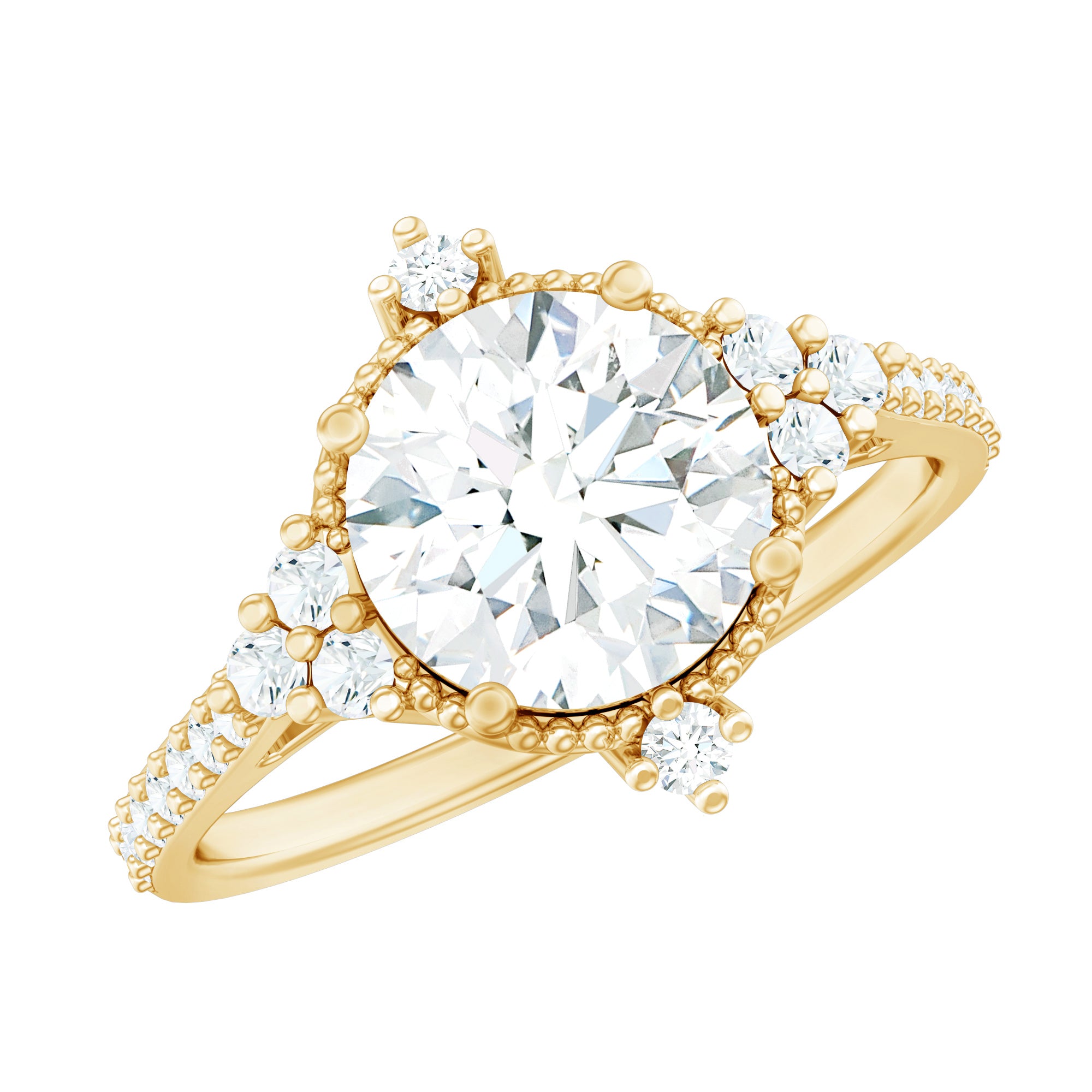 This Vintage Style Engagement Ring features a classic design, making it the perfect Statement Ring for brides who appreciate ethically crafted jewelry. An intricate halo of fine bead work and diamond accent frames a certified 8 MM round shaped EF-VS quality diamond, set in a secure prong setting. The band is encrusted with smaller stones, including a touch of extra brilliance. Additionally, this Lab Grown Diamond Engagement Ring is available in a variety of metal colors and ring size options. If you are looking for something unique, timeless, and full of sparkle, this is the perfect ring to celebrate your love.
