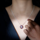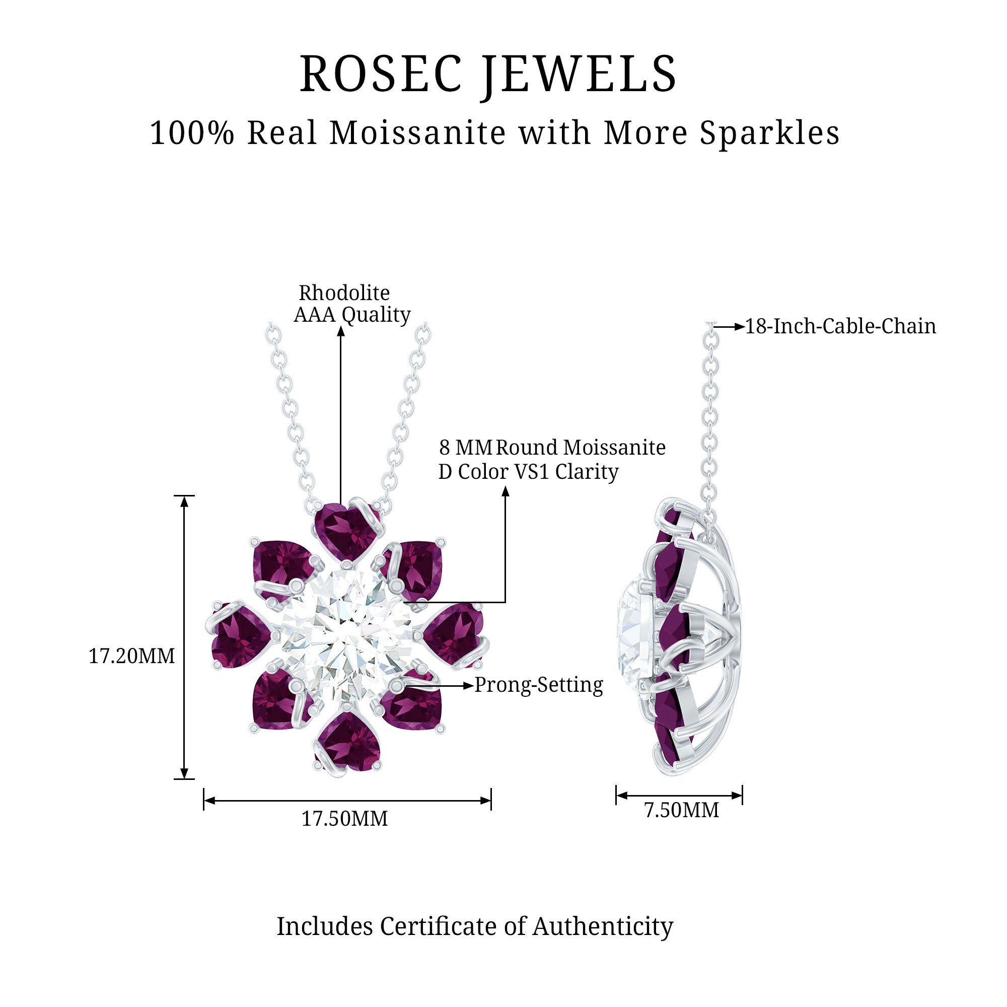 Adorn your neckline with this Moissanite Rhodolite Pendant that exudes a deep red hue with shimmer. The pendant features an 8 MM Round Shape Moissanite and is encircled by Heart Shape Rhodolite embedded in White Gold Plated Silver. This Flower Pendant beholds the classic shine of D-VS1 Quality Moissanite and AAA Quality Rhodolite. The pendant dangles with a cable chain that can be adjusted according to your style and makes it beautifully sit on the neckline. This Designer Necklace will be delivered to you in a velvet pouch with the certificate of authenticity.