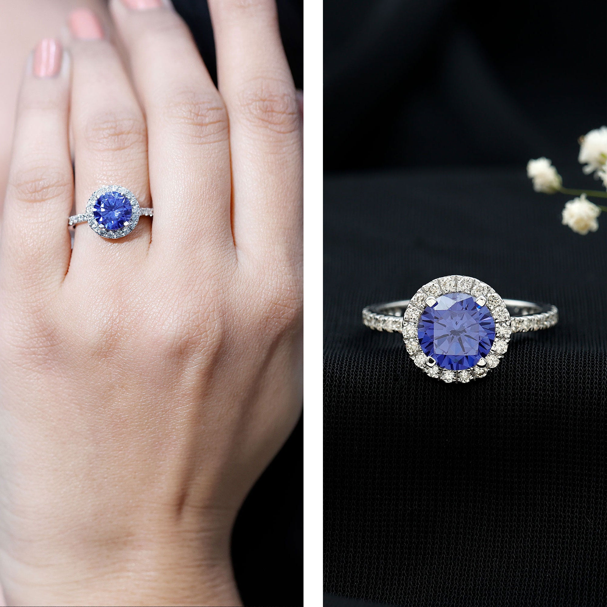 8 mm Round Lab Created Blue Sapphire Classic Engagement Ring with Diamond Halo