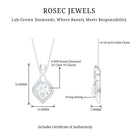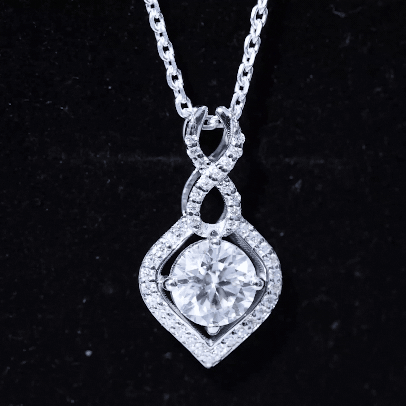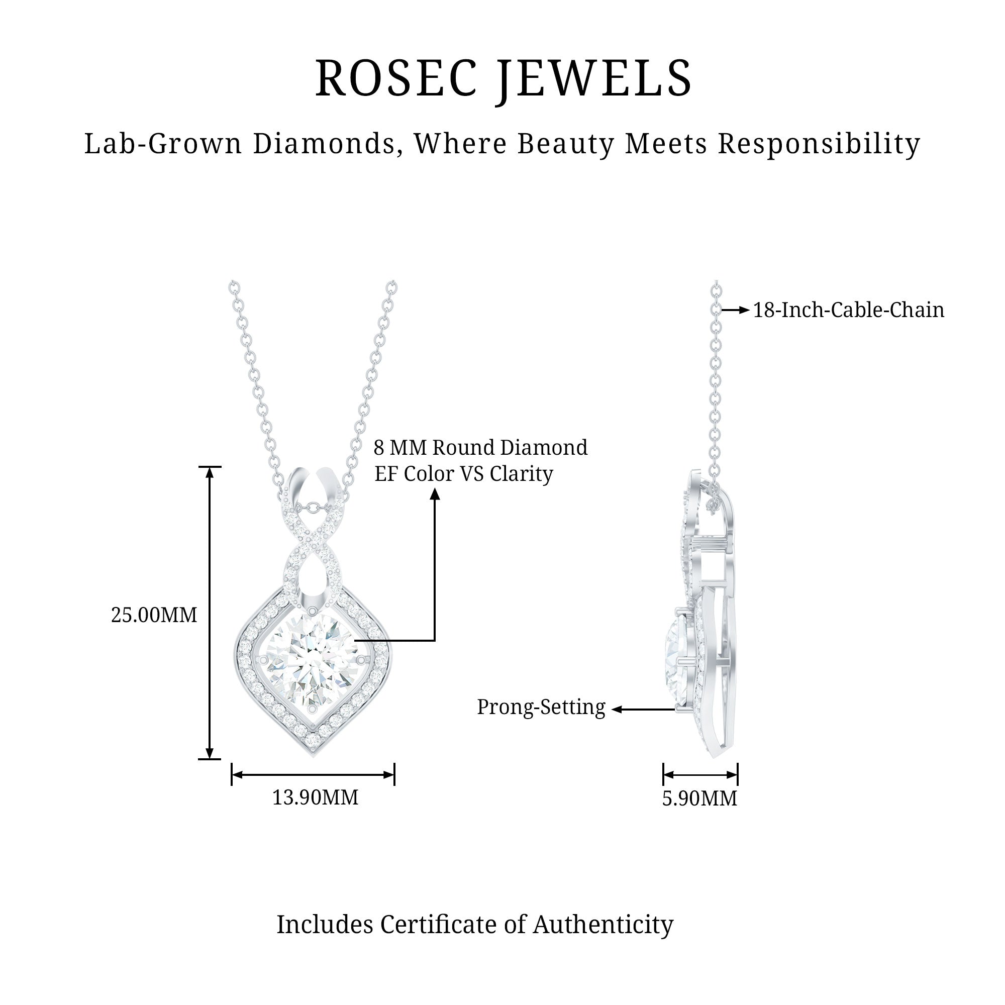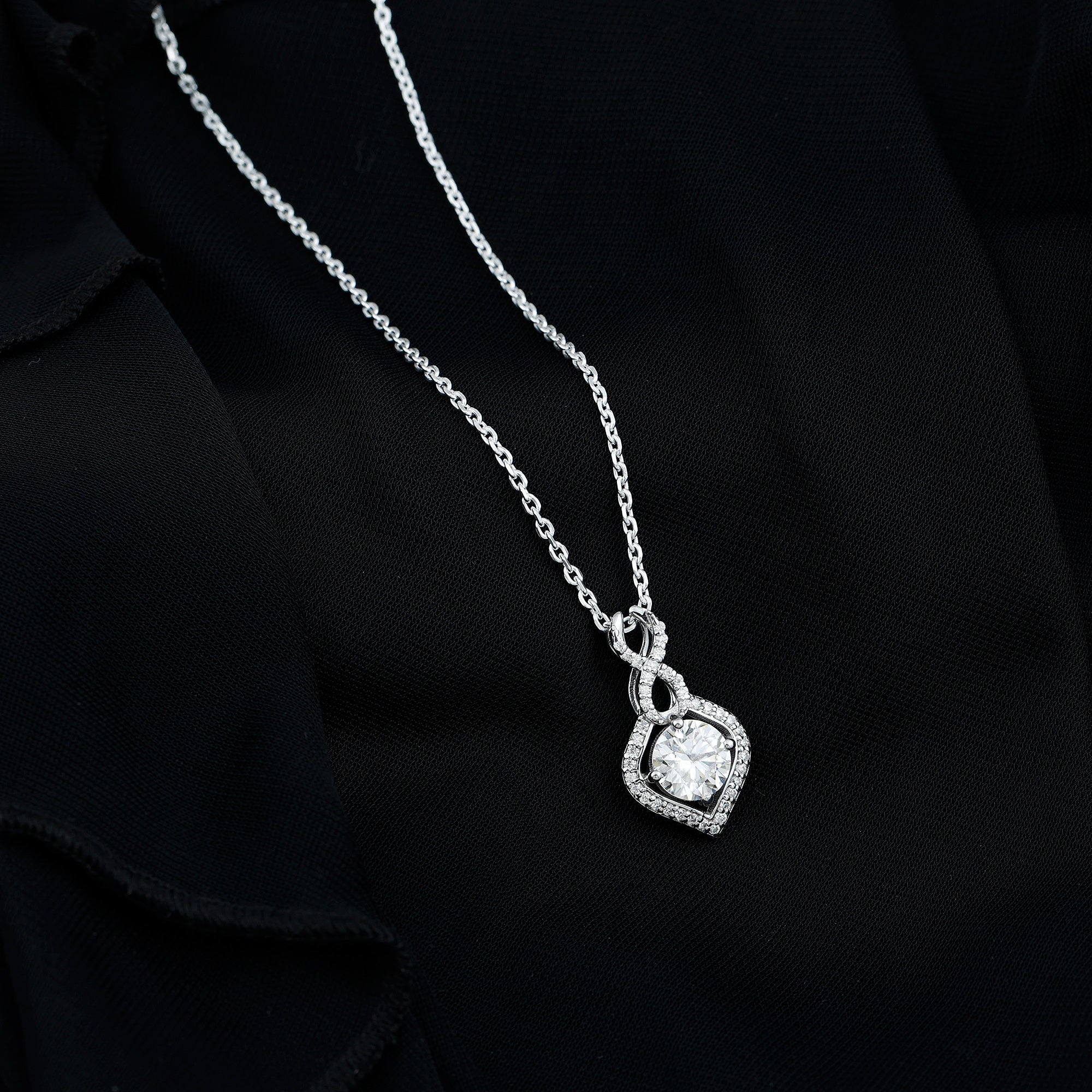 Handcrafted with top-notch metal, this Diamond Infinity Pendant Necklace is a breathtaking representation of everlasting love and elegance. The infinity symbol at the top is shaped with smooth curves and decorated with sparkling gemstones. An 8 MM round cut lab grown diamond of EF-VS Quality is set in prong setting at the bottom and surrounded with smaller stones. This Art Deco Necklace comes with a certificate of authenticity and is presented in a premium-quality signature jewelry box. It makes a heartfelt gift for anniversaries, birthdays, Valentines Day or just to remind someone special that your love for them knows no limits. Designed by Rosec Jewels, this Diamond Pendant Necklace is more than just jewelry, it is a promise of forever.