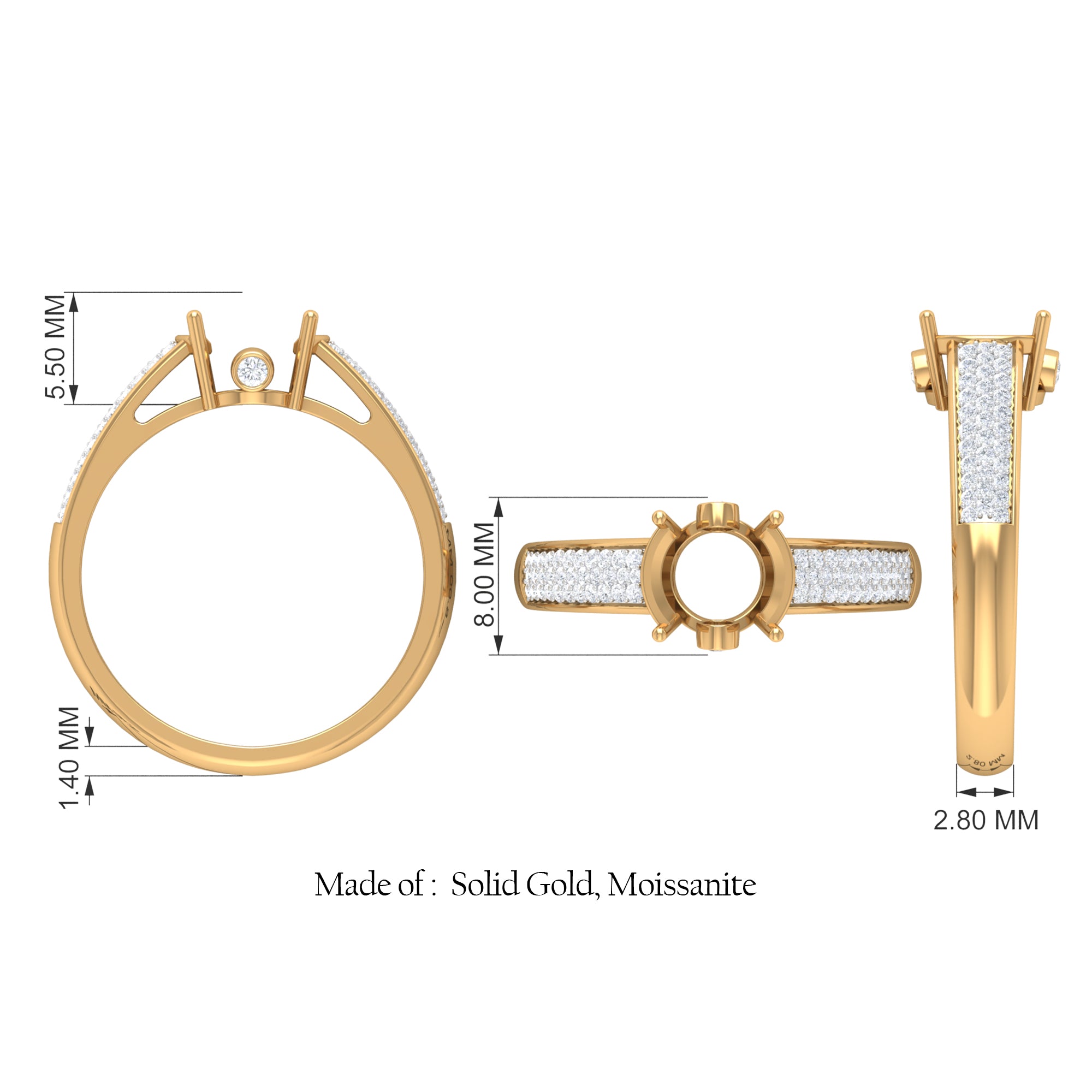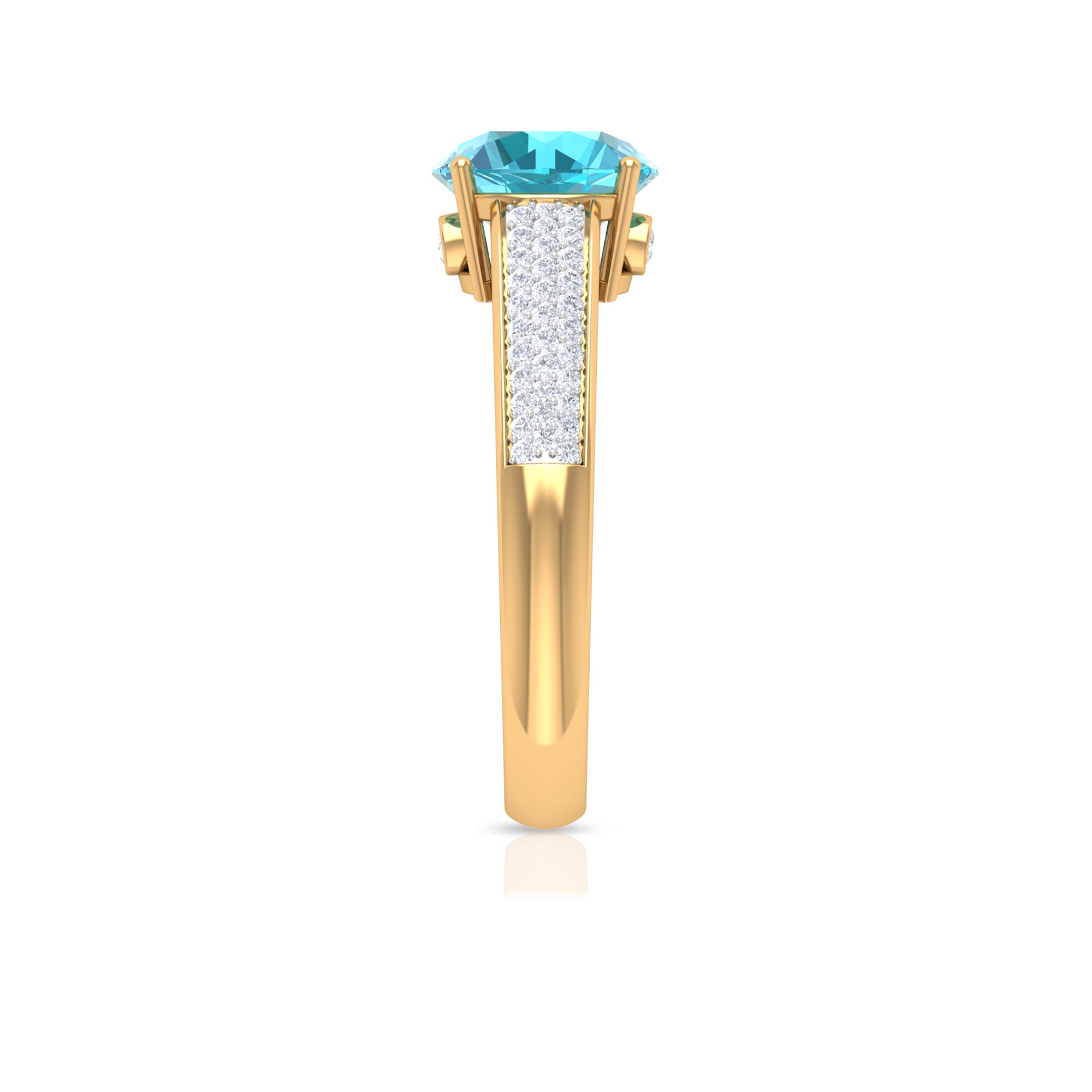 This dazzling Solitaire Ring will certainly mesmerize your lady love. This lovely ring features Round Shape Swiss Blue Topaz Gemstone set as a Solitaire in Prong Setting and also decorated with Pave Set and Surprise Diamond and crafted in Gold Metal.