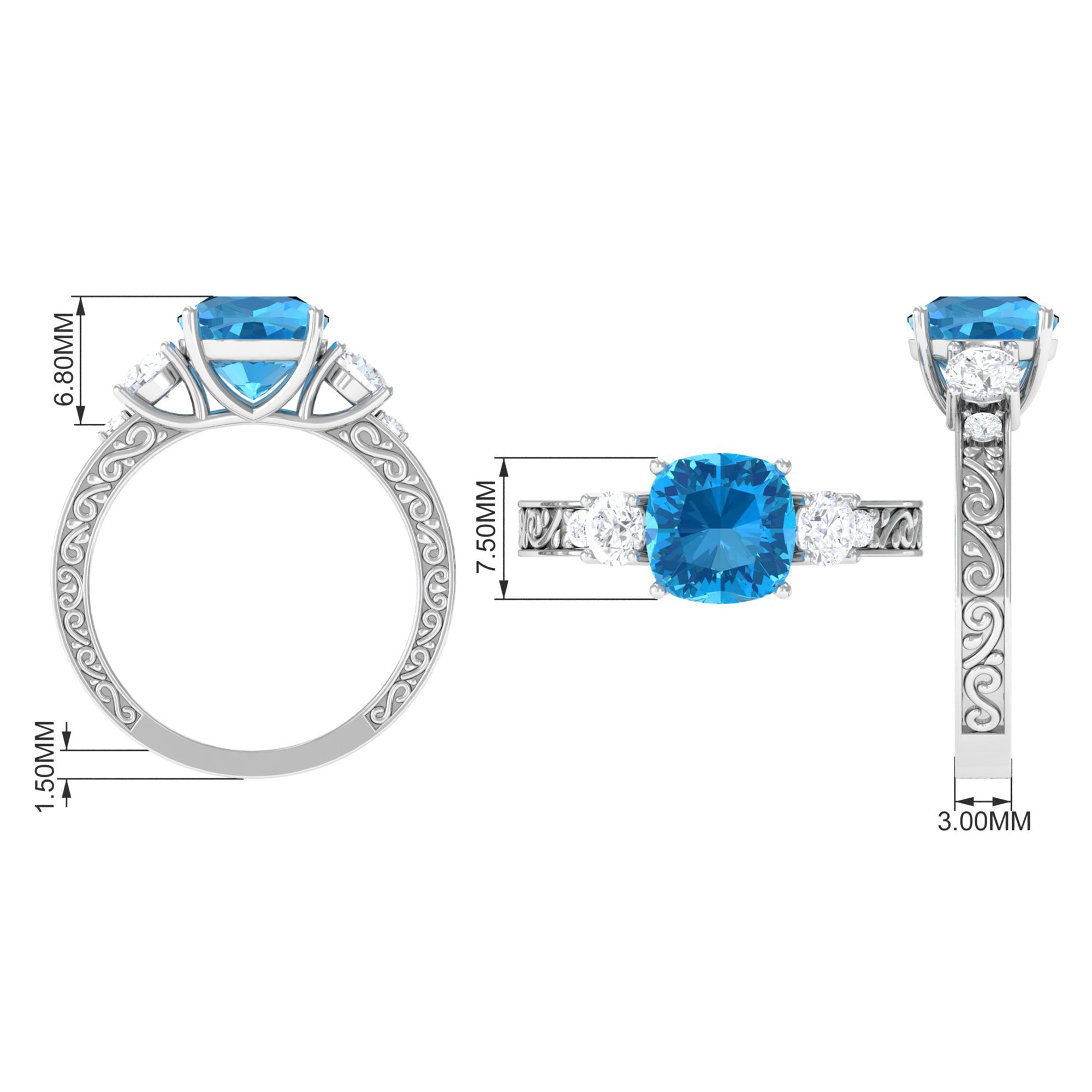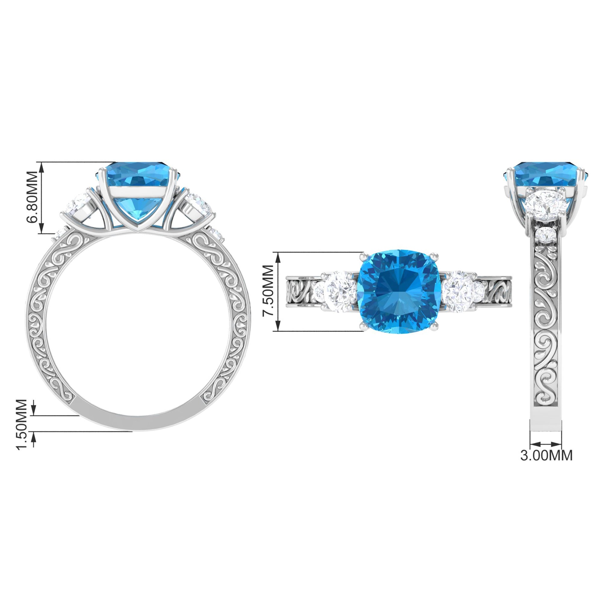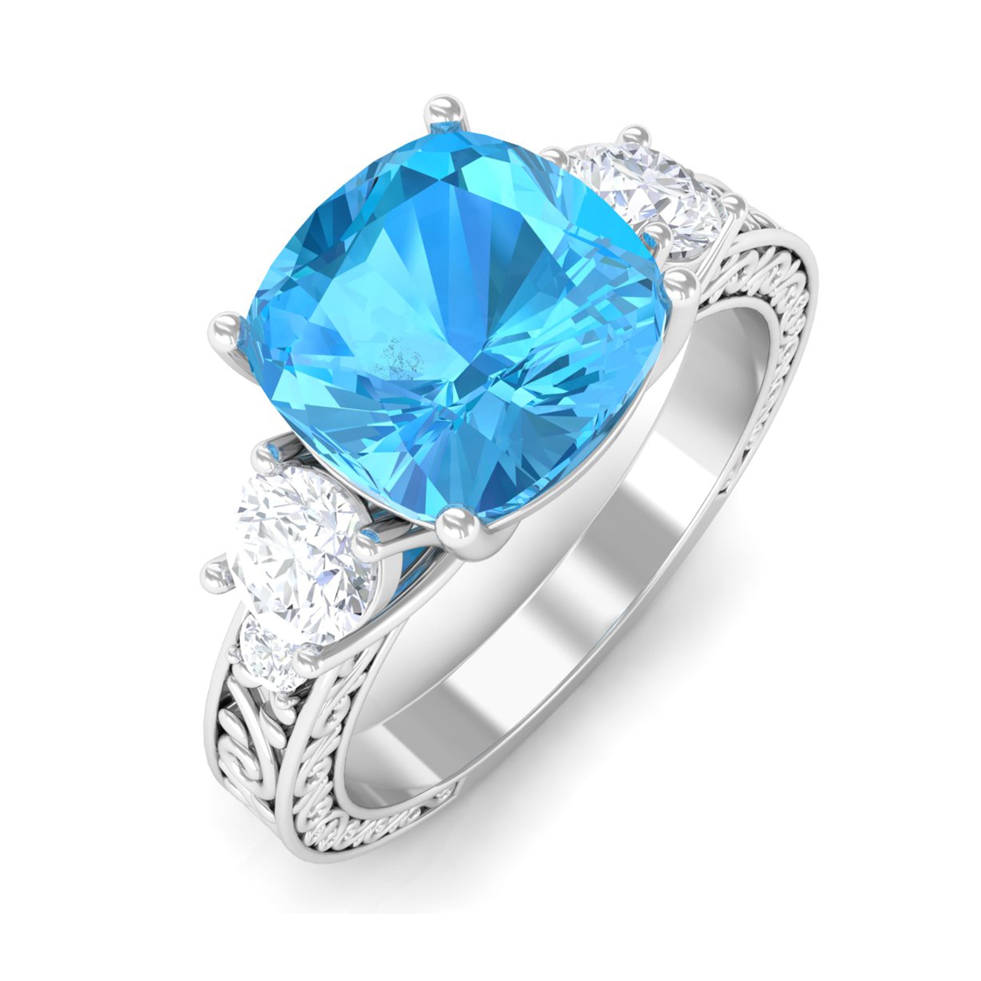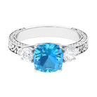 8 MM Three Stone Cushion Cut Swiss Blue Topaz Solitaire with Moissanite Engagement Ring