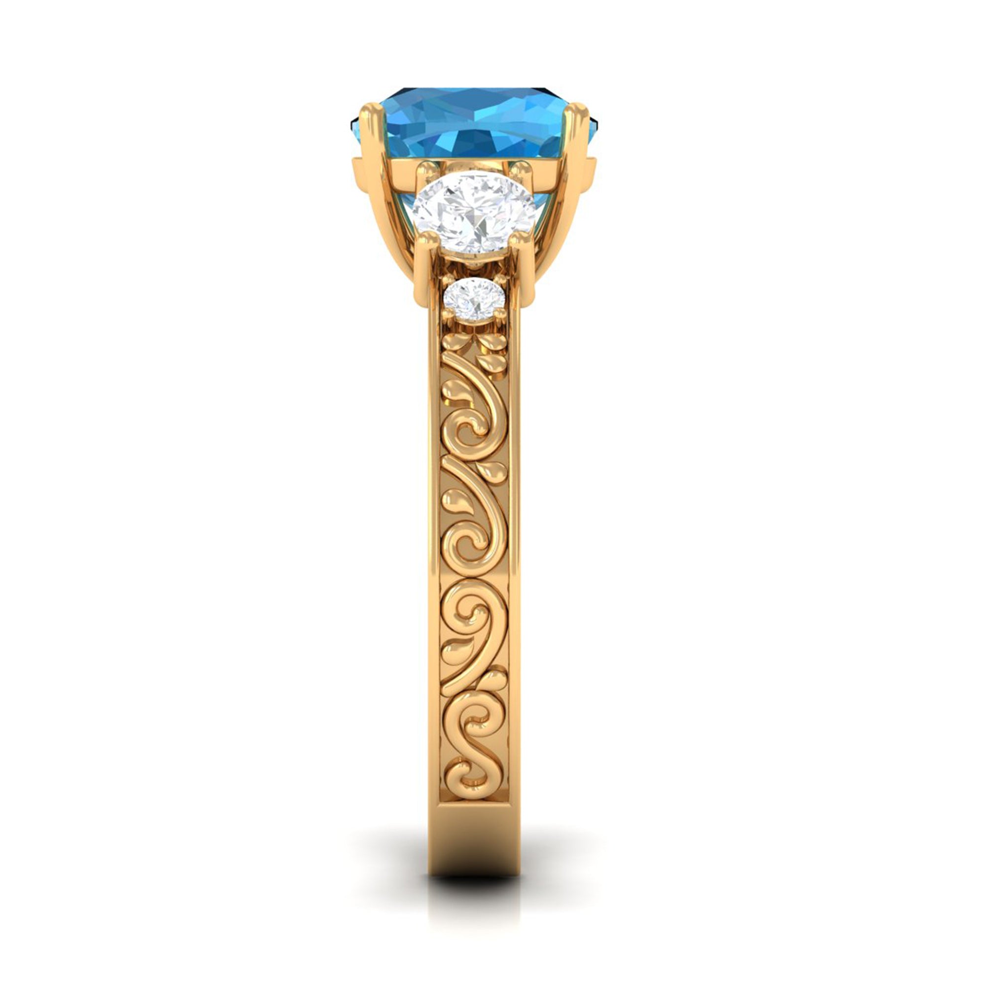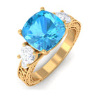 It is a Vintage Three Stone Ring for Women, set in Gold and features a Cushion Cut Swiss Blue Topaz embellished in Prong Setting with Round Brilliant Moissanite embellished in Prong Setting.