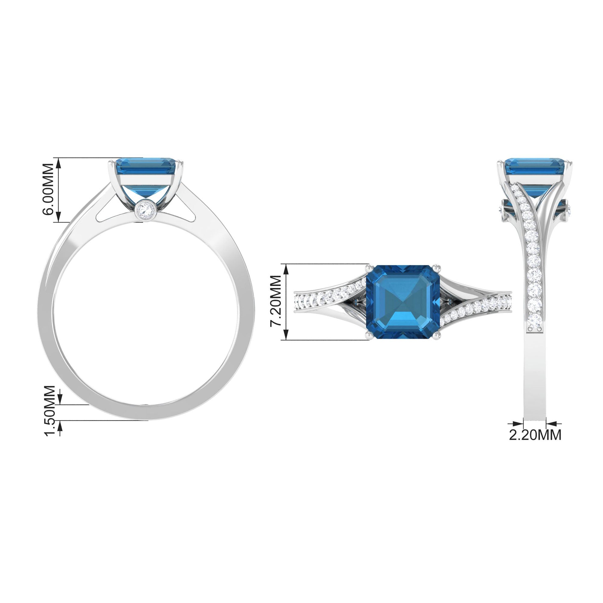 Capture attention with a ring that redefines sophistication. This London Blue Topaz Ring is crafted to dazzle and capture your heart. Featuring a breathtaking 8 mm Asscher Cut London Blue Topaz as the focal point in a Prong Setting, it represents drama, elegance, and brilliance. Set on a modern Split Shank Band adorned with shimmering Diamond stones, the design creates a striking frame that feels both contemporary and timeless. As a hidden surprise, tiny HI-SI quality diamonds are tucked just beneath the main gem. Constructed with Authentically Certified Gemstones, this Designer Engagement Ring provides clarity and radiance that are difficult to ignore, as love deserves nothing less than extraordinary. Elegantly presented in a refined jewelry box, this Asscher Cut Engagement Ring is ideal not only for proposals but also for anniversaries, milestones, and those unforgettable moments. Available in US sizes 3 to 13, this London Blue Topaz Engagement Ring is designed to complement every love story and every hand that proudly wears it. From every angle, this Split Shank Engagement Ring is a masterpiece that radiates beauty, confidence, and purpose. So go ahead, make a bold statement, celebrate your journey, and let this exquisite piece serve as a daily reminder of your unique love.