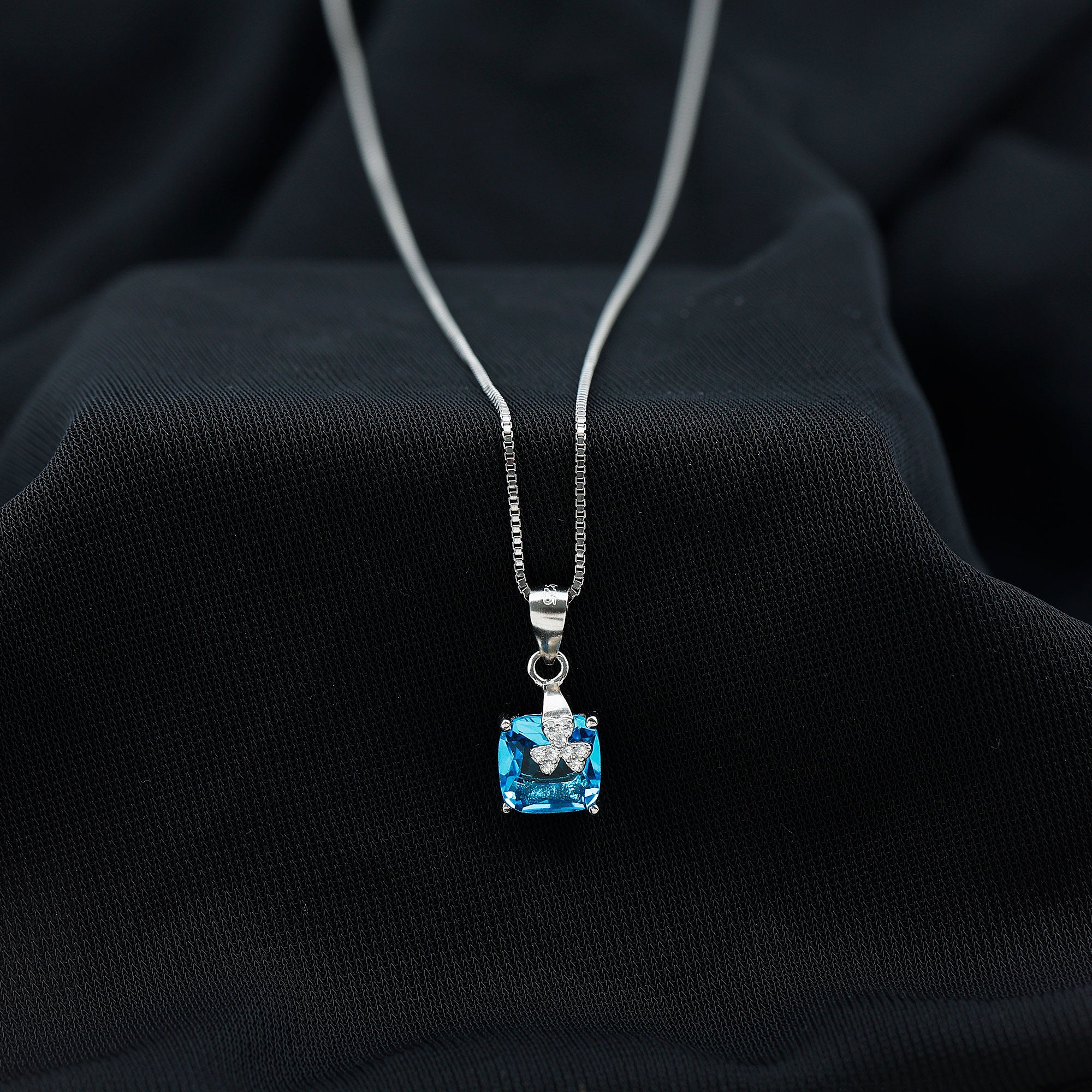 Elevate your daily look with this Blue Zircon Necklace and grab everyones attention. Inspired by the timeless beauty of nature, this Pendant Necklace features an 8 MM Cushion Cut Blue Zircon as its centerpiece, beautifully set in Prong Setting with a charming little flower design overlapping the main gem, adorned with simulated diamonds. Crafted from 14k White Gold Plated Silver and suspended from a delicate chain, this Blue Gemstone Necklace will effortlessly elevate any outfit. With its understated elegance, this Solitaire Pendant Necklace with Chain perfectly showcases your individual style. The rich blue color of the AAAA quality Blue Zircon exudes sophistication and charm, making it an ideal accessory for any event. This Unique Blue Stone Necklace is perfect for everyday wear and also serves as a chic statement piece for cocktail parties, a thoughtful gift for birthdays, anniversaries, or Valentines Day for that special someone, or even as a stunning addition to your wedding day look for a striking contrast.