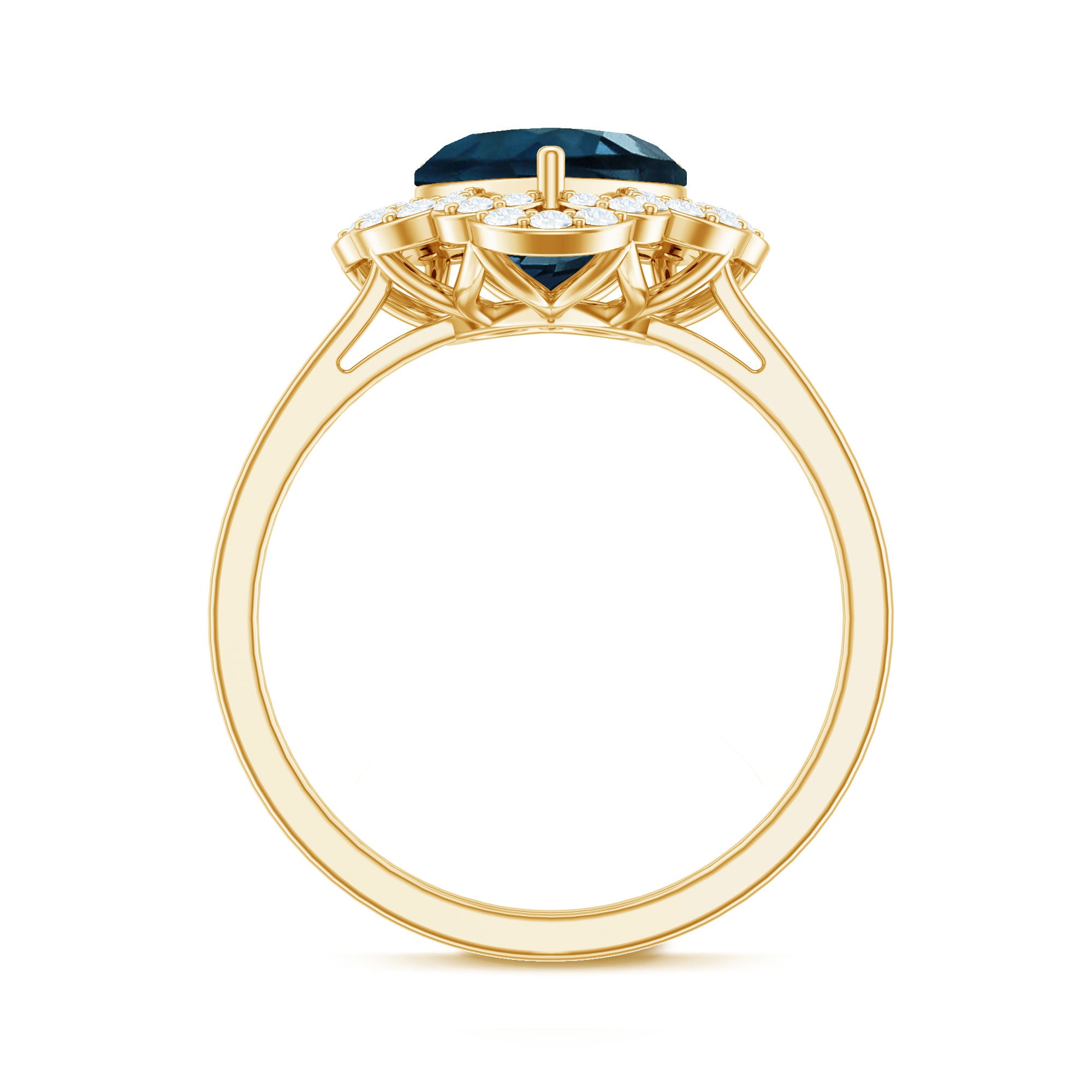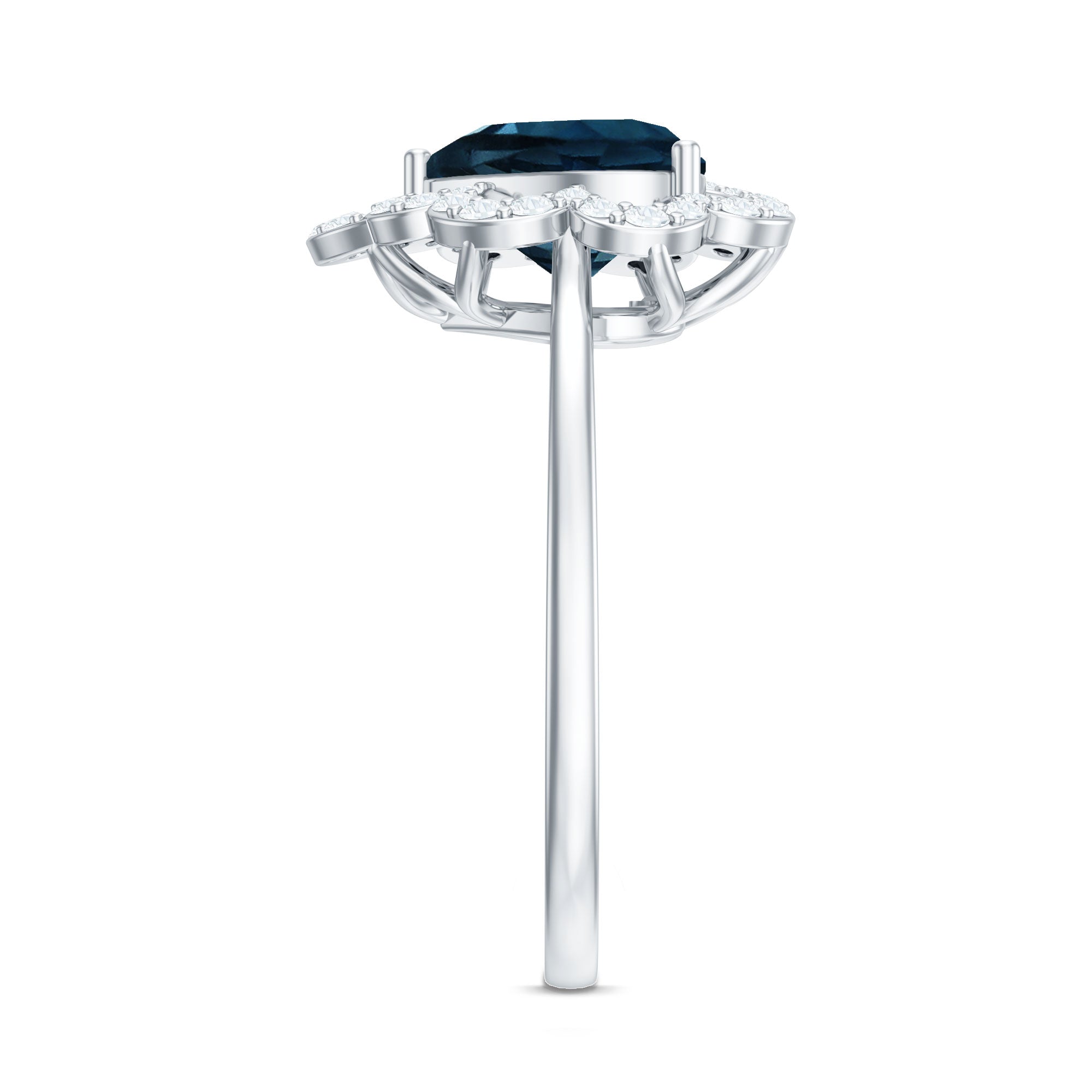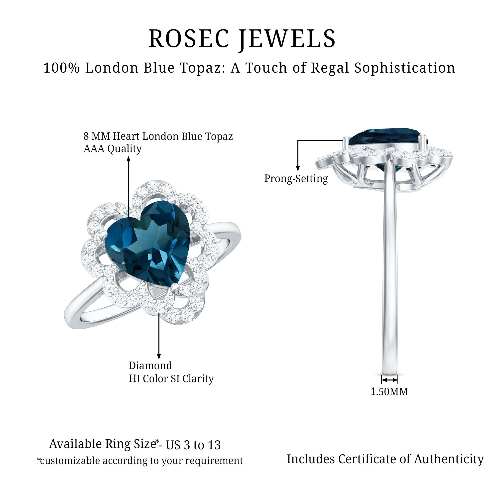 Express your feelings sincerely with this exquisite Heart Shaped Engagement Ring, crafted for unforgettable moments. At its core lies an 8 MM heart shaped London Blue Topaz, securely held in a prong setting. A dazzling diamond halo accentuating the central stone, providing the perfect touch of brilliance while preserving the topaz natural beauty. This London Blue Topaz and Diamond Engagement Ring is an ideal selection for someone who appreciates classic designs with a contemporary flair. Whether you are preparing to propose or simply wish to present her with a ring that conveys your deep affection, this London Blue Topaz Heart Ring offers a charming blend of beauty and significance. It is suitable for special occasions and enough to commemorate a significant occasion. The heart shape embodies love, commitment, and a shared future. Crafted with AAA quality london blue topaz and HI-SI quality diamonds, along with meticulous attention to detail, this Heart Engagement Ring transcends mere jewelry; it is a part of your narrative. It arrives beautifully packaged in a lovely jewelry box, ready for gifting or that memorable YES moment.