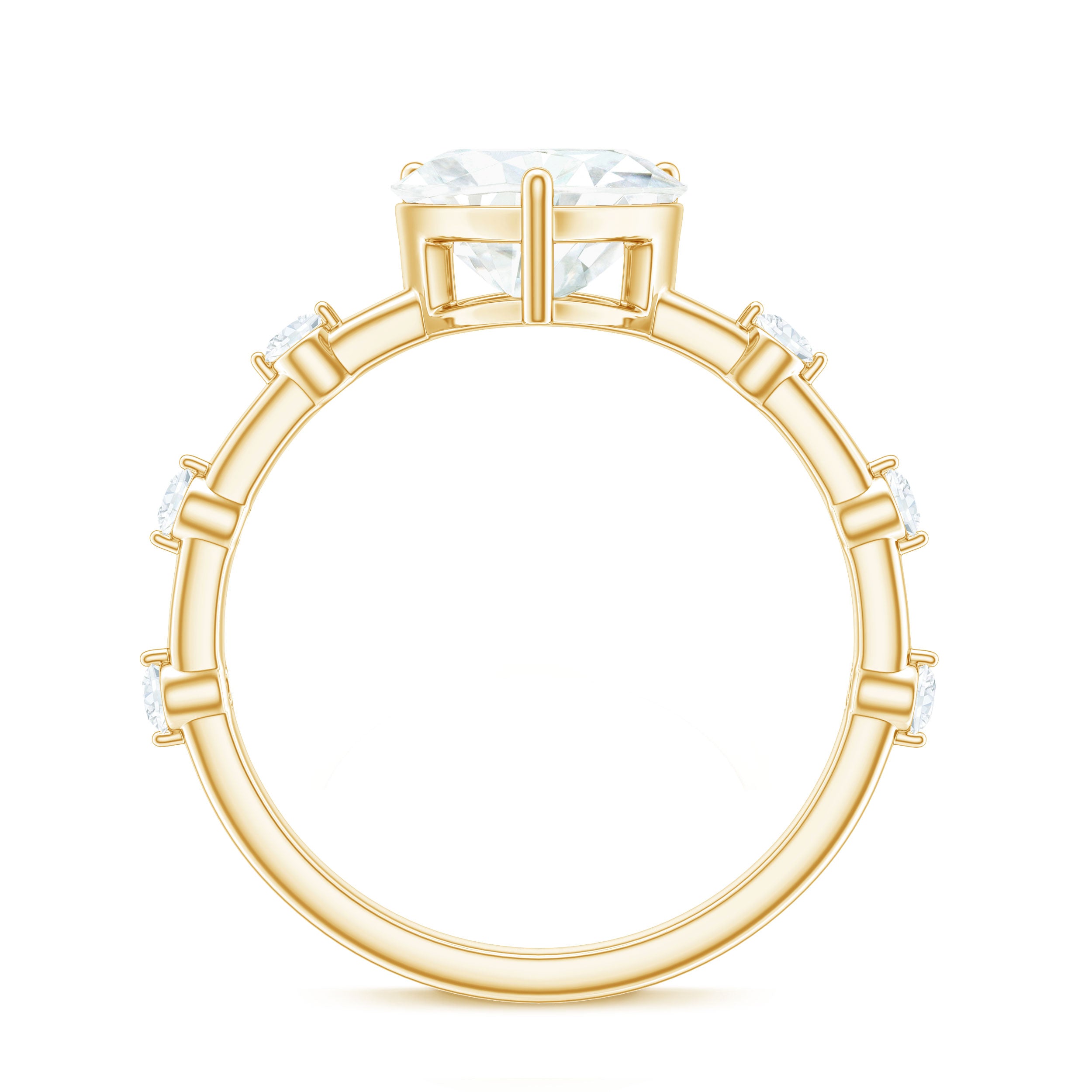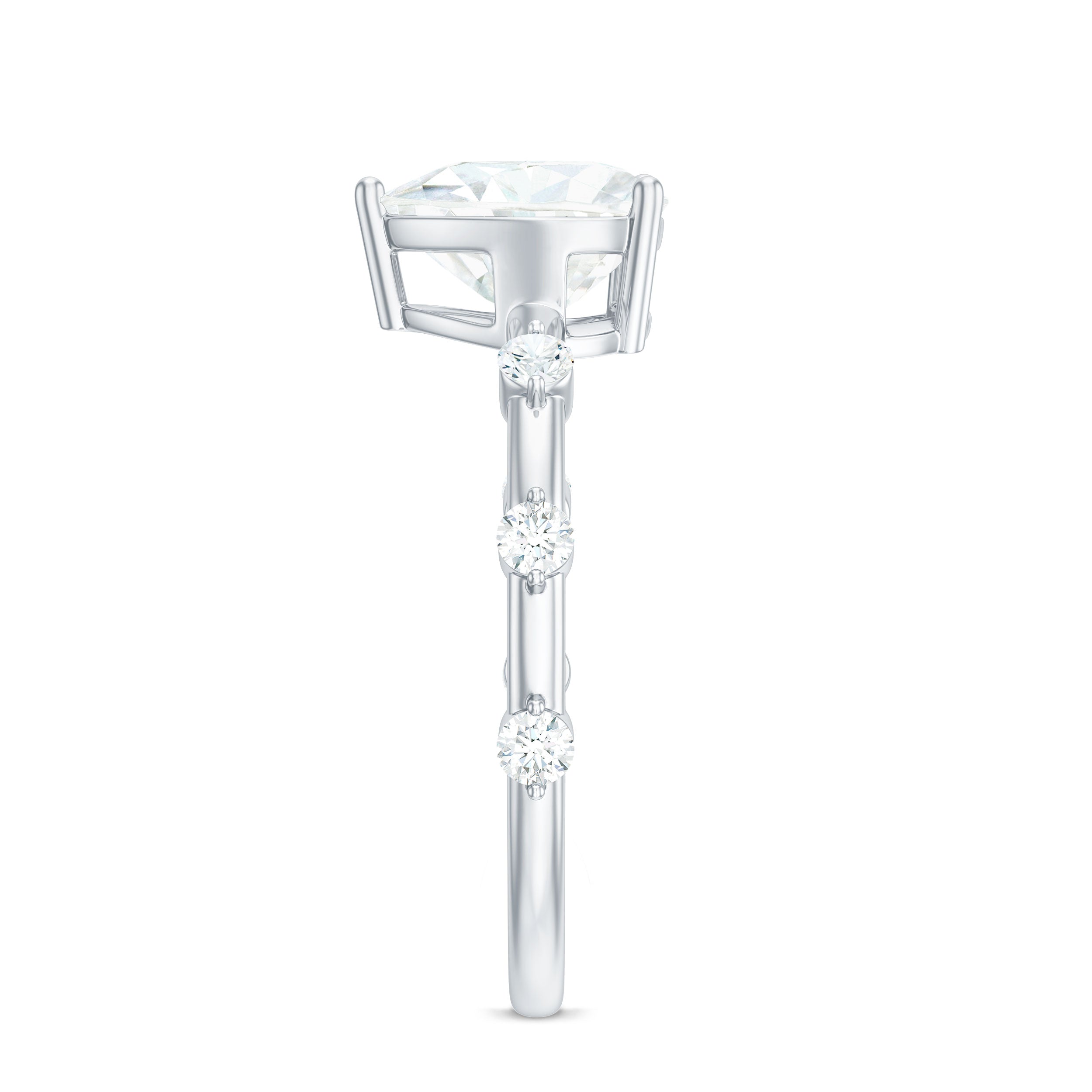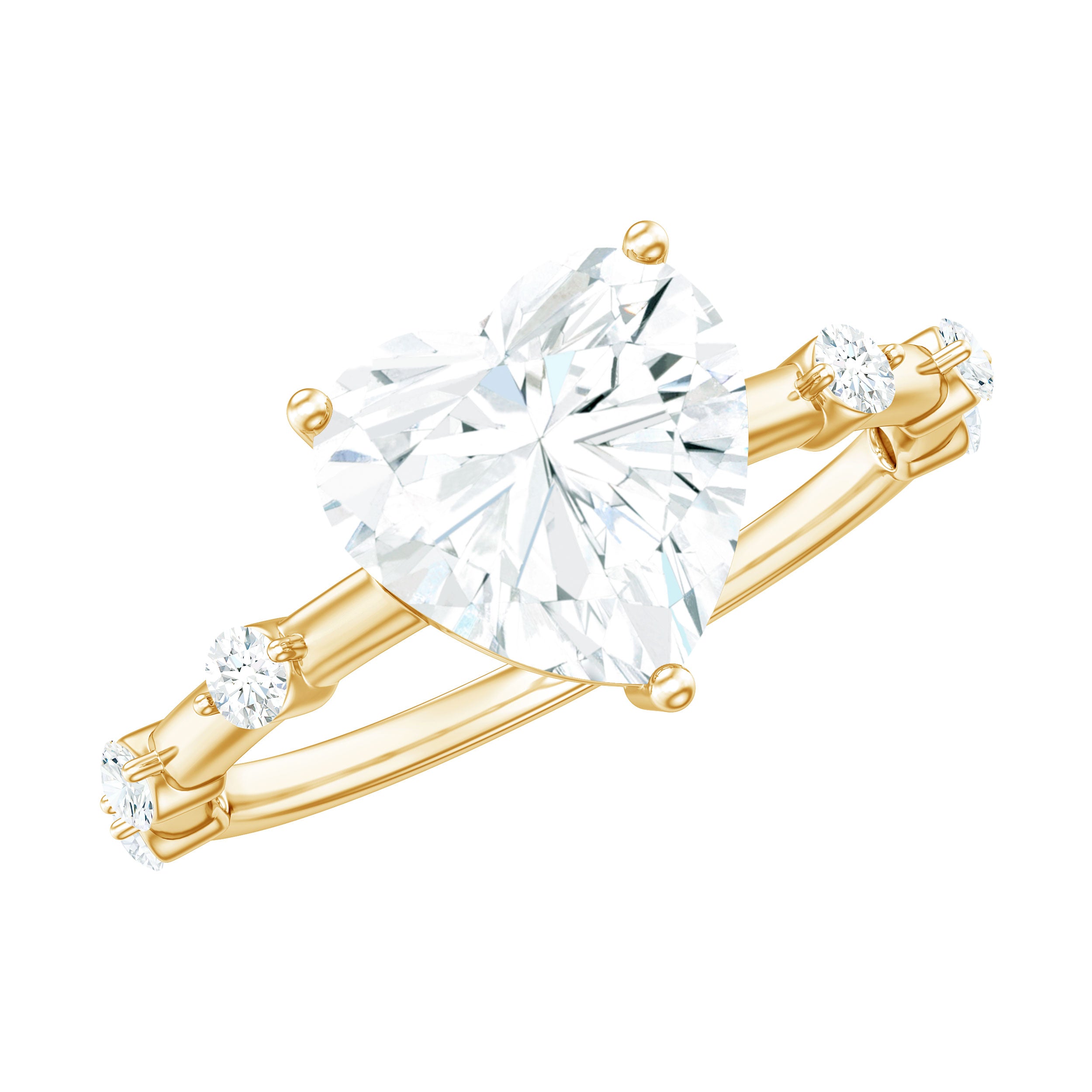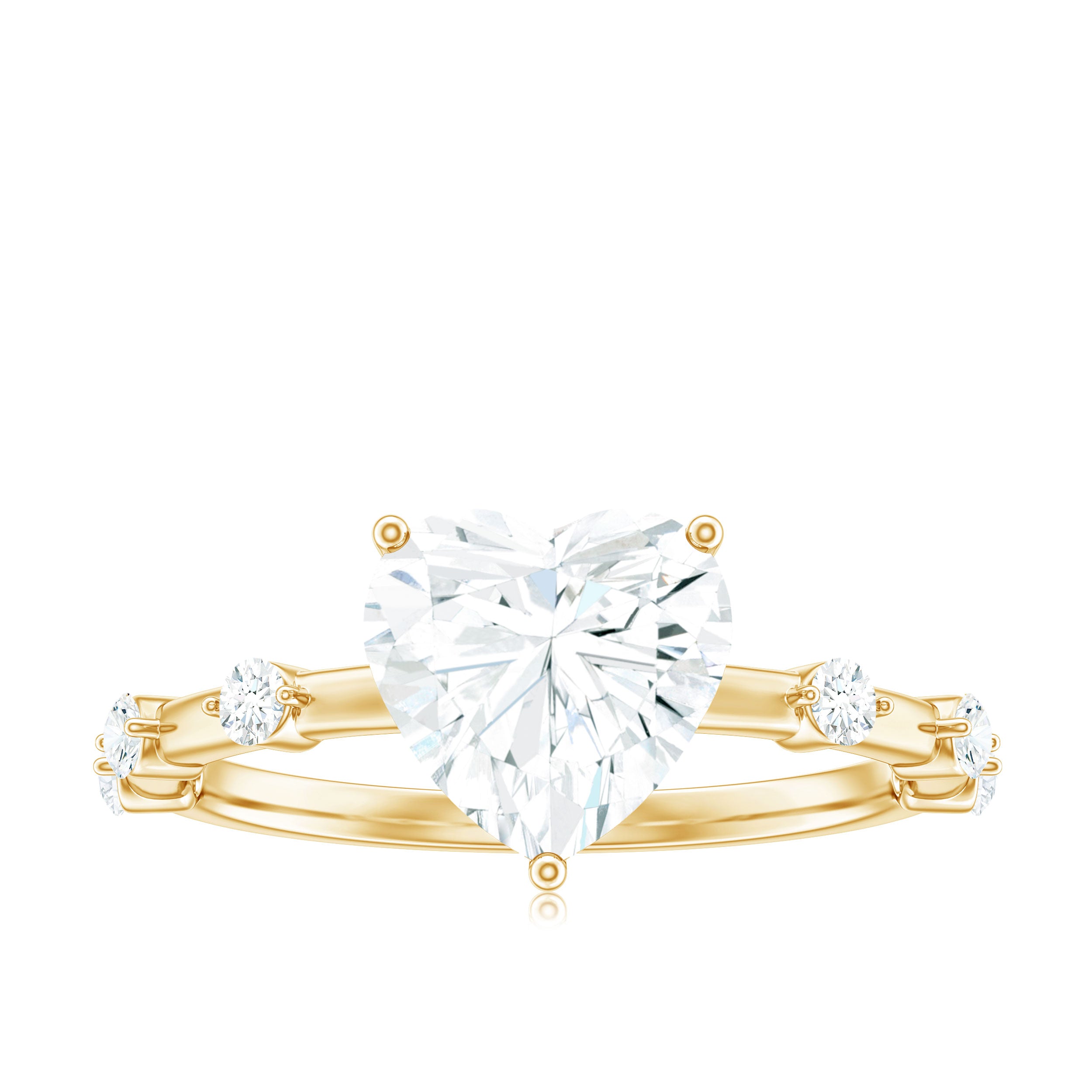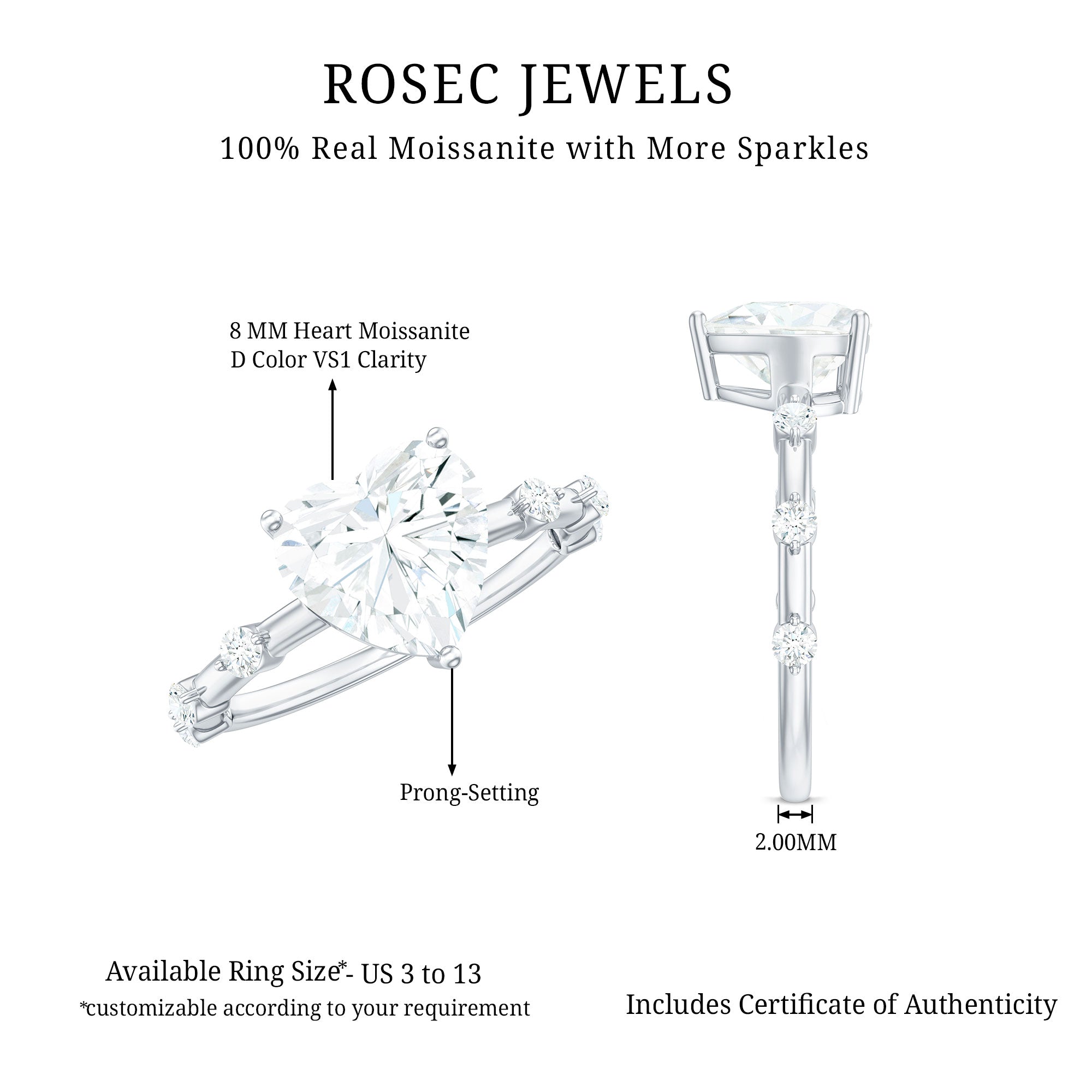Make your love story unforgettable with this radiant Moissanite Engagement Ring, designed to capture hearts and turn heads. This timeless piece features a striking 8 MM heart shaped moissanite as the centerpiece, expertly secured in 3 prong setting, shank adorned with small round shape moissanites. The solitaire moissanite, with its enchanting shape and stunning brilliance, radiates charm, elegance, and uniqueness, serving as an ideal representation of your special connection. Positioned on a smooth and lustrous metal band, this Moissanite Heart Ring emphasizes the captivating center stone. The minimalist design accentuates the moissanite shine while providing a sophisticated and elegant outline. A symbol of everlasting commitment, the heart shape adds a touch of femininity and warmth, making this Heart Engagement Ring an ideal choice for the bride who values both sentiment and sophistication. Crafted to offer exceptional brilliance, this D color, VS1 clarity moissanite shines with clarity and fire that rivals even natural diamonds. Rosec Jewels offers this Solitaire Engagement Ring in a range of sizes and metal options, allowing you to personalize it to perfectly suit your love story.