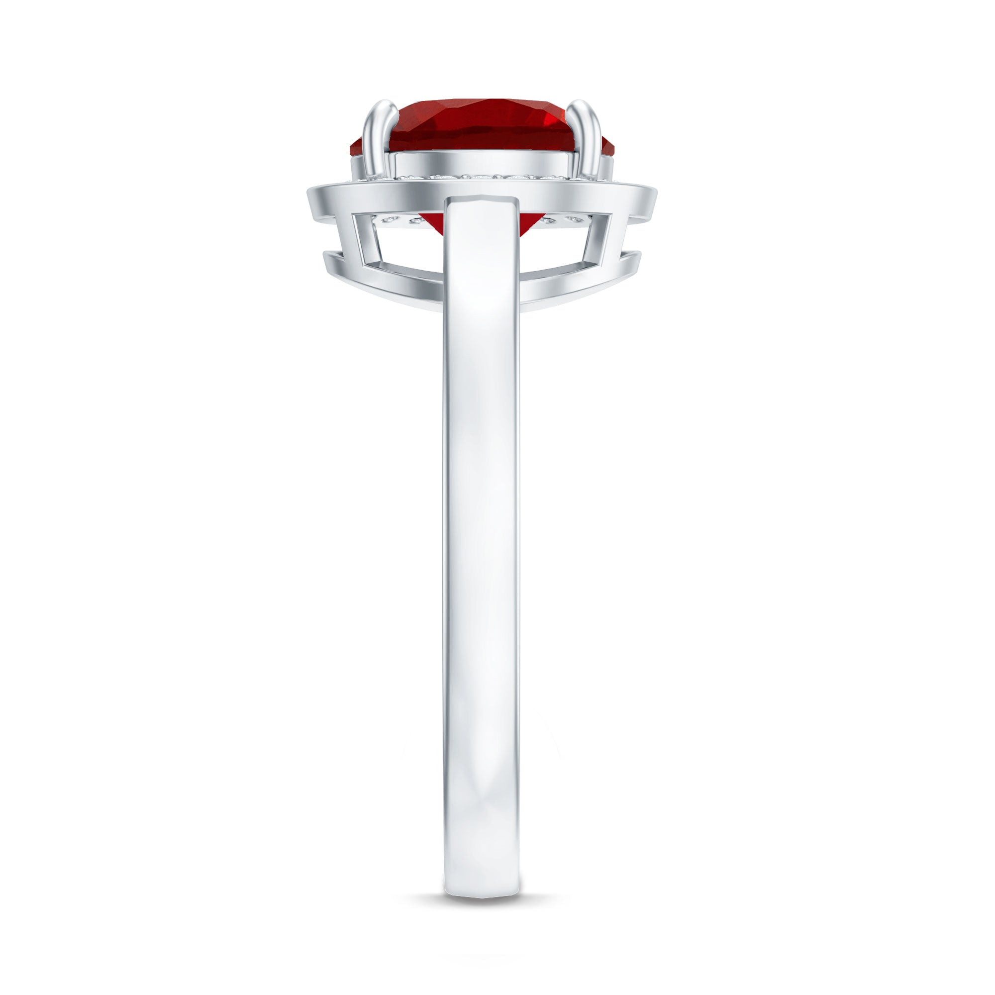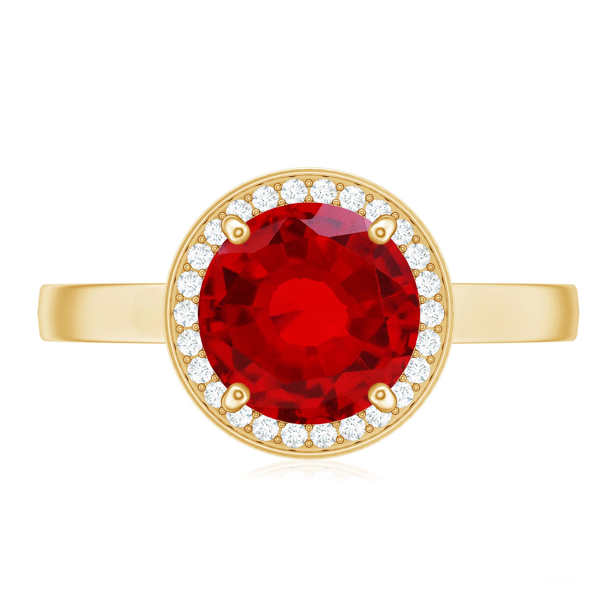 Bring a smile to her face with our Lab Grown Ruby Engagement Ring that truly speaks from the heart. The elegant design features an 8 MM round cut lab created ruby sitting securely at the center. Surrounding the ruby is a floating halo of sparkling diamonds that shimmer beautifully from every angle, giving the Round Engagement Ring a dreamy and radiant look that catches the eye instantly. The AAAA quality lab created ruby and dazzling HI-SI quality diamonds come together perfectly, creating a balance of warmth and brilliance. Every little sparkle adds to its charm, making it a piece that feels luxurious yet meaningful. The floating halo design gives the Ruby and Diamond Ring a graceful appearance while keeping the ruby securely set and highlighted as the centerpiece. Crafted with attention to detail, the Halo Engagement Ring offers both comfort and elegance, making it ideal for everyday wear or special occasions. Packed in a beautiful jewelry box and ready to gift, the Ruby Halo Ring is sure to become a treasured keepsake that holds memories, emotions, and endless sparkle for years to come.