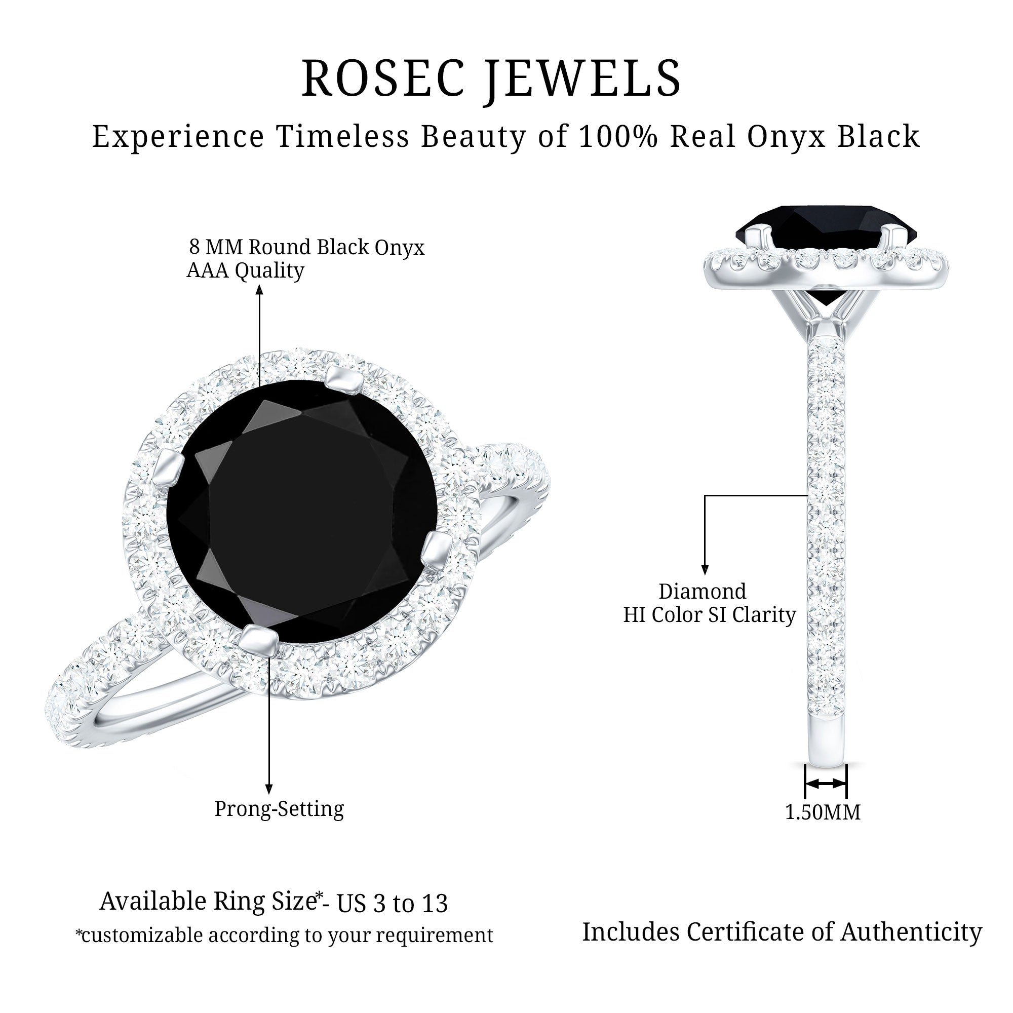 Elevate your jewelry collection with this stunning Black Onyx Engagement Ring, featuring 8mm Round shape Black Onyx set at the center in a prong setting surrounded with round shape diamond set as halo style and more diamond set in side shank, giving this ring a unique look with more shine. This Halo Engagement Ring is meticulously designed to make you feel special and comfortable whole day long. The sleek, polished surface guarantees a comfortable fit, making it ideal for daily use or significant events, seamlessly shifting from informal to formal environments. This Onyx Halo Ring is ideal for expressing your feelings for that unique individual or as a thoughtful - Thinking of you present. It can complement any attire and is a stunning enhancement to any jewelry assortment. Present this exquisite item to yourself or to a cherished person. Present this Black Onyx Ring to your beloved and capture her heart. The Engagement Ring with Side Stones boasts a total weight of 3 Carats with AAA quality. All our gemstones are certified and subjected to rigorous quality inspections.