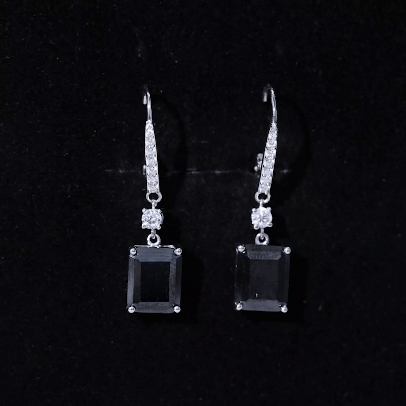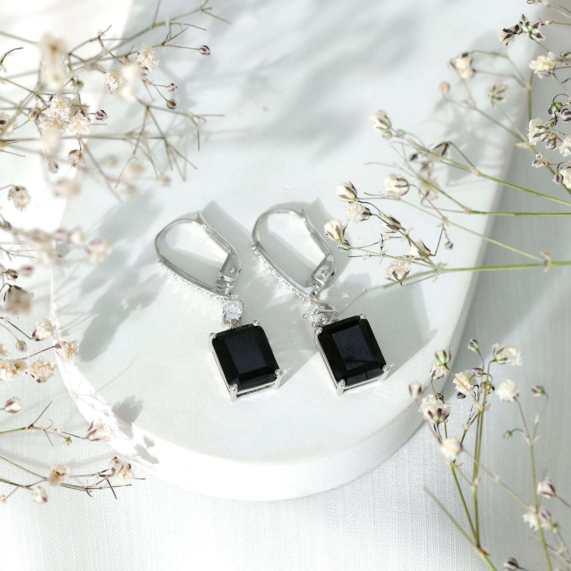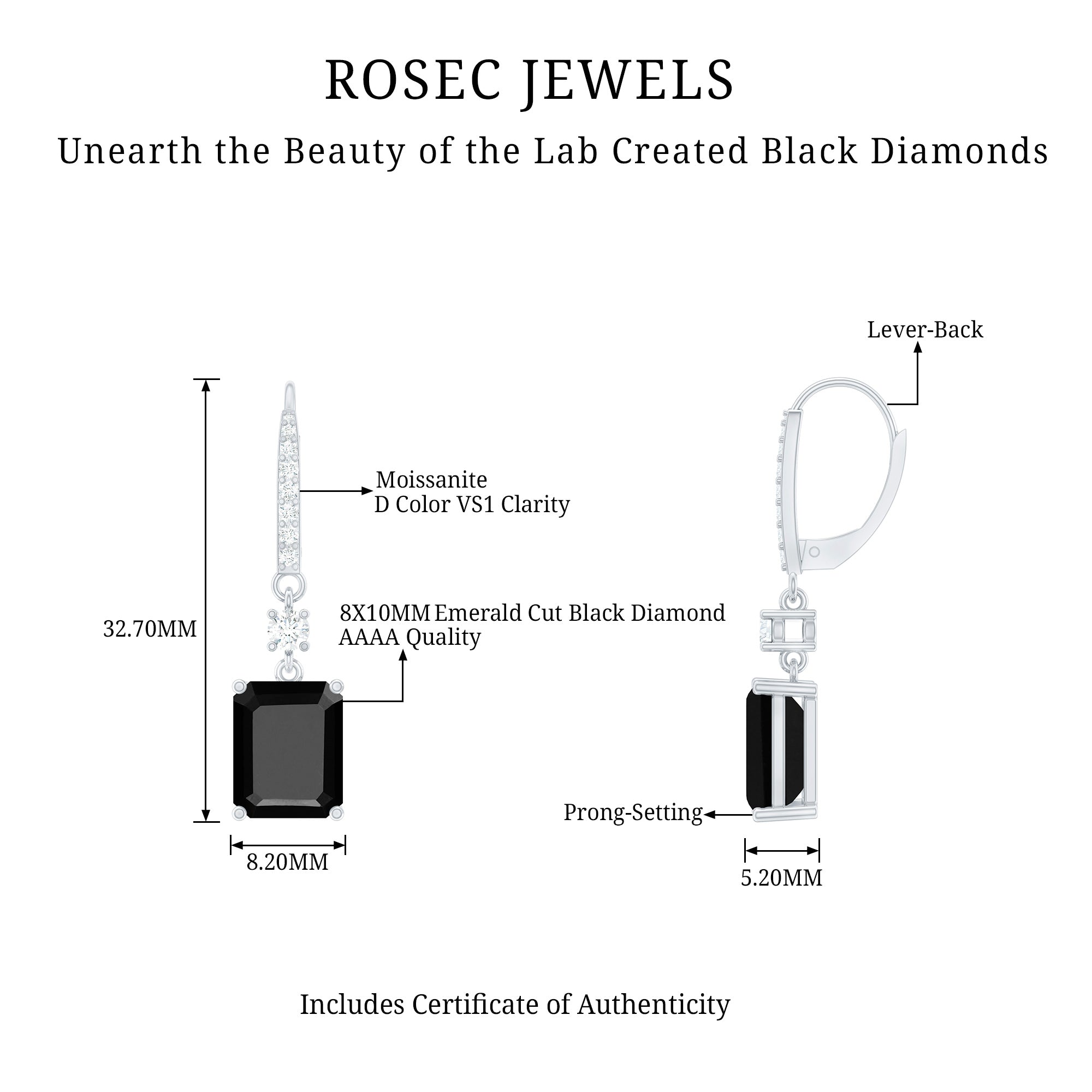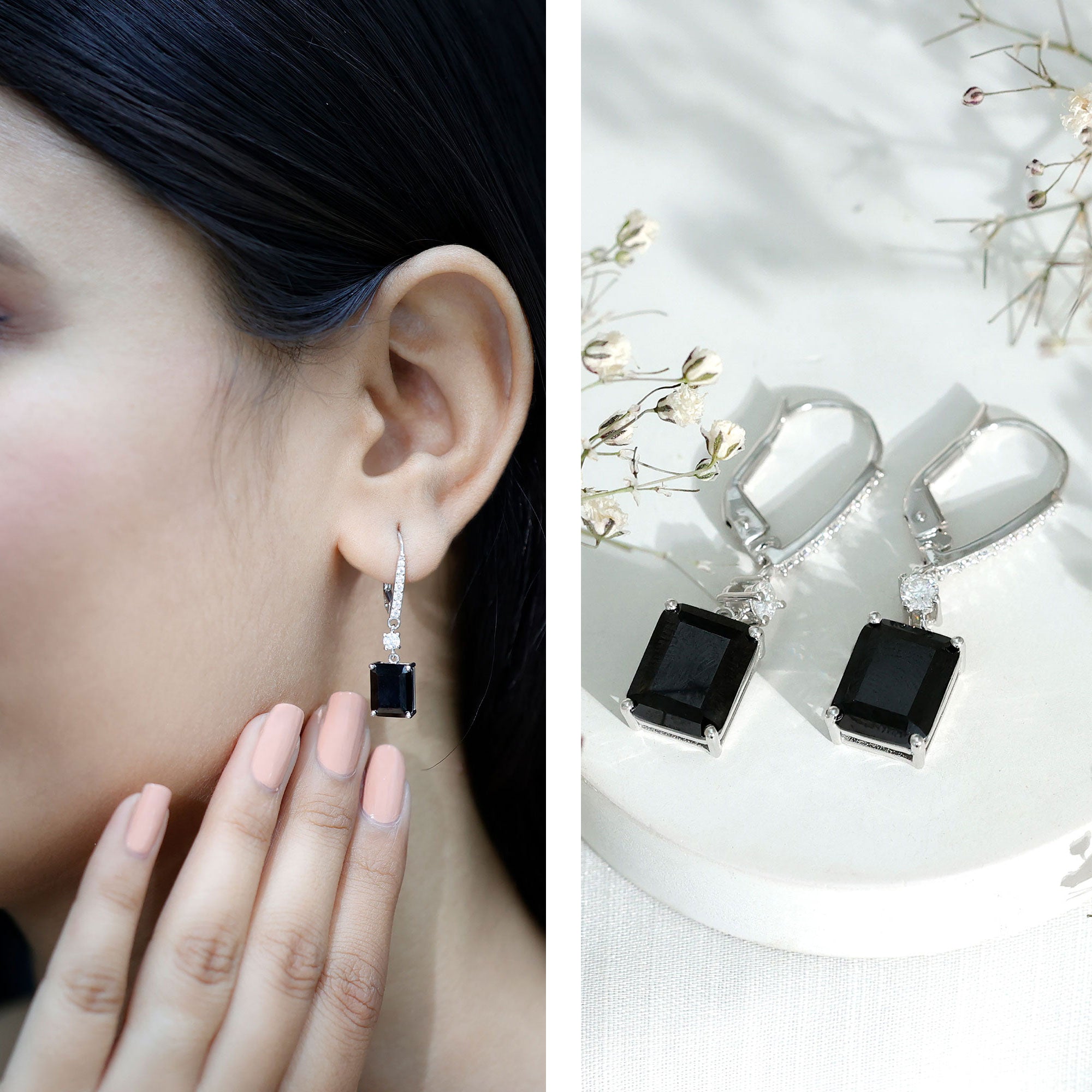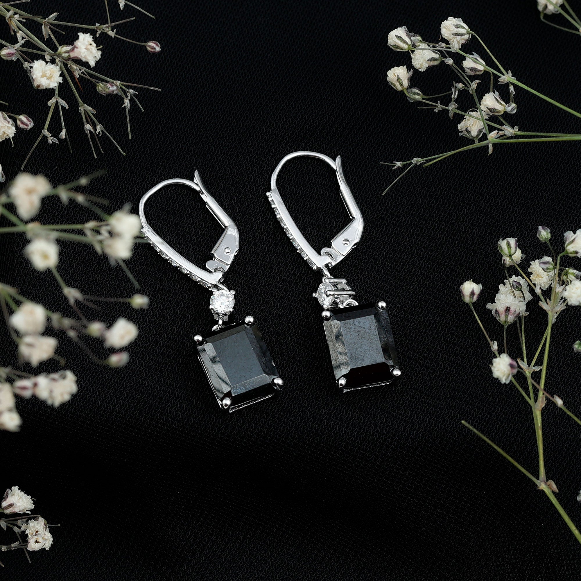 Discover timeless beauty with these stunning Lab Grown Black Diamond Earrings that truly catch the eye and make you the center of attention. Crafted from white gold plated silver, these Hoop Drop Earrings showcase an 8X10 MM emerald cut lab created black diamond alongside round cut Moissanites in prong setting, elegantly dangling from a secure leverback closure, sparkling with every movement. Drawing inspiration from the black and white era, they radiate luxury and sophistication. Simple yet stylish, these Black Diamond Solitaire Earrings feature a meticulous design that attracts attention while maintaining an elegant feel. A perfect representation of classic style, these Black Diamond Hoop Earrings gleam with beauty and are a must-have in your jewelry collection. Renowned for their elegance and allure, they provide a modern classic look ideal for daily wear. So, elevate any outfit with these gorgeous Monochrome Earrings that add a touch of luxury and contrast to your look.