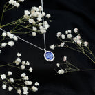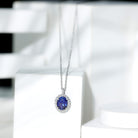 This timelessly gorgeous Halo Necklace features a glittering 8X10 MM oval shaped lab created blue sapphire center surrounded by a sparkling moissanite halo set in prong setting. Not only does this Blue Sapphire Pendant exude luxury, but it also reflects a conscious choice, handcrafted with lab made stone, this is eco-friendly and affordable. Additionally, this Bridal Necklace is handcrafted in 14K White Gold Plated Silver, it makes an ideal choice for daily wear or on special occasions. Enhanced with an accented bail, this beautiful pendant is hung on a cable chain and secured with a lobster clasp, allowing you to adjust the length effortlessly to achieve the perfect fit around your neck. If you are looking for something unique, timeless, and full of brilliance, this is the perfect pendant to celebrate your love.