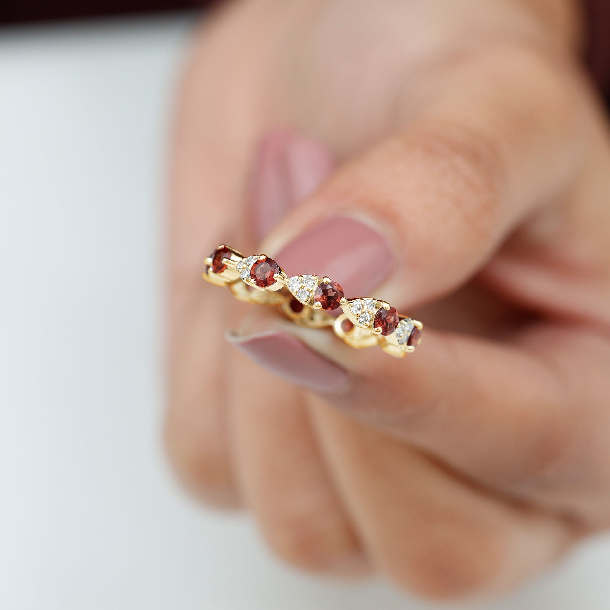 A timeless piece of jewelry, this Garnet Eternity Ring is the perfect symbol of enduring love and cherished memories. Deep, vibrant 3 mm Round Shape Garnet gemstones encircle the band, known for its rich, passionate hue, while sparkling Diamond stones between them catch the light, adding a touch of brilliance that feels both luxurious and delicate. Designed to celebrate anniversaries, milestones or simply the ongoing story of your love, this Garnet Diamond Ring combines elegance with heartfelt meaning. Available in various US ring sizes and delivered in a signature jewelry box, this Full Eternity Ring arrives ready to gift, creating a moment of joy and surprise that will be remembered forever. Its endless circle of gemstones represents commitment, passion and the beauty of a love that grows stronger with time. This Red Garnet Ring can be worn alone for a statement of elegance or paired with other pieces for a layered, modern look. Every glance at this Wedding Anniversary Ring is a reminder of shared moments, laughter and devotion, a piece that transcends trends and becomes part of your love story.