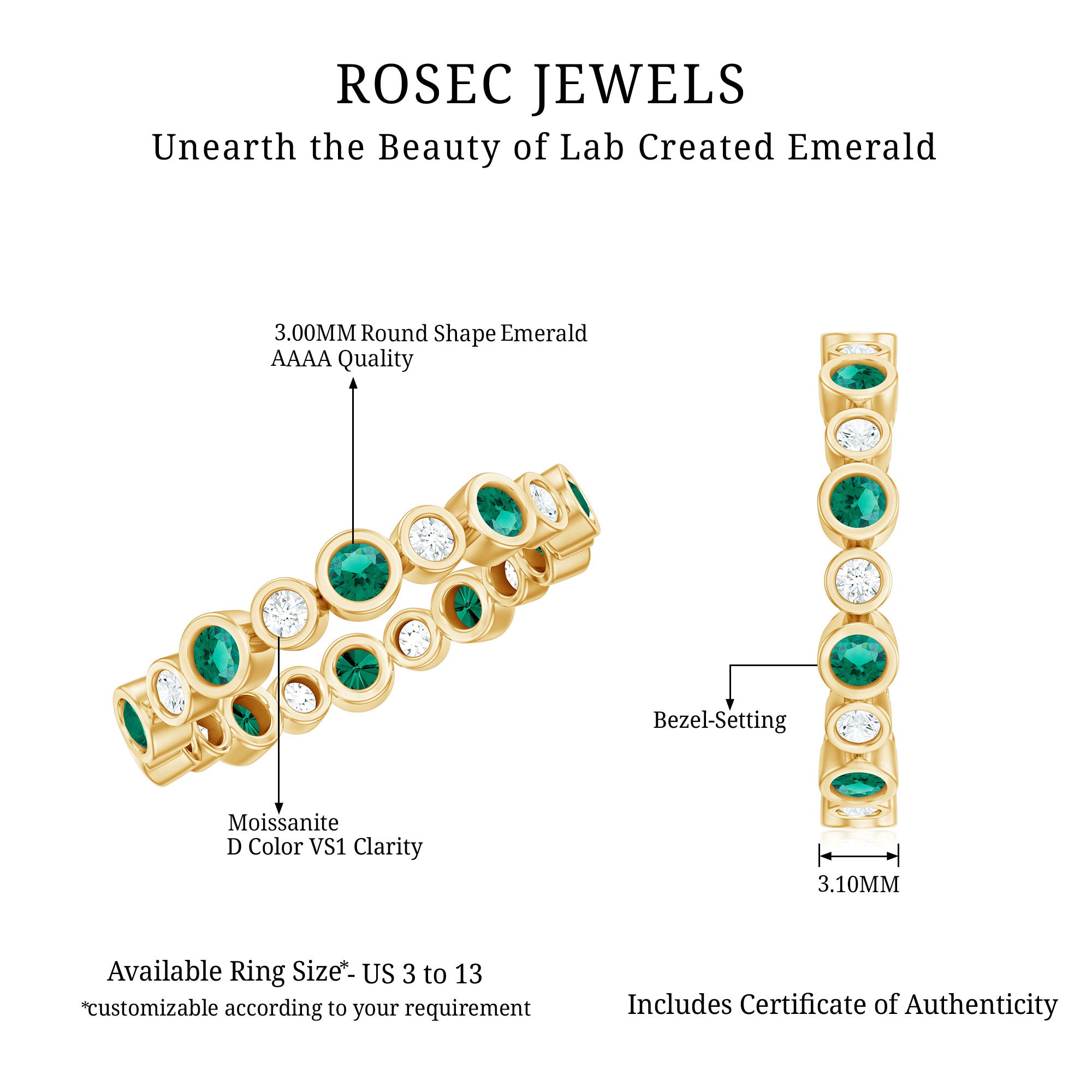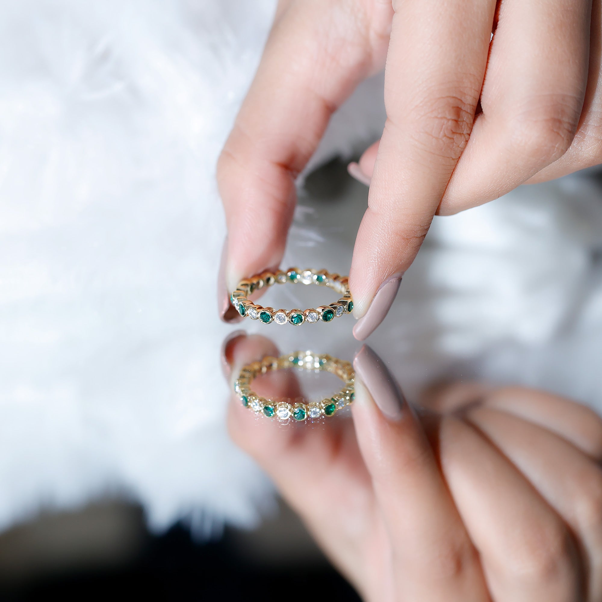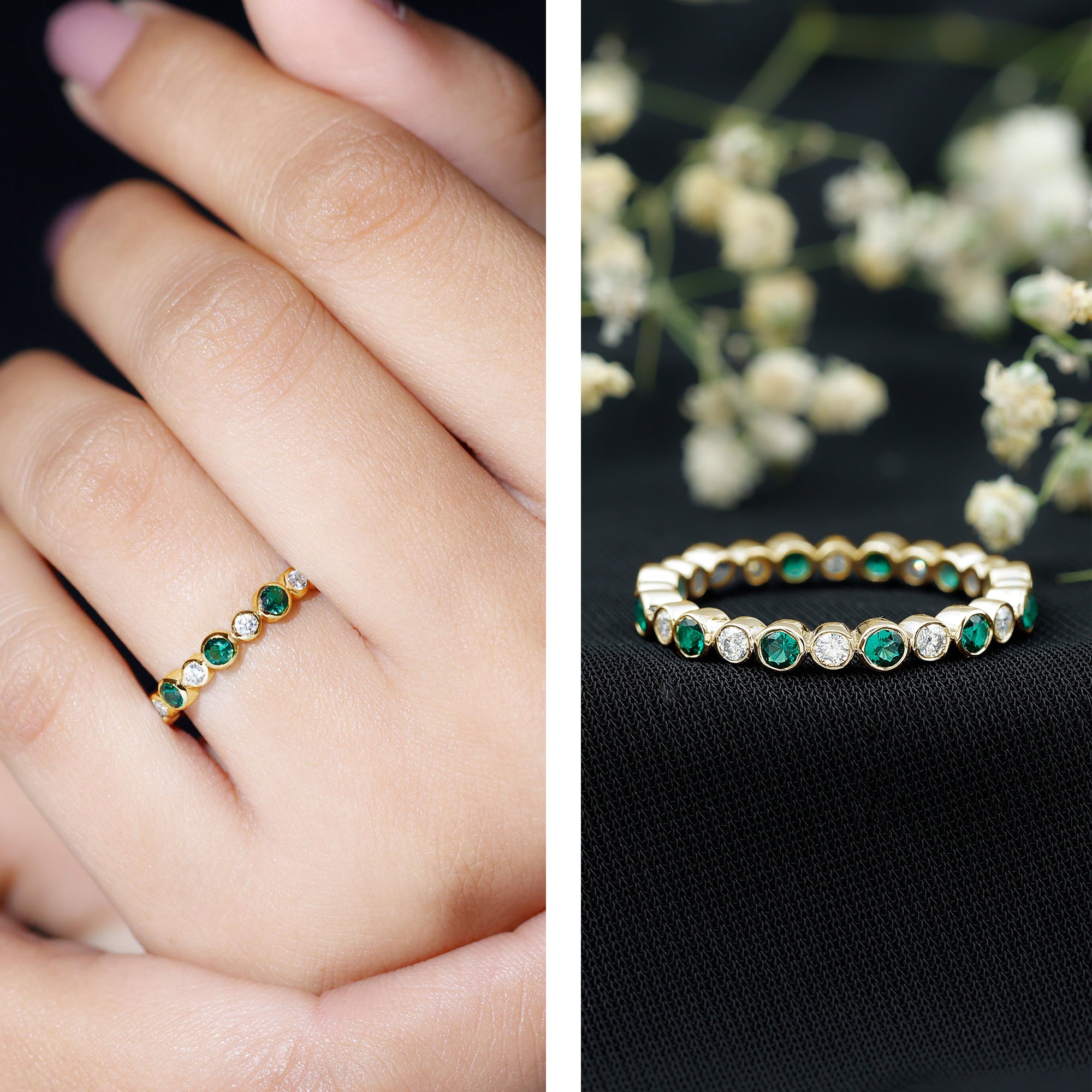 This Lab Emerald Band Ring is sleek and simple, showcasing high brilliance and a rich green hue. It features a continuous line of sparkling Moissanite gemstones, offering a minimal yet elegant look. Adorned with securely held Lab-Created Emerald and Moissanite in Bezel Setting, this Lab Emerald Eternity Ring is perfect for embarking on a new journey or celebrating an anniversary. It is designed to be stacked with other rings or worn alone for a striking statement. This beautiful May Birthstone Ring creates a dynamic and eye-catching design that adds a touch of extravagance and sophistication.