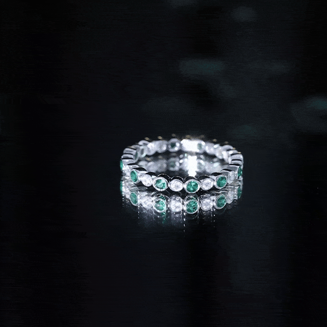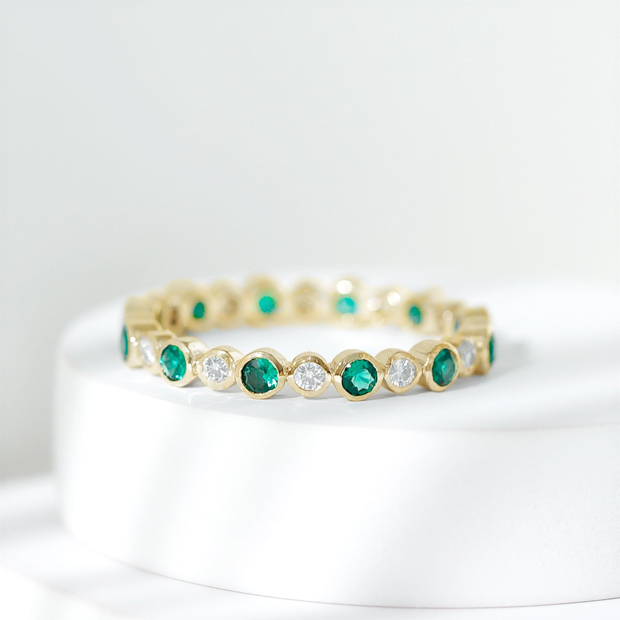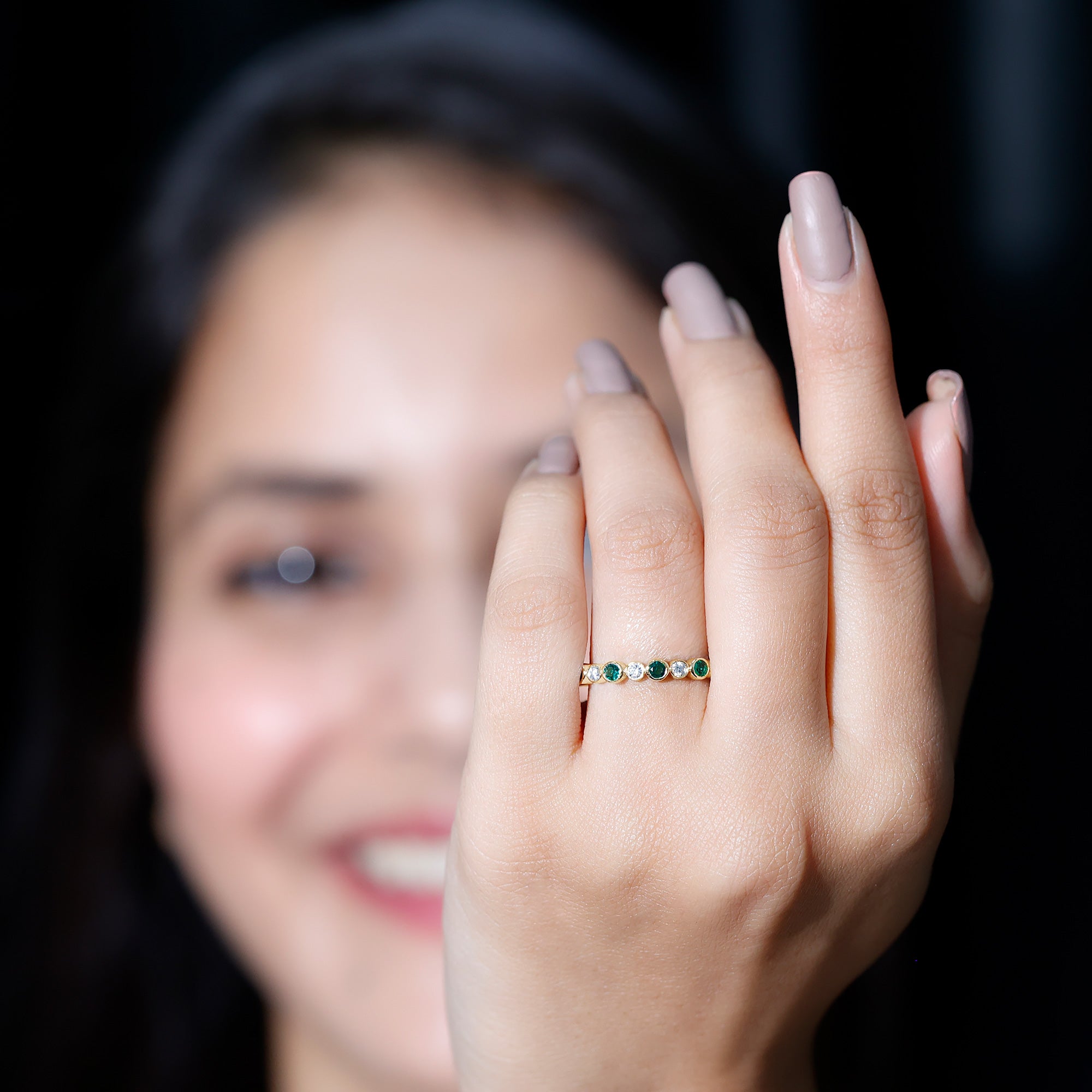 This Lab Emerald Band Ring is sleek and simple, showcasing high brilliance and a rich green hue. It features a continuous line of sparkling Moissanite gemstones, offering a minimal yet elegant look. Adorned with securely held Lab-Created Emerald and Moissanite in Bezel Setting, this Lab Emerald Eternity Ring is perfect for embarking on a new journey or celebrating an anniversary. It is designed to be stacked with other rings or worn alone for a striking statement. This beautiful May Birthstone Ring creates a dynamic and eye-catching design that adds a touch of extravagance and sophistication.
