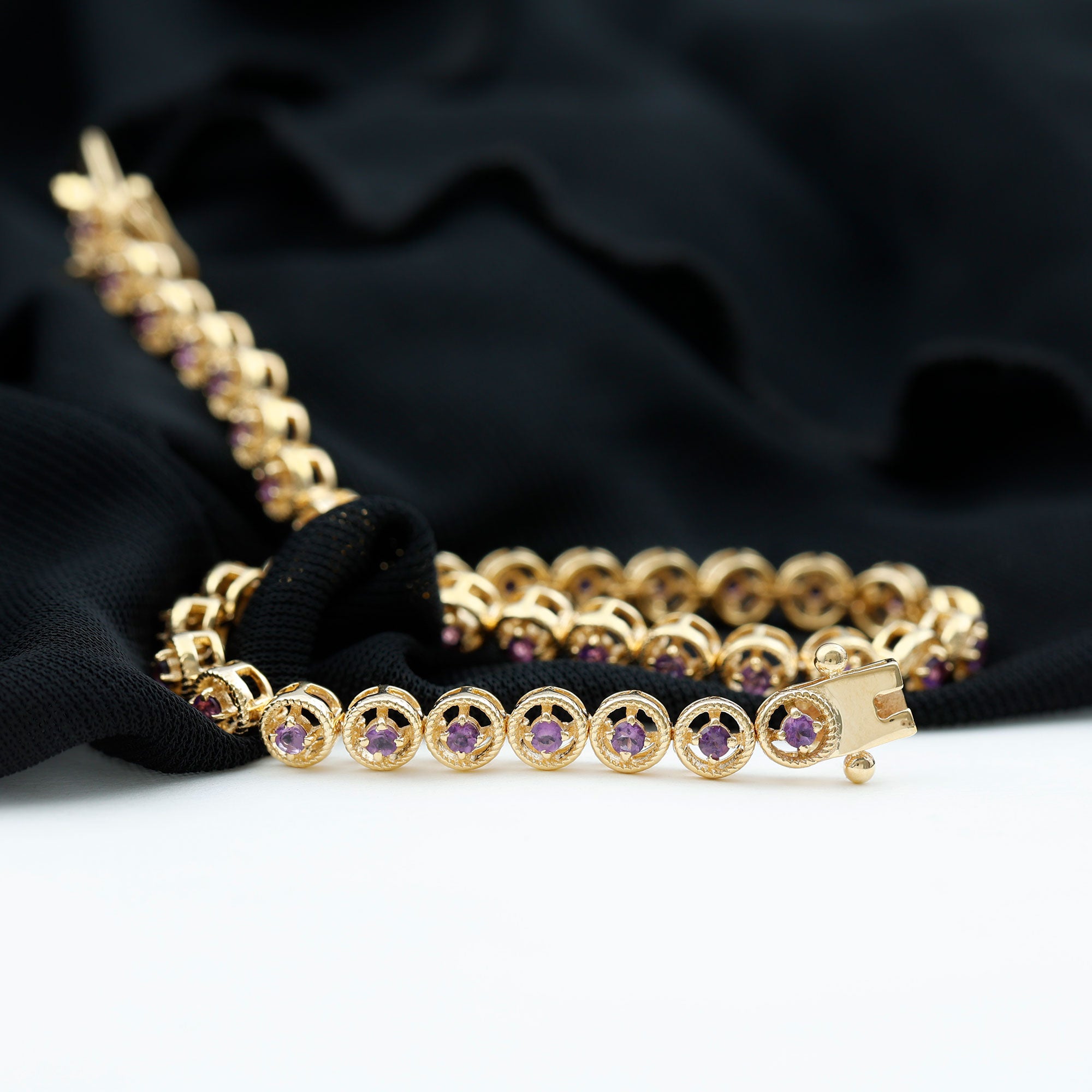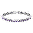 This beautiful Unisex Bracelet is amazingly decorated with round shape Amethyst set in a Prong Setting with Twisted Rope Detailing. This Twisted Rope Detailing highlights the gemstone very fluently which makes this Tennis Bracelet more charming.