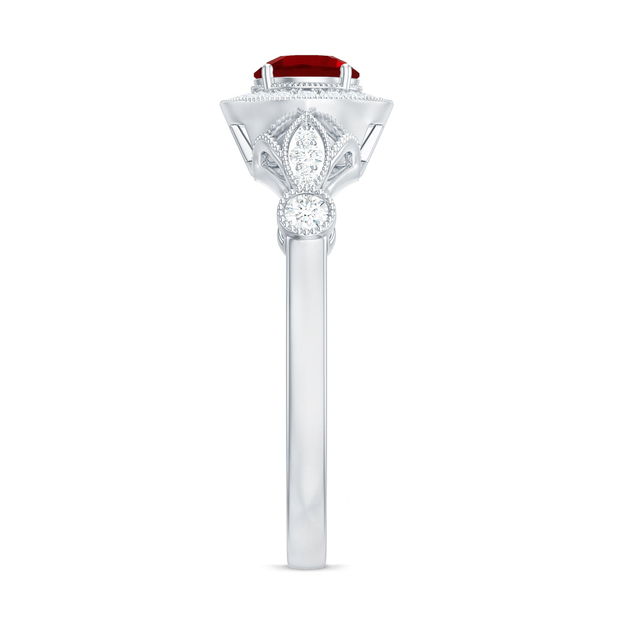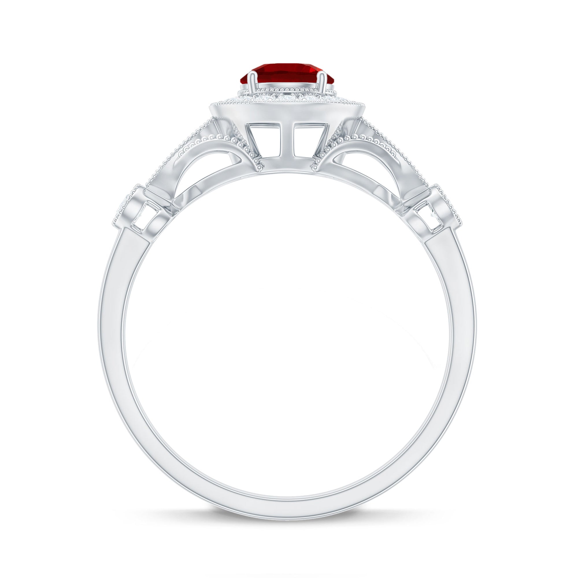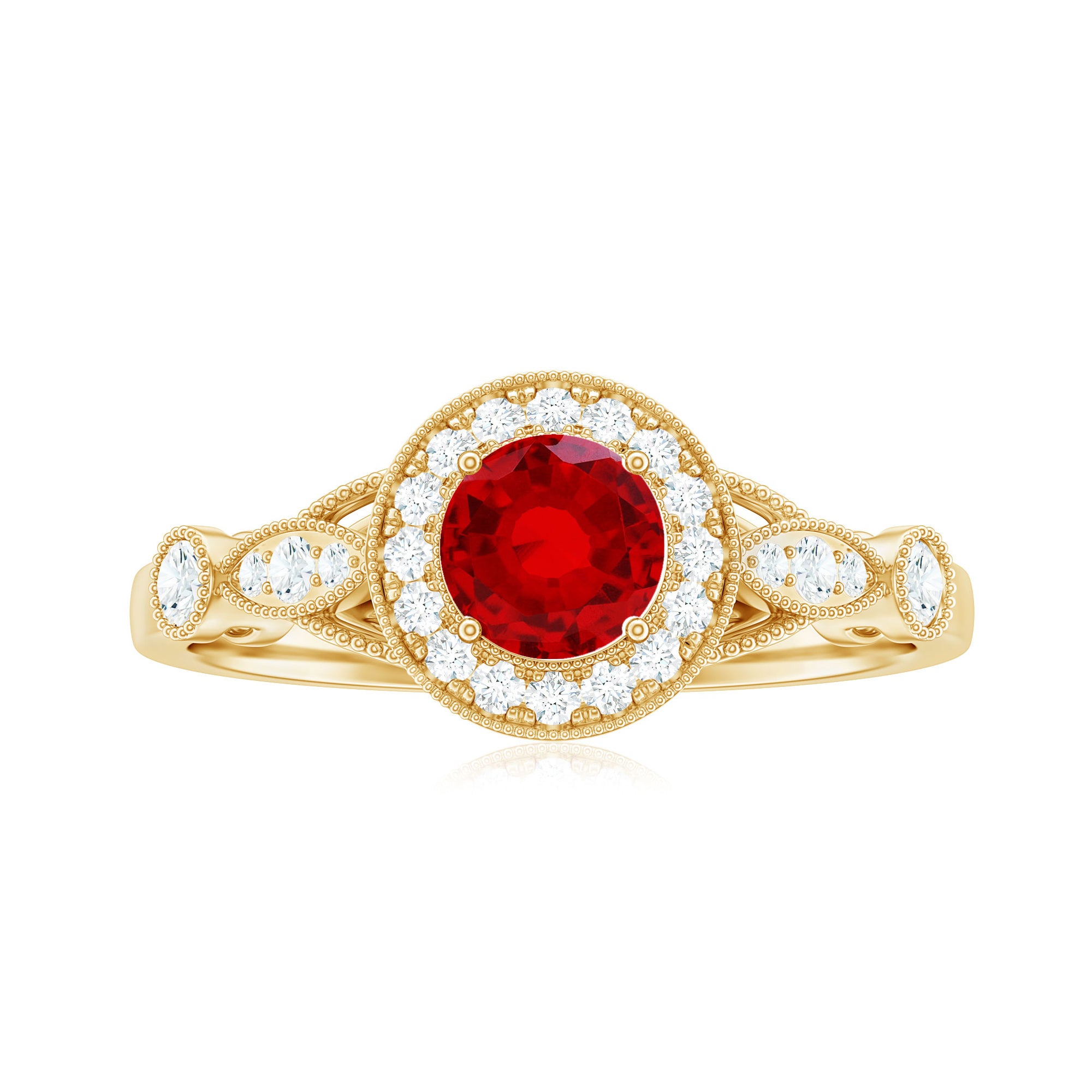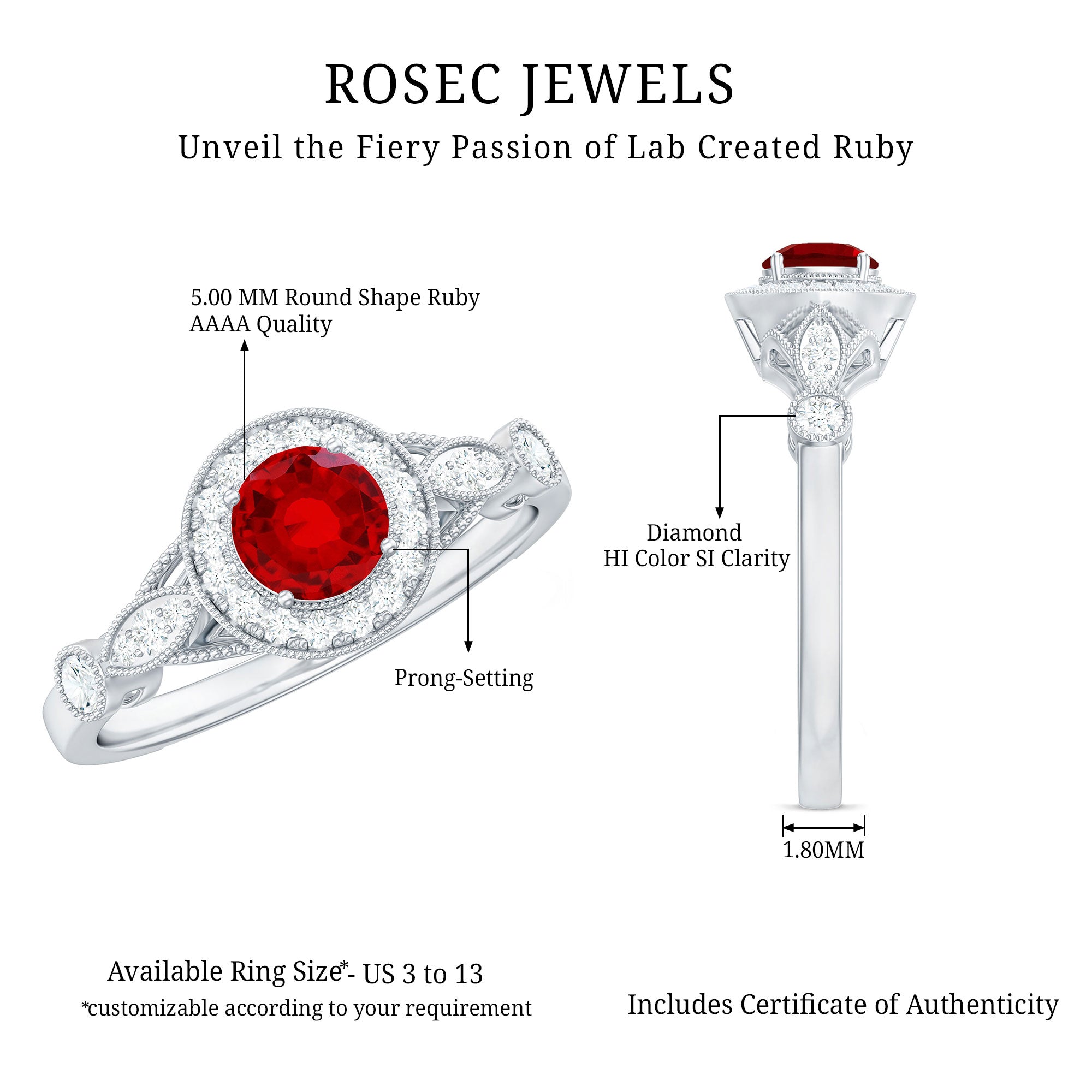 Delicate vintage artistry meets modern brilliance in this Lab Grown Ruby Engagement Ring. The design captures the romance of antique jewelry with a touch of contemporary elegance. At its center lies a 5 MM round cut lab grown ruby. The ruby is encircled by a halo of glittering round cut diamonds, each one carefully set to amplify its fiery sparkle. Adding depth and texture, the shank features intricate beaded detailing that enhances the ring’s vintage charm. Tiny diamond side stones shimmer along the band, bringing subtle light and movement to the piece. The combination of AAAA quality lab grown ruby and sparkling HI-SI quality diamonds creates a look that feels romantic. The craftsmanship reflects timeless attention to detail, offering a piece that feels luxurious yet meaningful. Crafted with an eco-friendly, lab-grown ruby, this Vintage Looking Engagement Ring is a thoughtful choice for anyone who values sustainability and ethical beauty. The durable design ensures lasting brilliance, perfect for a lifetime of love and memories. Packaged beautifully and ready to gift, this Ruby and Diamond Ring is a keepsake of style, love, and conscious sophistication.