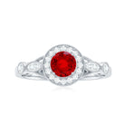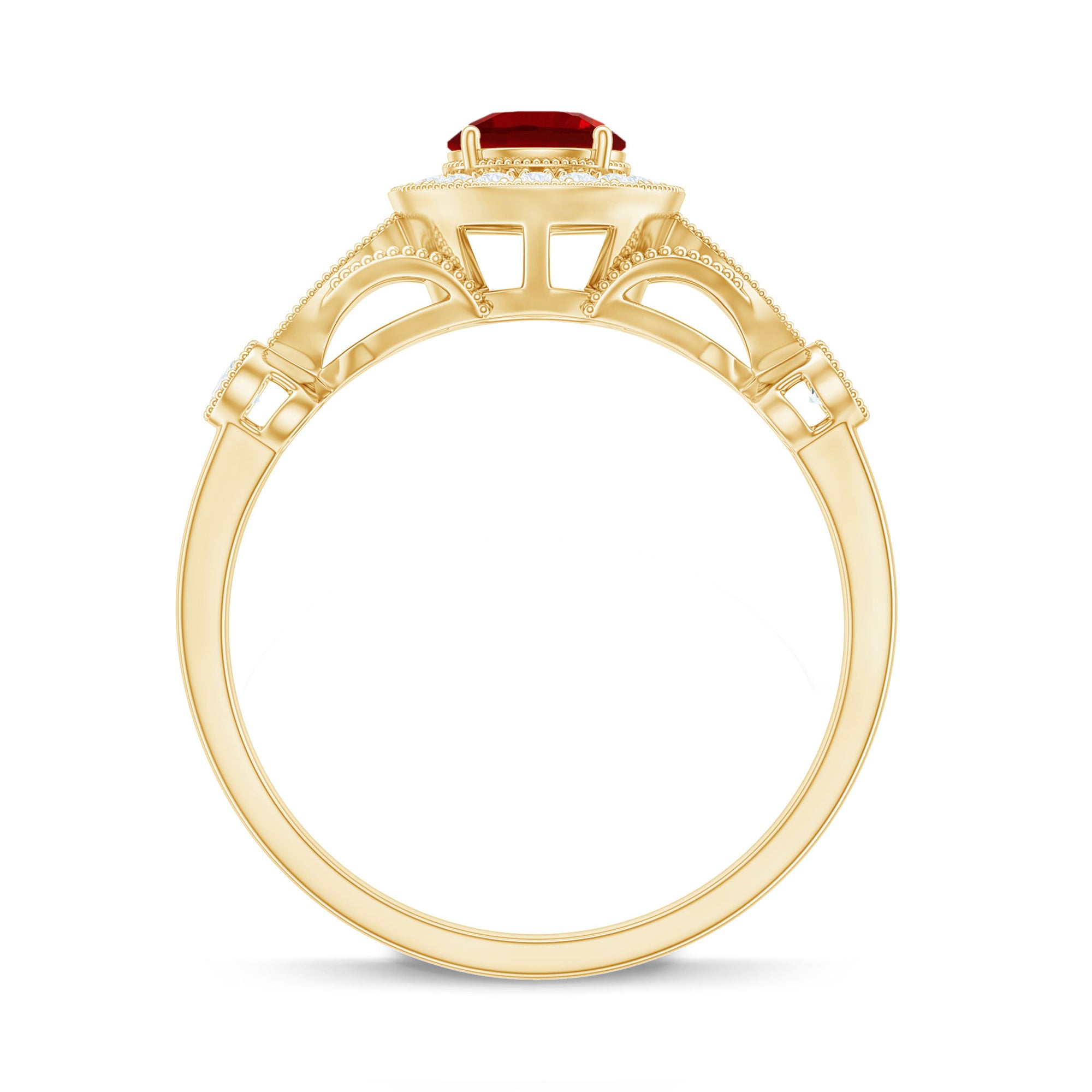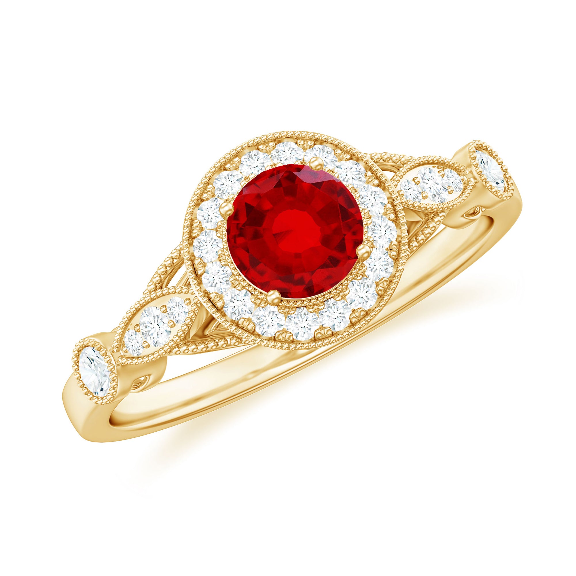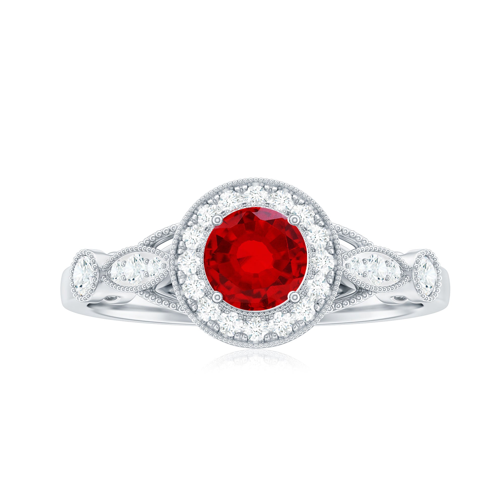 Delicate vintage artistry meets modern brilliance in this Lab Grown Ruby Engagement Ring. The design captures the romance of antique jewelry with a touch of contemporary elegance. At its center lies a 5 MM round cut lab grown ruby. The ruby is encircled by a halo of glittering round cut diamonds, each one carefully set to amplify its fiery sparkle. Adding depth and texture, the shank features intricate beaded detailing that enhances the ring’s vintage charm. Tiny diamond side stones shimmer along the band, bringing subtle light and movement to the piece. The combination of AAAA quality lab grown ruby and sparkling HI-SI quality diamonds creates a look that feels romantic. The craftsmanship reflects timeless attention to detail, offering a piece that feels luxurious yet meaningful. Crafted with an eco-friendly, lab-grown ruby, this Vintage Looking Engagement Ring is a thoughtful choice for anyone who values sustainability and ethical beauty. The durable design ensures lasting brilliance, perfect for a lifetime of love and memories. Packaged beautifully and ready to gift, this Ruby and Diamond Ring is a keepsake of style, love, and conscious sophistication.
