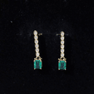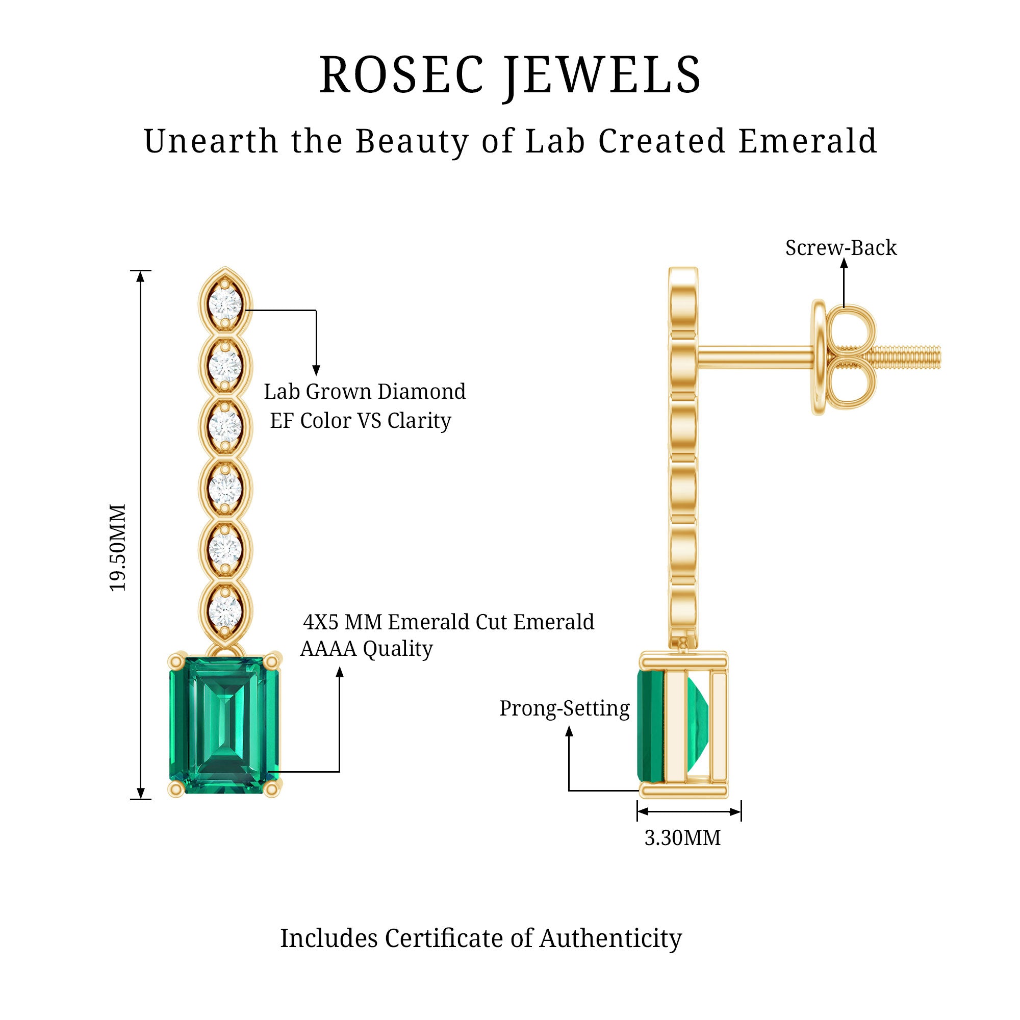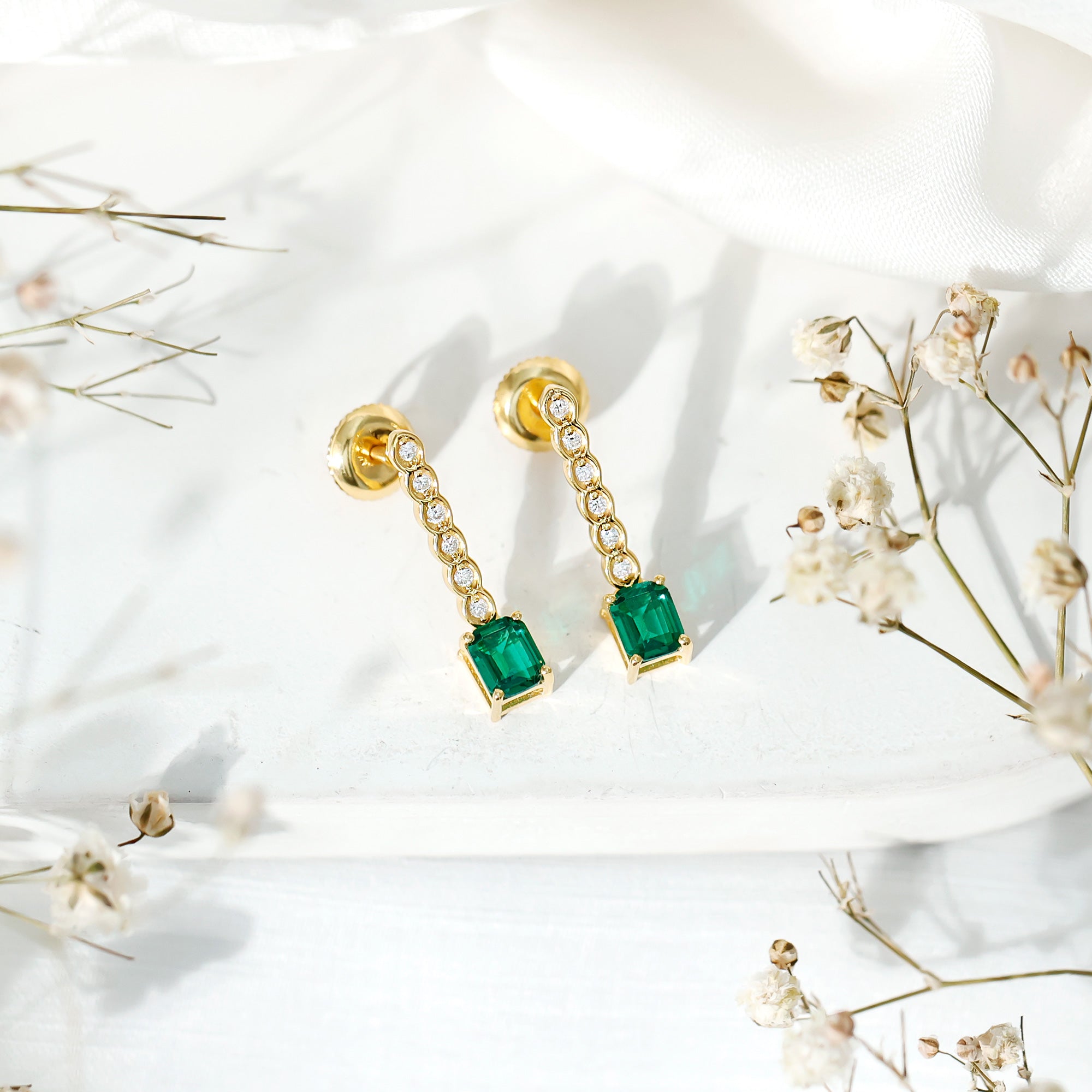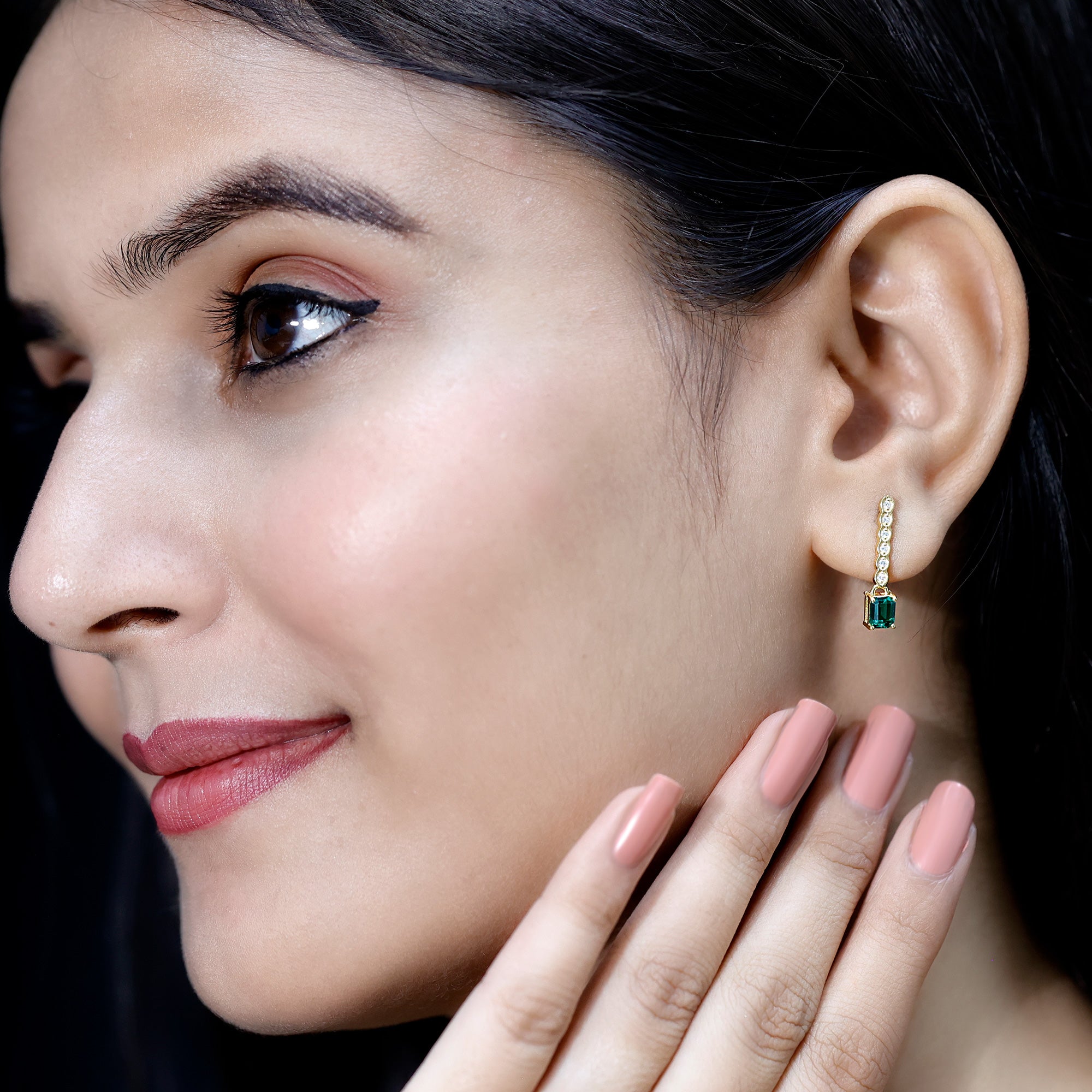 Let elegance move with you in every step with these graceful Lab Created Emerald Dangle Earrings. Thoughtfully designed to bring a touch of refined beauty, these earrings are crafted in 14K yellow gold plated silver and showcase a timeless beauty that is both modern and classic. At the heart of the design is a stunning 4X5 MM emerald cut lab created emerald. Set in a secure prong setting, the emerald gently dangles below a sleek vertical bar that sparkles with round cut lab grown diamond stones, creating a graceful flow of shimmer and color. The combination of rich green AAAA quality lab emeralds and brilliant EF color VS clarity lab diamonds offers a beautiful contrast, bold yet delicate, just like the moments that matter most. Designed with comfort in mind, these Lab Emerald Earrings feature secure screw-back closures, so you can wear them confidently from day to night. Whether you are walking down the aisle or heading to a special evening, these Emerald and Diamond Earrings will catch the light, and attention, with every movement. Carefully handcrafted and ethically made, these Wedding Earrings for Bride are not just beautiful to wear but meaningful too.