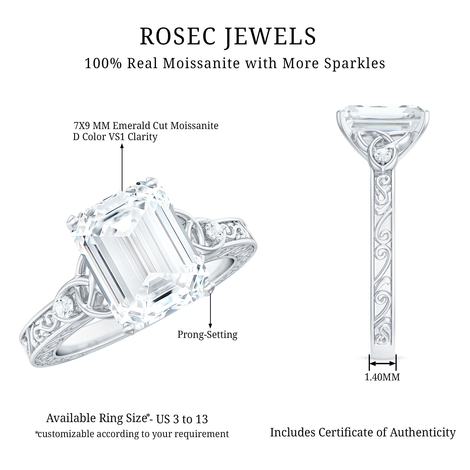 Your love shines bright with this Emerald Cut Moissanite Engagement Ring - it is bold, bright, and full of meaning. The focal point of this Celtic Solitaire Ring showcases a dazzling 7X9 mm emerald cut moissanite, secured in prongs that allow its fire and brilliance to shine prominently. It reflects light beautifully, adding an exquisite touch of drama to your hand. What truly distinguishes this Solitaire Engagement Ring is the intricate Celtic knot detail and the vintage-style engraved patterns adorned with delicate stones throughout the band. It is not merely attractive; it serves as a stunning emblem of eternal love and connection, ideal for commemorating significant occasions such as engagements, anniversaries, or personal milestones. Carefully crafted to shine with brilliance, this Emerald Cut Engagement Ring is designed for those who value unique items that tell a story. It comes exquisitely packaged in a delightful box and is available in US sizes from 3 to 13, making it easy for you to find your perfect size. If you hold dear the concepts of love, light, and the meaningful details, this Celtic Design Engagement Ring is made just for you.