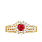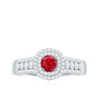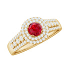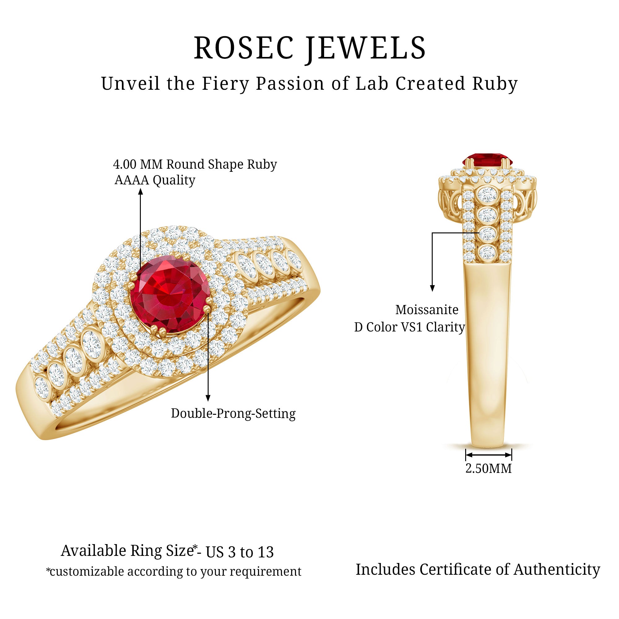Step into the spotlight with a ring that is bold, sparkly, and full of charm. Designed with a vintage soul and a modern twist, this Lab Created Ruby Engagement Ring brings together all the right details to make your moment unforgettable. It is handcrafted with a 4 MM round shaped ruby, set neatly in prongs. Surrounding it is a dazzling double halo of moissanites, creating a burst of sparkle that grabs attention without saying a word. What makes this Ruby and Moissanite Ring extra special is the wide band. It is crafted with three rows of brilliant moissanite stones that add even more shine and give off that gorgeous Art Deco-inspired vibe. Every part of this Antique Looking Engagement Ring is meant to catch the light and turn heads, all while keeping things elegant and timeless. The rich red hue of the AAAA quality lab ruby paired with the icy brilliance of D color and VS1 clarity moissanites creates a perfect contrast that stands out from the usual designs. It arrives beautifully packed in a jewelry box and comes with a certificate of authenticity, so you know you are getting something truly special. Romantic and a little bit vintage, this Double Halo Ring is all about love that sparkles just as much as it lasts.