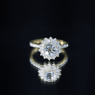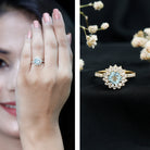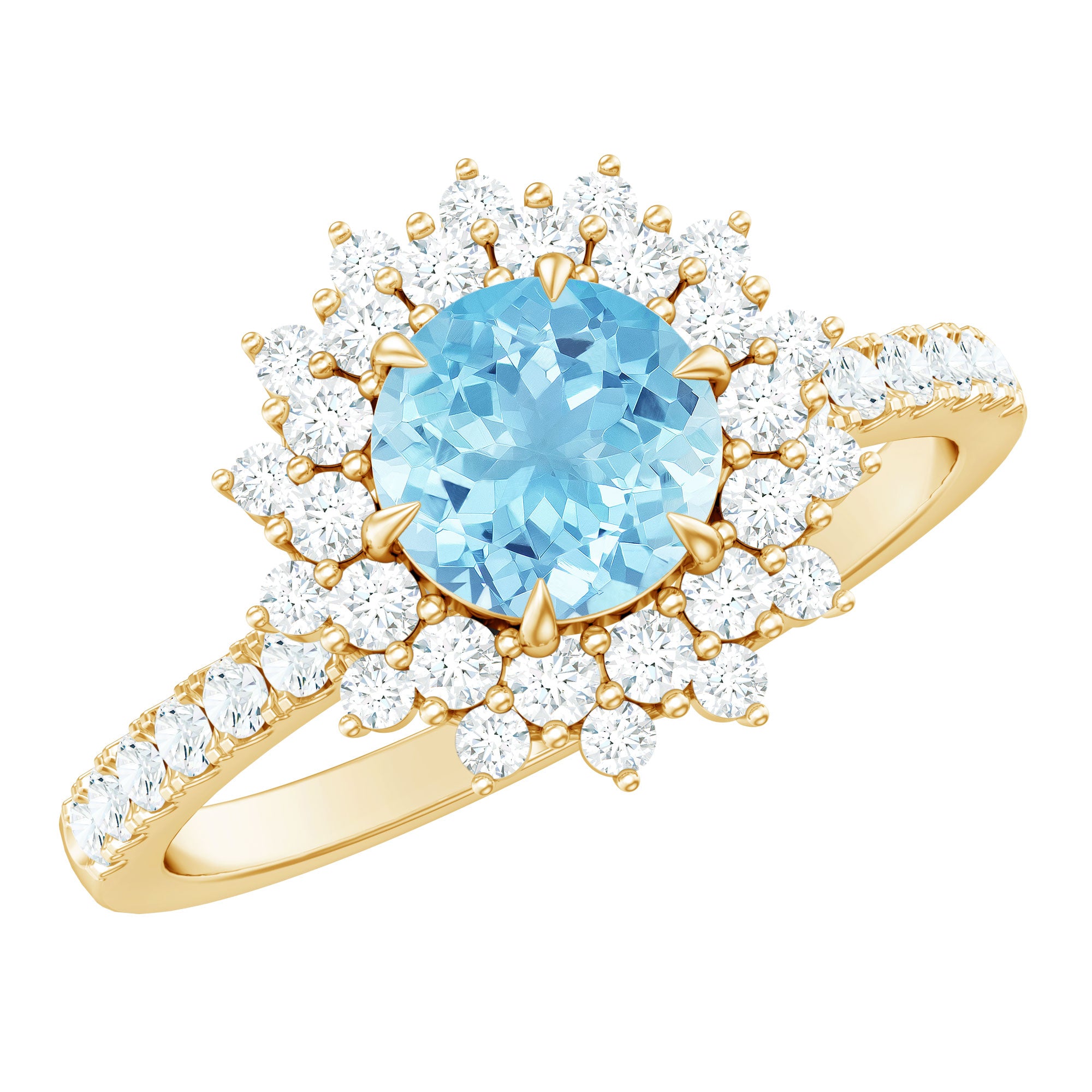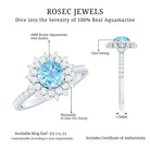 Unleash your inner diva with the Aquamarine Statement Ring. This ring showcases a round-cut aquamarine encircled by a halo of clustered Moissanite gems. The striking design enhances your appearance and adds a touch of elegance to your ensemble.