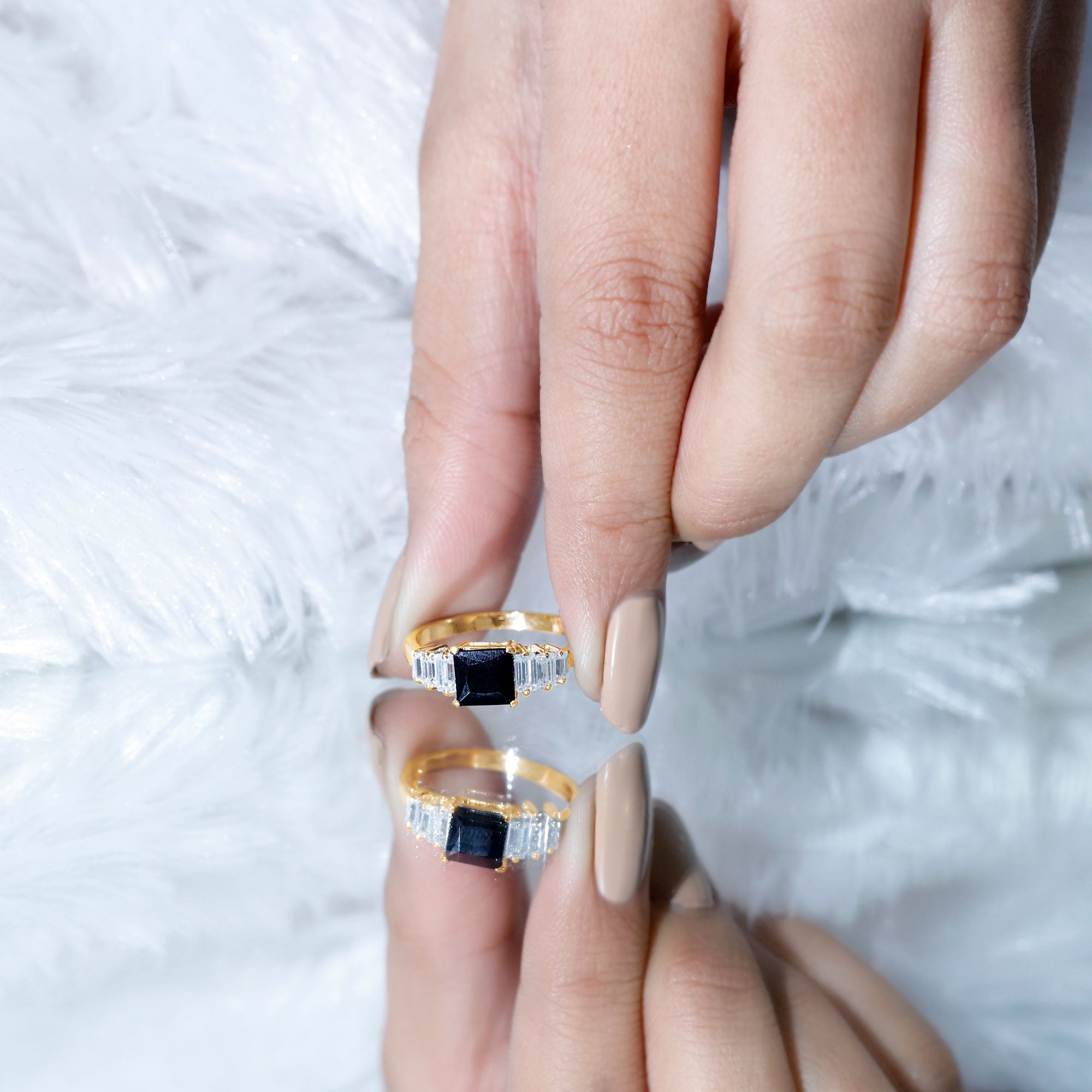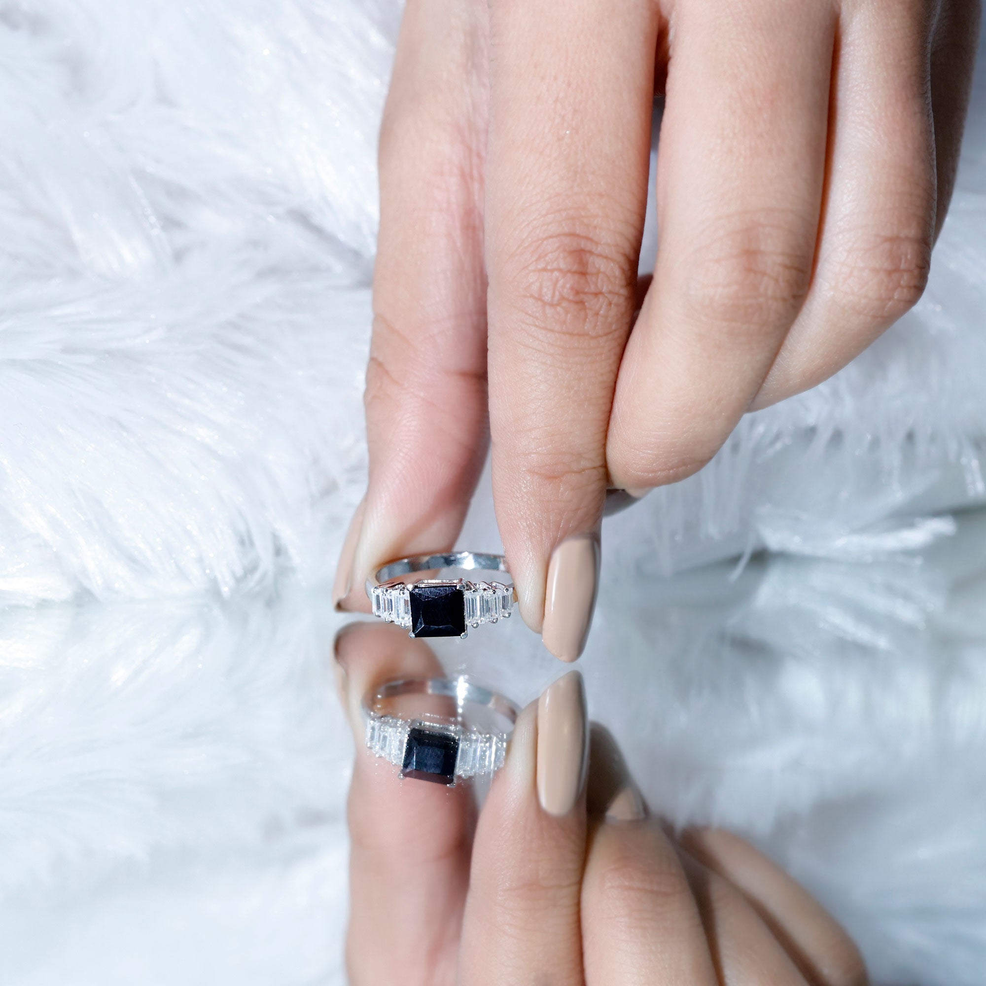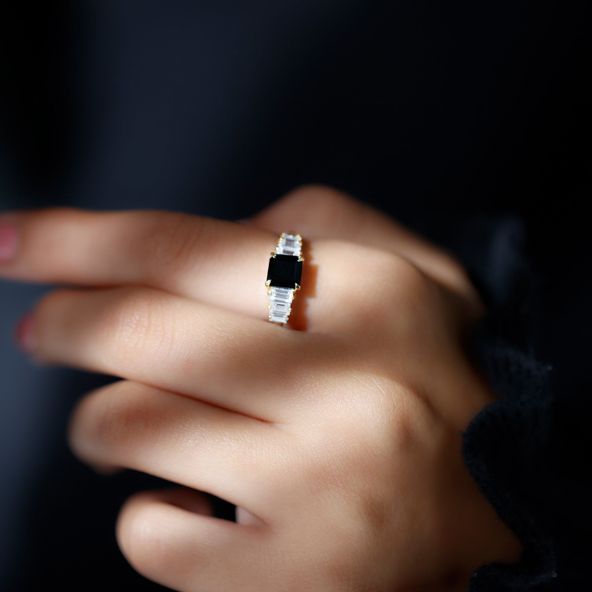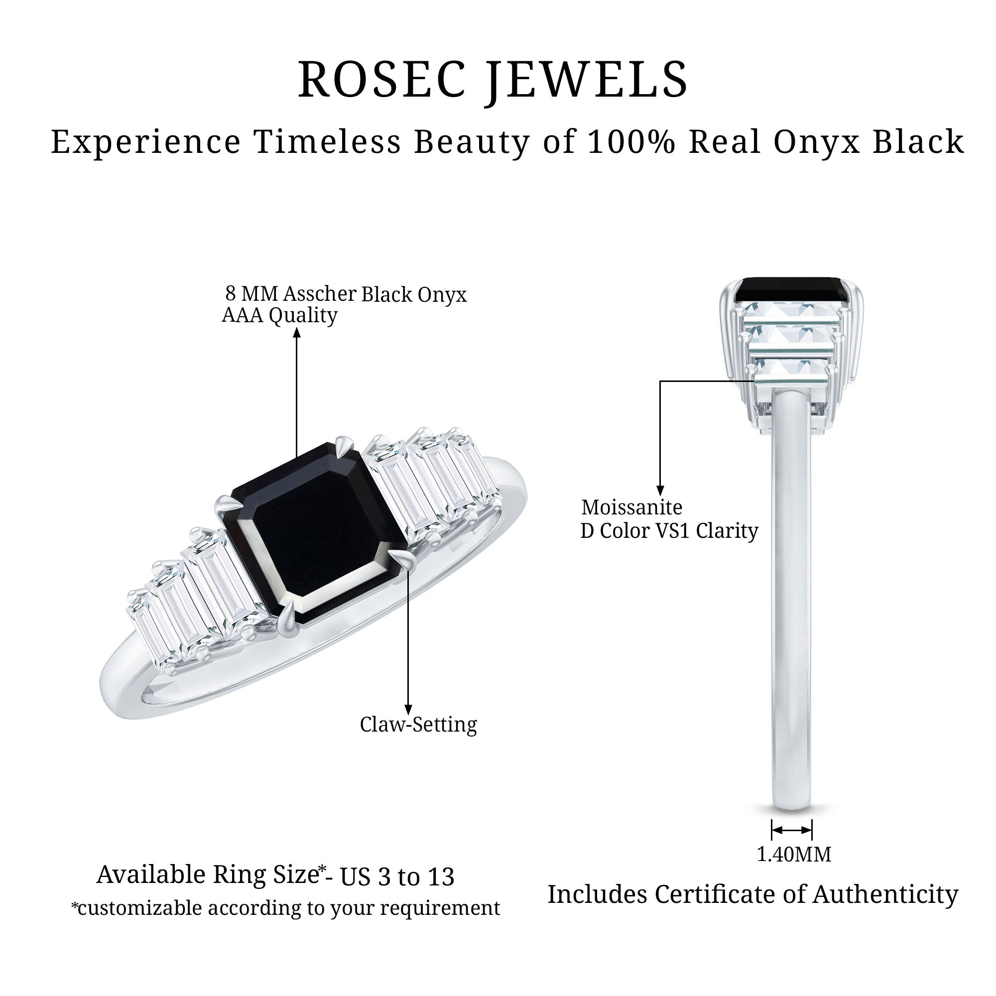 Choose this elegant Designer Engagement Ring for your love to make her feel special and lovable. This Engagement Ring features an 8 MM Asscher Cut Black Onyx in the center in a claw setting with Baguette Moissanite side stones, it is handcrafted with Precious Metal for a luxe look. This Black Gemstone Ring will take your lady love to the realm of elegance with the fusion of classic sophistication and modern style. The deep black hue of this ring will reflect your intense and prominent feeling for your lady love. The Glossy Onyx beholds the dramatic elegance perfect for a grand celebration of love. This Asscher Cut Engagement Ring will be delivered to you in the signature jewelry box with a certificate of gemstone authentication to assure the quality of the ring.