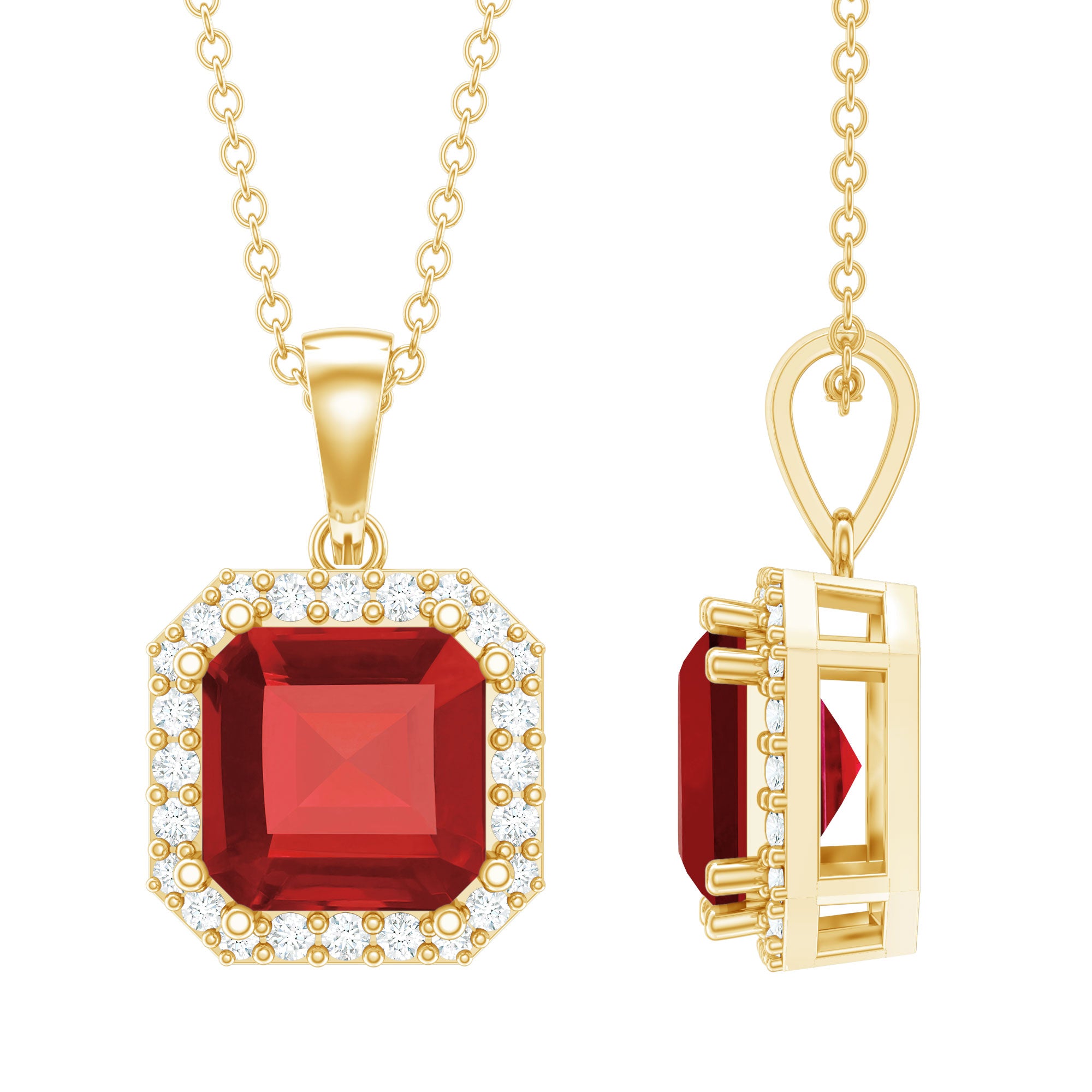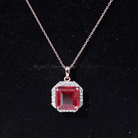 Elevate every look with the sparkling brilliance of our Lab Created Ruby Pendant. It features a 8 MM Asscher Cut Lab Grown Ruby elegantly placed in prong setting encircled by Round Shape Petite moissanite which creates a captivating halo frame, perfect for a striking look. Illuminate your fashion game with the charming allure of this July Birthstone Pendant. From casual wear to glamorous evening outfits, upgrade all your fits by wearing this Halo Pendant Necklace, designed to captivate your senses.