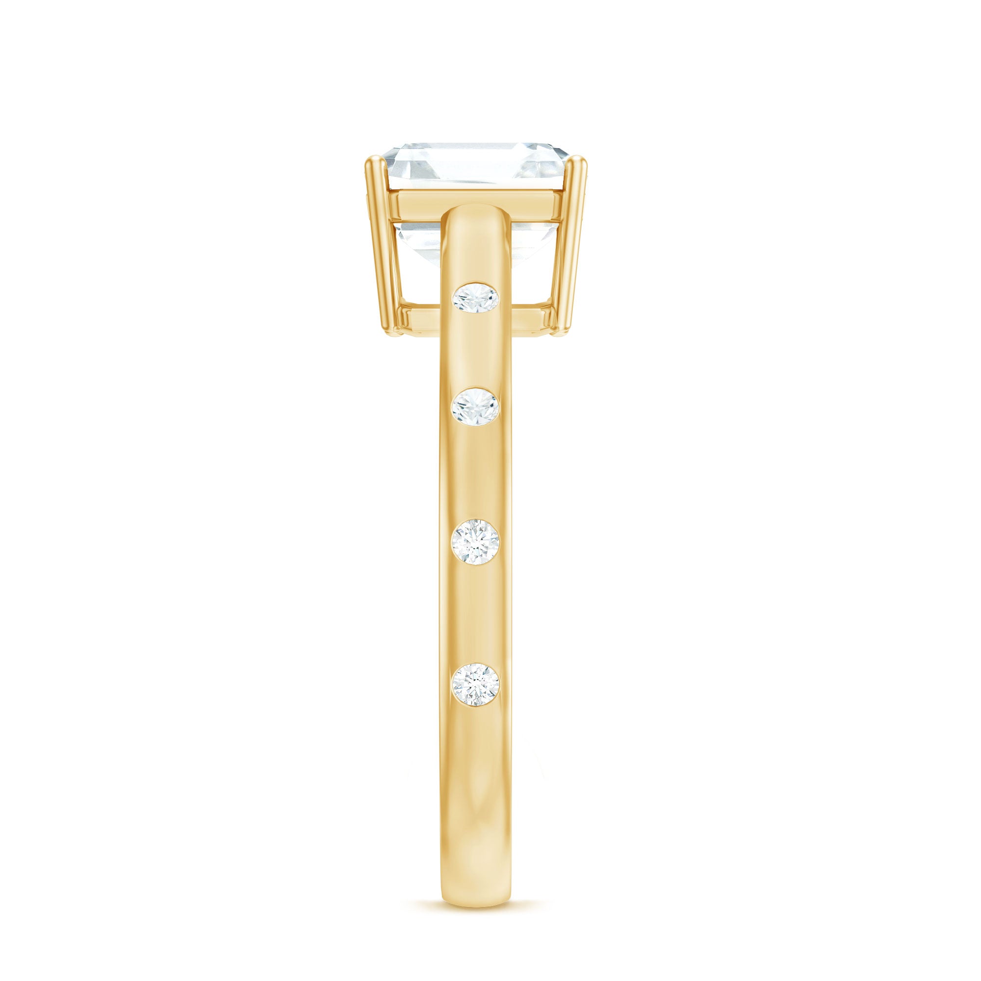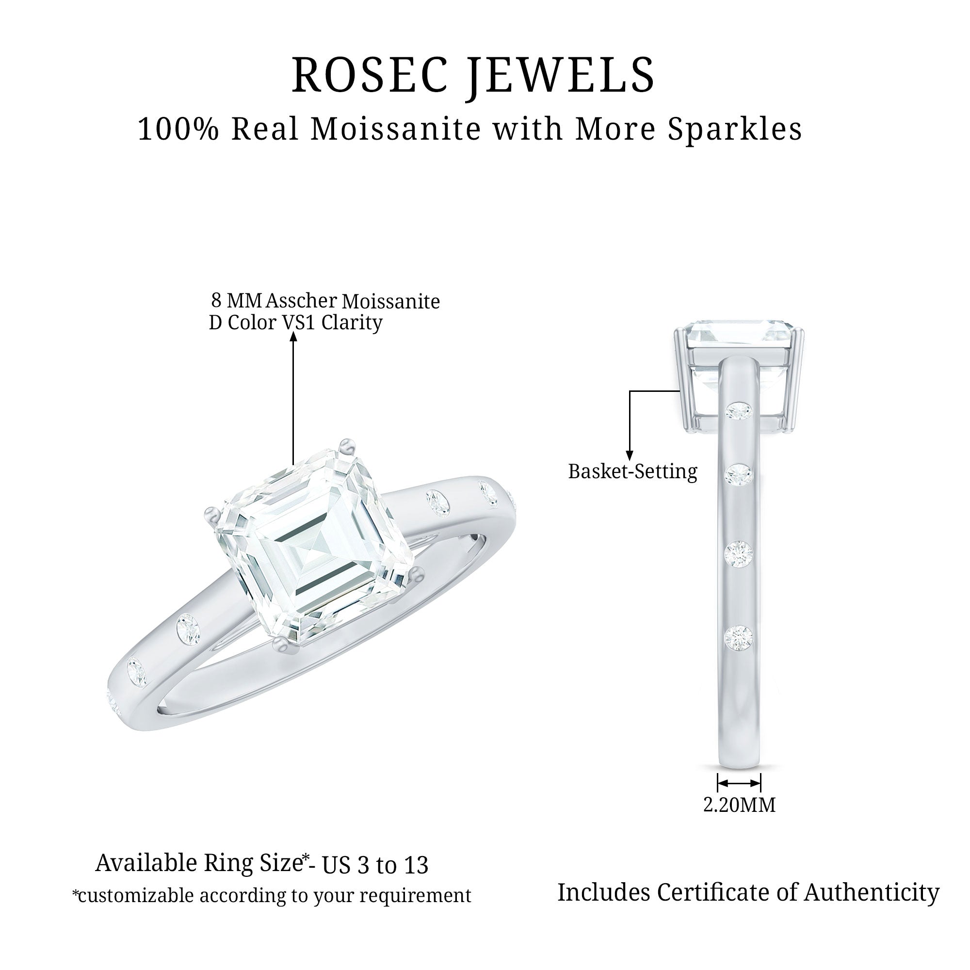 Make your proposal unforgettable with this striking Moissanite Engagement Ring - a symbol of bold love and timeless style. At its center sits an 8 MM Asscher cut moissanite securely held by prong setting. The unique asscher cut reflects light, offering a clean and sophisticated brilliance that sets it apart from traditional cuts. Adding a modern twist, the band features round cut moissanite side stones, delicately spaced to give a minimal yet captivating sparkle across the finger. These accents not only highlight the central stone but also lend a contemporary edge to this ordinary classic design. Whether you are choosing it for an engagement, anniversary, or just a heartfelt gift, this 3 Carat Moissanite Ring is designed to celebrate a love that is strong, brilliant, and enduring. Available in a wide range of sizes, this Asscher Cut Engagement Ring ensures a tailored fit that feels as special as the moment itself. Carefully crafted with attention to every detail, this Solitaire Engagement Ring is more than just a piece of jewelry - it is a reflection of your story, your promise, and the radiant future youre about to build together.