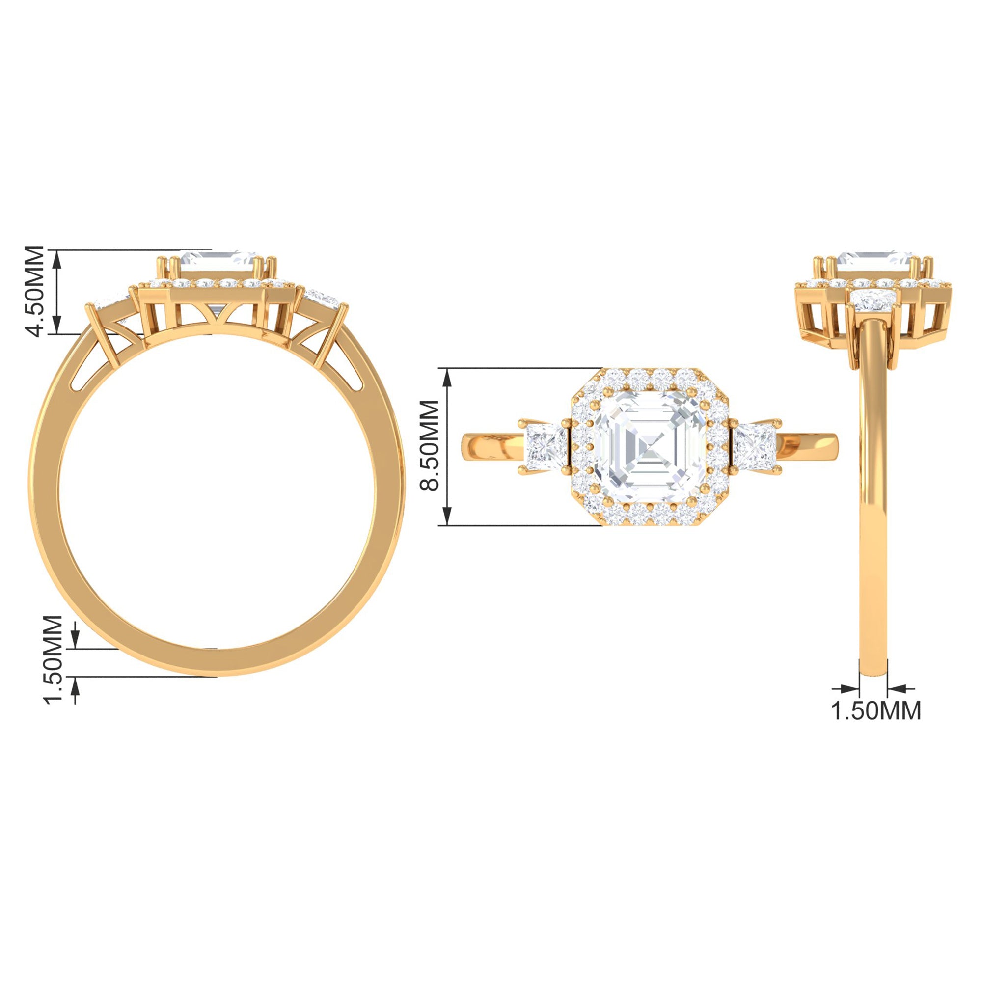 Start your journey of Love with this Beautiful Zircon Engagement Ring. It is embellished with Asscher Cut Zircon set in Prong Setting with round zircon halo and princess cut gemstone on both side. This Statement Engagement Ring is crafted in Gold to make it a piece of women Fine Jewelry. Buy this enchanting Cubic Zirconia Gold Engagement Ring for the love of your life and make her eyes glitter.