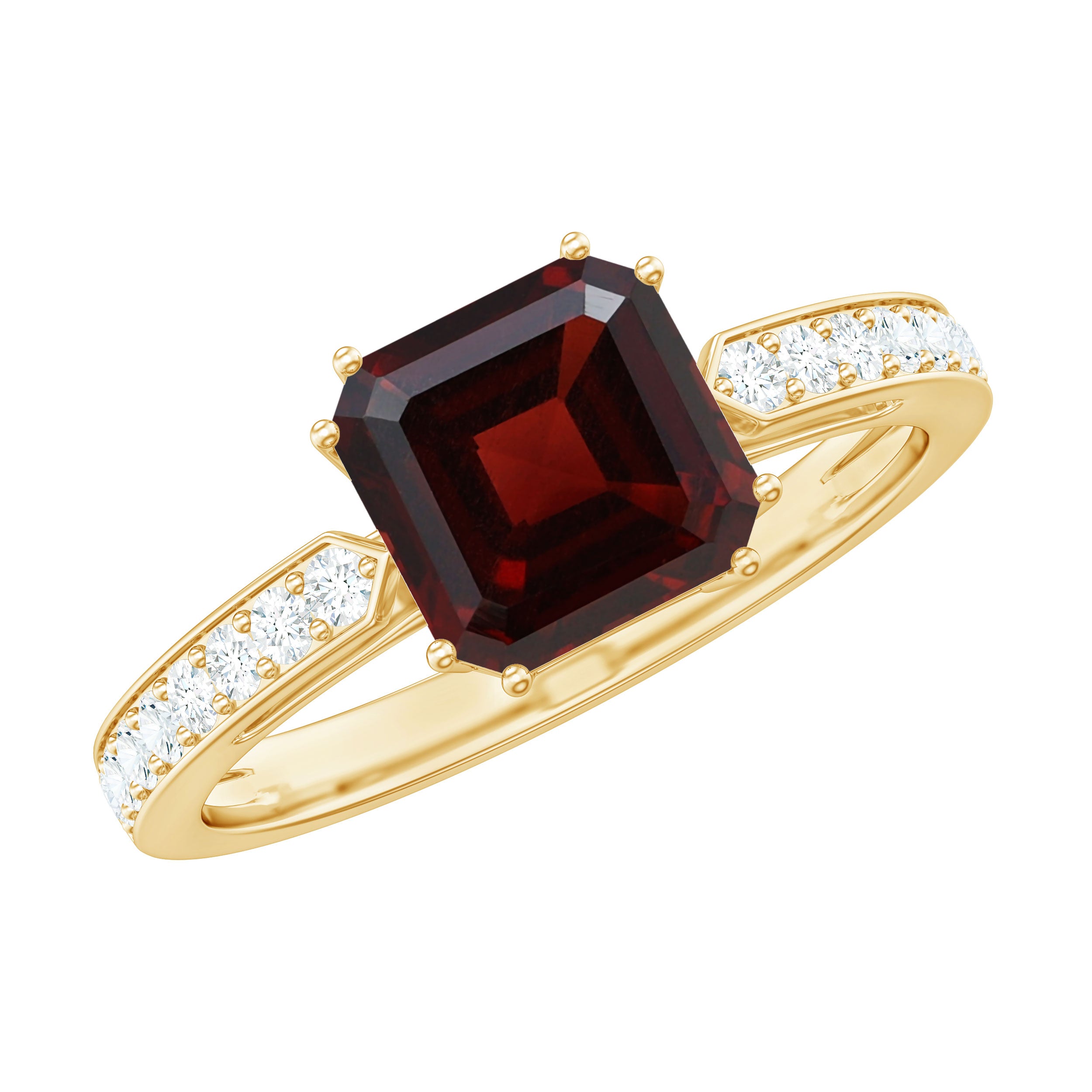 When you present this Solitaire Engagement Ring to her, she is sure to be over the moon. Featuring Asscher Cut Garnet set in a solitaire position in an 8-prong setting with Round Diamond in a Side Stones on this Engagement Ring. With Gold Metal construction, this Garnet and Diamond Ring for her is absolutely stunning.