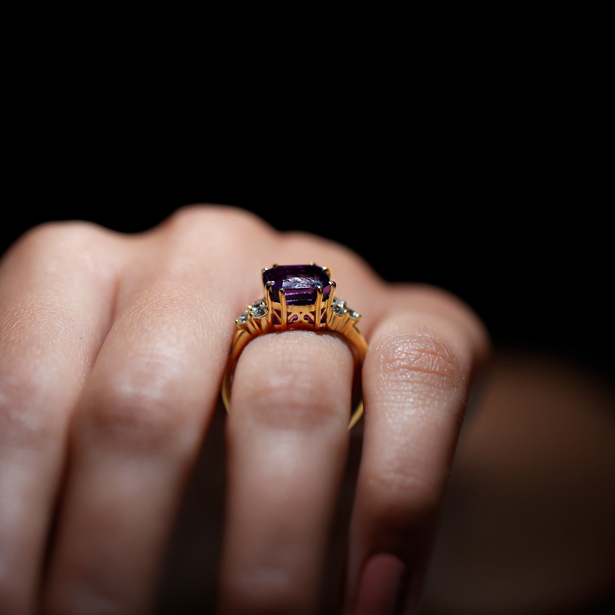 This simple and stunning Engagement Ring features an Asscher Cut Amethyst secured by Double Claw Setting and flanked by Round Shape Diamond Trio. • This Solitaire Ring is crafted with Hallmarked Metal to make it enchanting jewelry. Give a new meaning to your love by surprising your favorite person with this Wedding Ring.