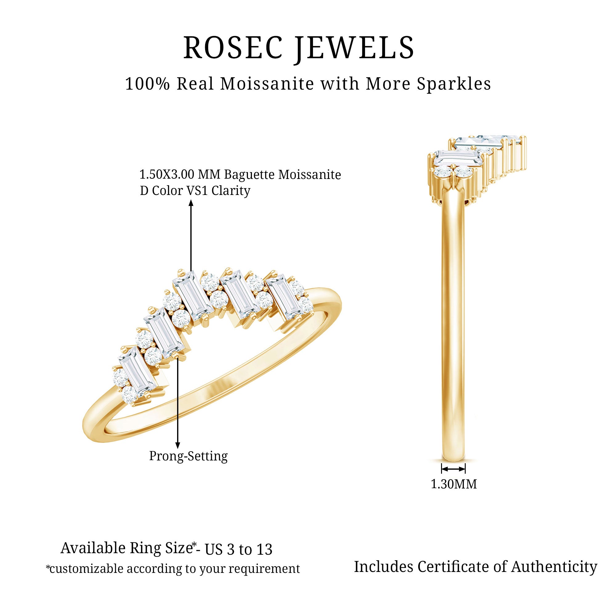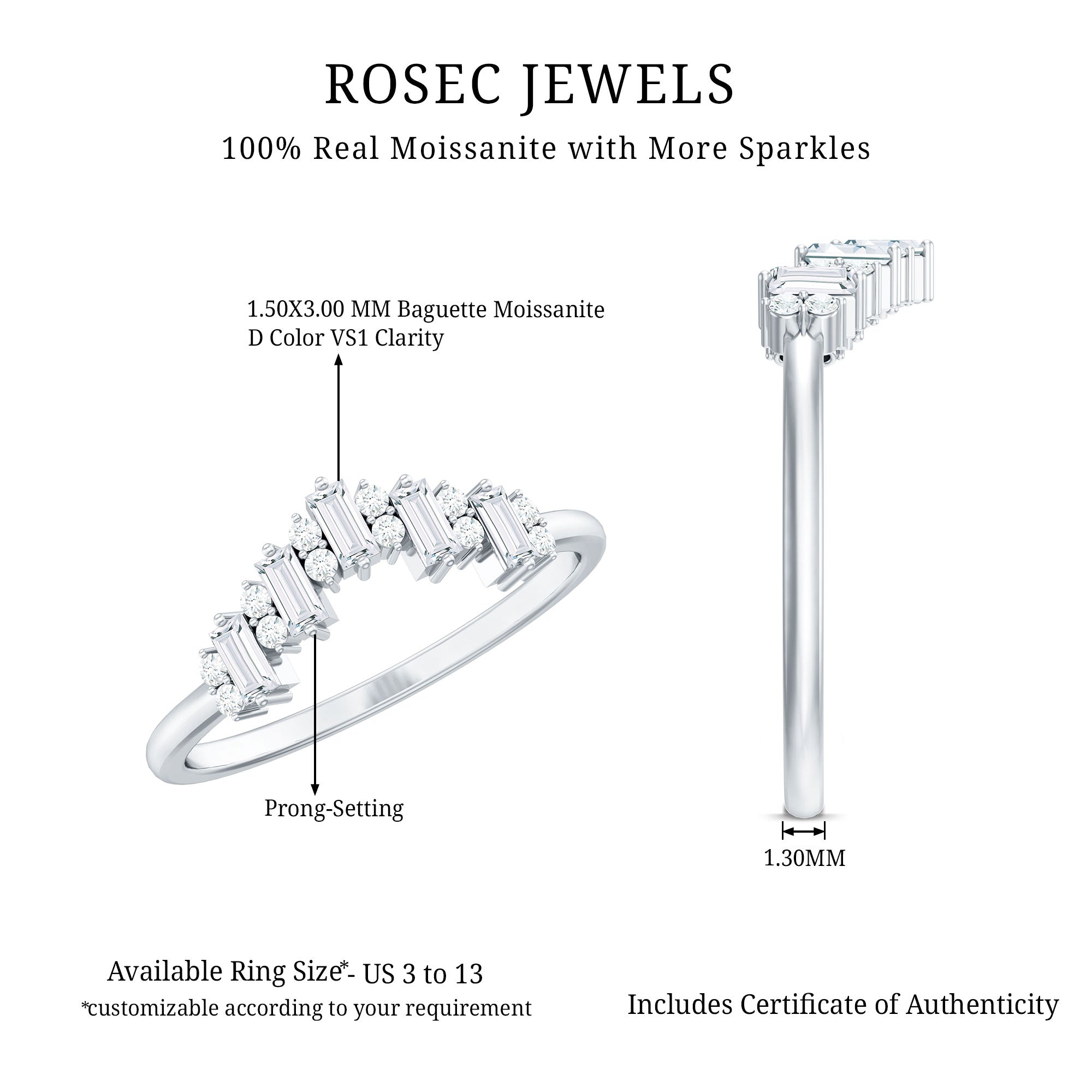 Rosec Jewels presents a Moissanite Enhancer Ring that beautifully symbolizes lasting love. The ring’s elegant curve represents strength and grace, making it a meaningful addition to any jewelry collection. Its modern design has a timeless feel, perfect for those who want to add extra sparkle to their engagement ring or wear something bright and stylish every day. The Chevron Band is decorated with a mix of baguette and round cut moissanite stones, all of D-VS1 quality. Each stone is carefully set in secure prong setting. This versatile Moissanite Stackable Ring can be worn alone as a bold piece or paired with your engagement ring for a layered look that adds charm and elegance. Its graceful curve fits beautifully around another ring, making it a perfect ring guard or enhancer. Whether marking a special milestone or simply wanting to refresh your style with some extra shine, this Engagement Ring Enhancer offers both beauty and meaning. It comes with a certificate of authenticity, so you know the quality is guaranteed. Packaged in a signature jewelry box, it is ready to be gifted or treasured for yourself.