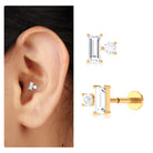 This unique two-stone Moissanite Tragus Earring sparkles and shines like crazy. Beautified with shimmering Round and Baguette Cut Moissanites secured in Prong Setting. You can style this Moissanite Earring on your Helix, Cartilage, Conch, or Upper lobe Piercing. This 2 Stone Earring will hypnotize everyone with its shine and beauty.