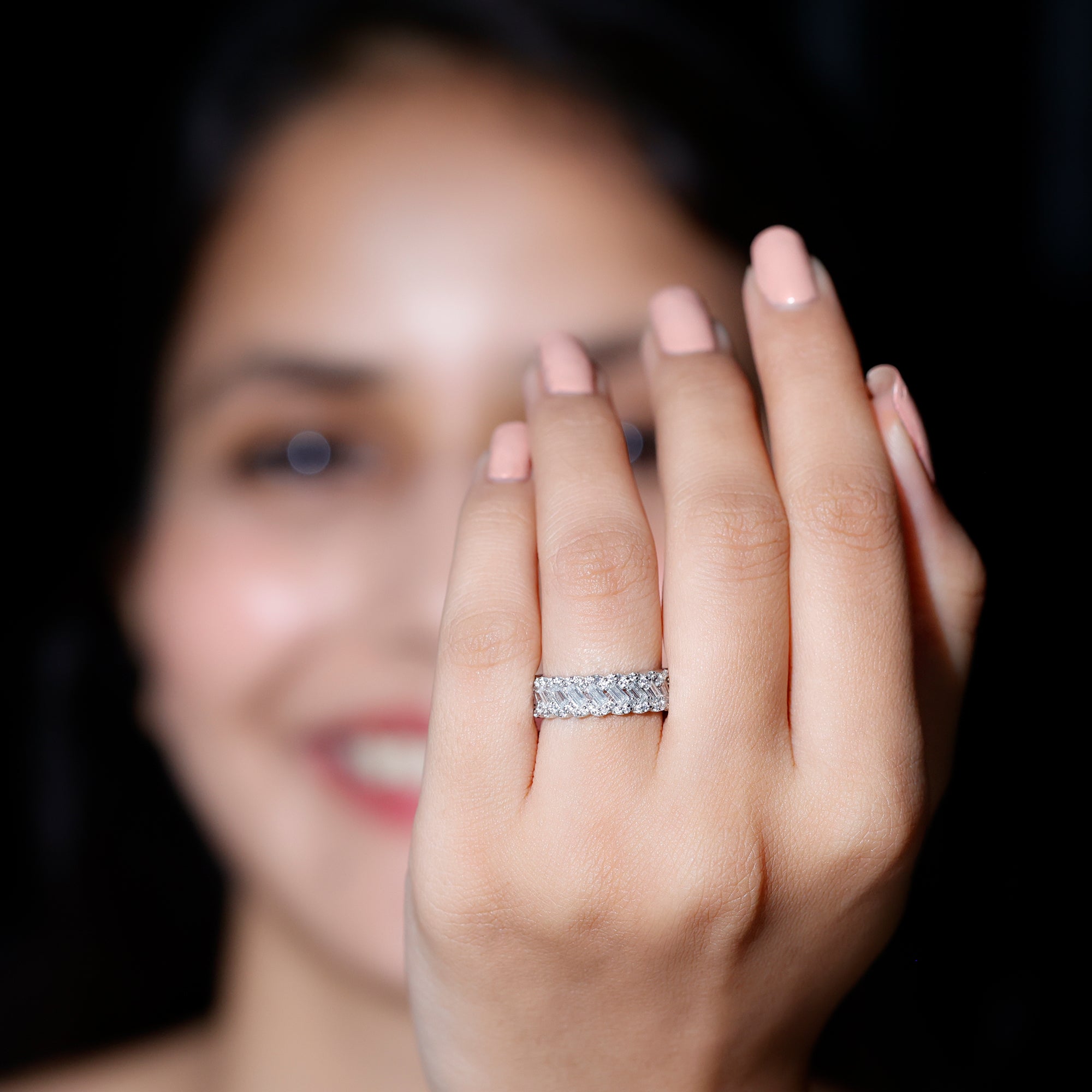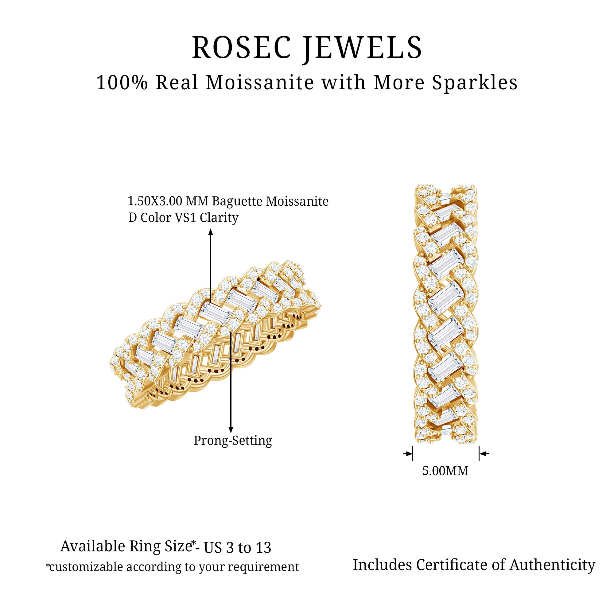 Shining with soft sparkle and graceful style, this Moissanite Eternity Ring brings a special touch to any meaningful moment. The Braided Band is beautifully designed with a mix of baguette and round cut moissanite stones, arranged in a pattern that gently twists around the finger. This braided-inspired look creates a smooth flow of light, making the Moissanite Wedding Band stand out without being too bold. Made as a full eternity band, the stones go all the way around, symbolizing a love that never ends. The Wedding Anniversary Band feels comfortable on the hand, making it perfect for everyday wear or for special occasions. Whether worn alone for a simple look or paired with other rings to create a layered style, it fits many tastes and outfits. You can choose from several metal colors and types to match your style, and the Wide Wedding Band is available in US sizes 3 to 13. This makes it easy to find the perfect fit for anyone. Its timeless design makes it a piece to treasure for years.