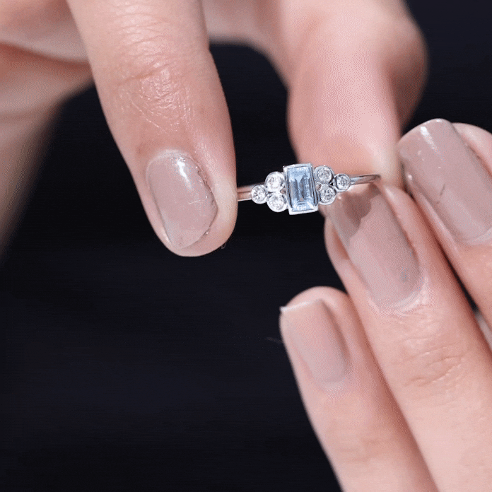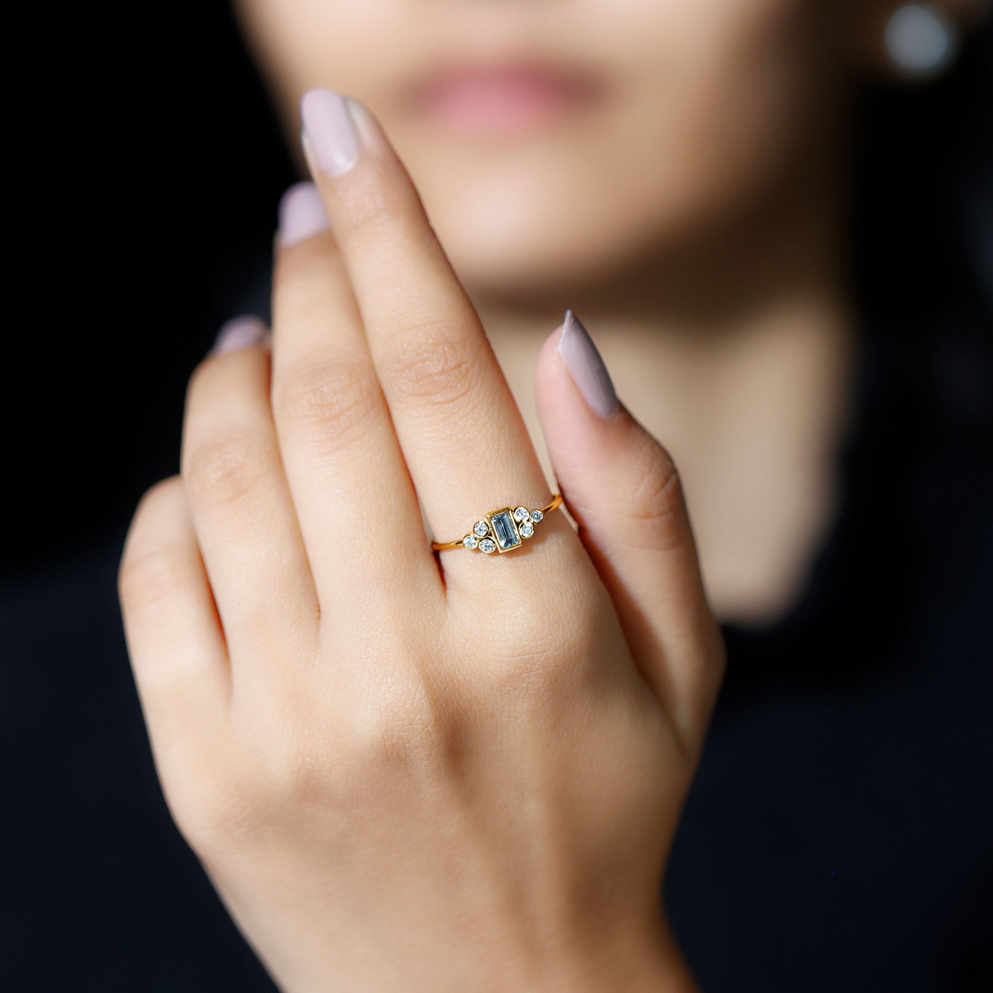 This stunning Aquamarine and Diamond Promise Ring feature a mesmerizing baguette-cut aquamarine while shimmering Diamond studded as a Trio on either side of the center stone. Whether as a promise, engagement, or anniversary ring, this captivating Aquamarine Ring will dazzle on any finger, serving as a constant reminder of your cherished bond.
