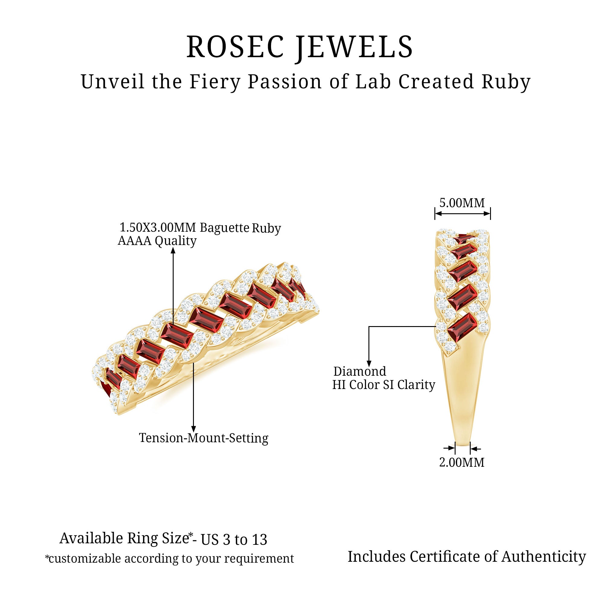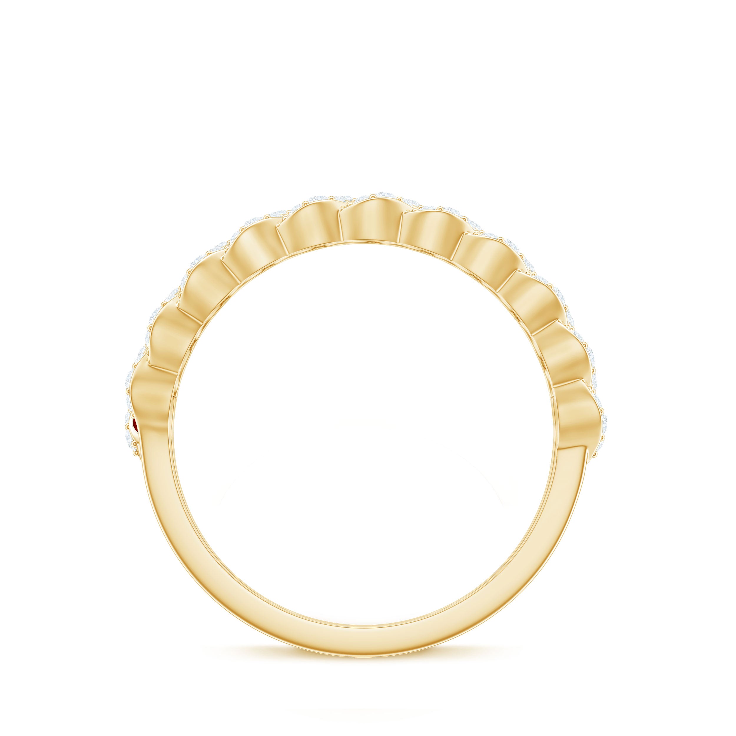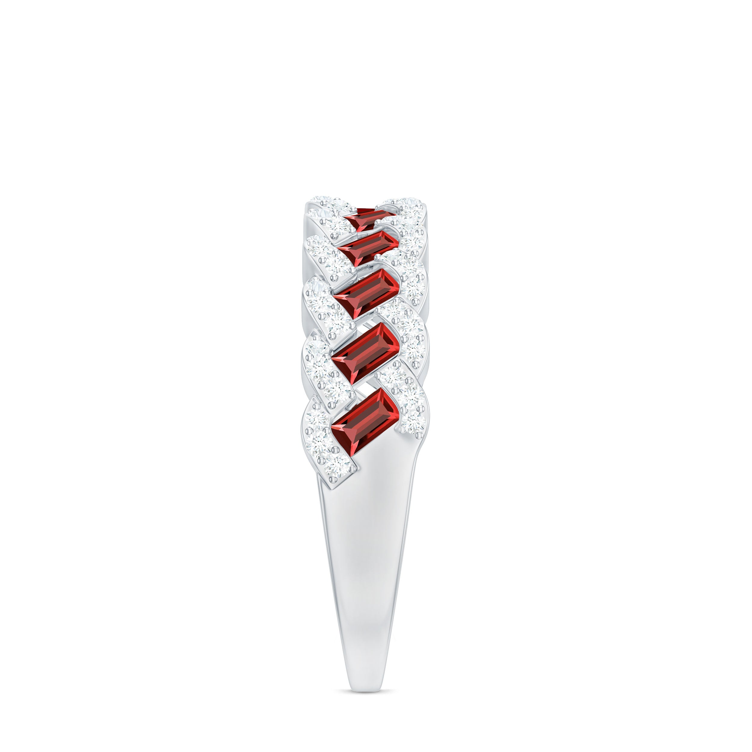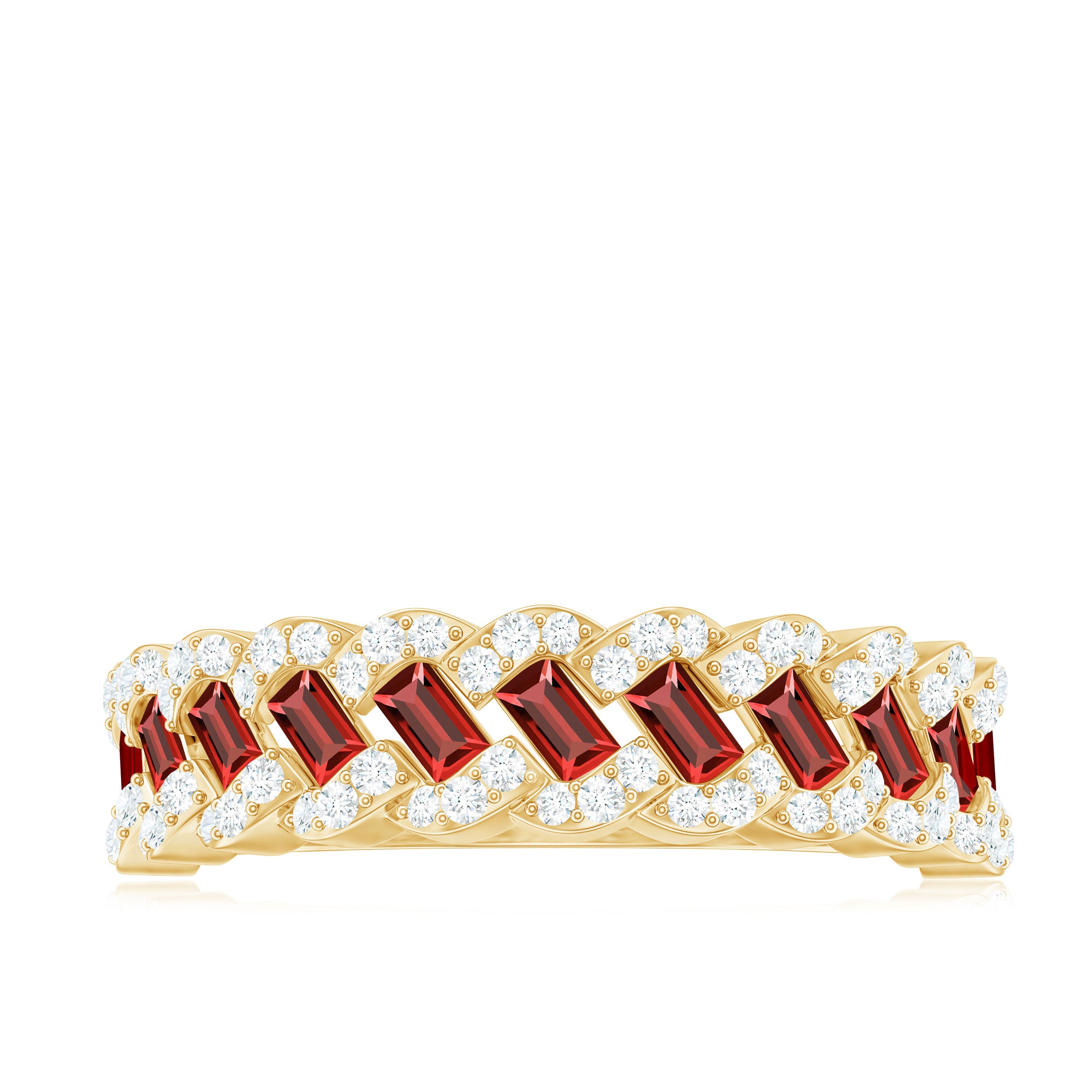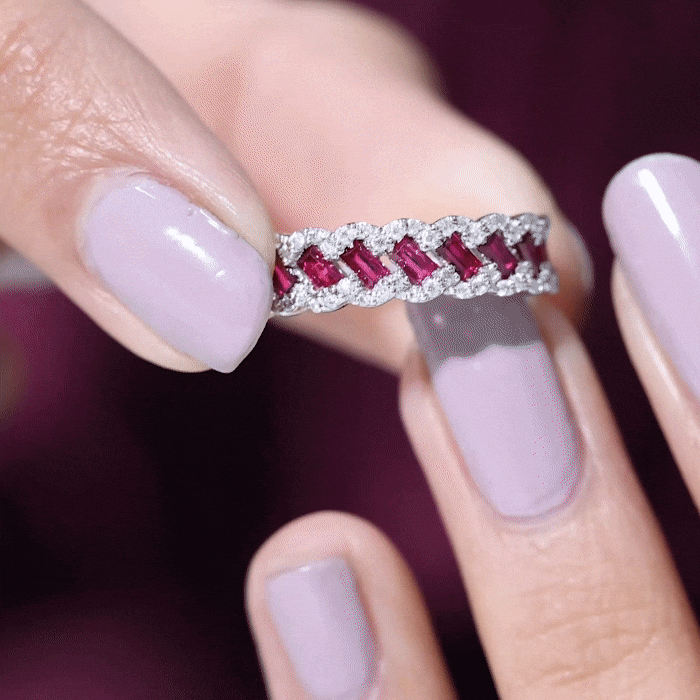 This Solid Gold Half Eternity Ring for women is accented with Baguette Cut Lab Created Ruby and Diamond. The Braided Gold design adds a touch of sophistication, perfect for transitioning from work to special events.