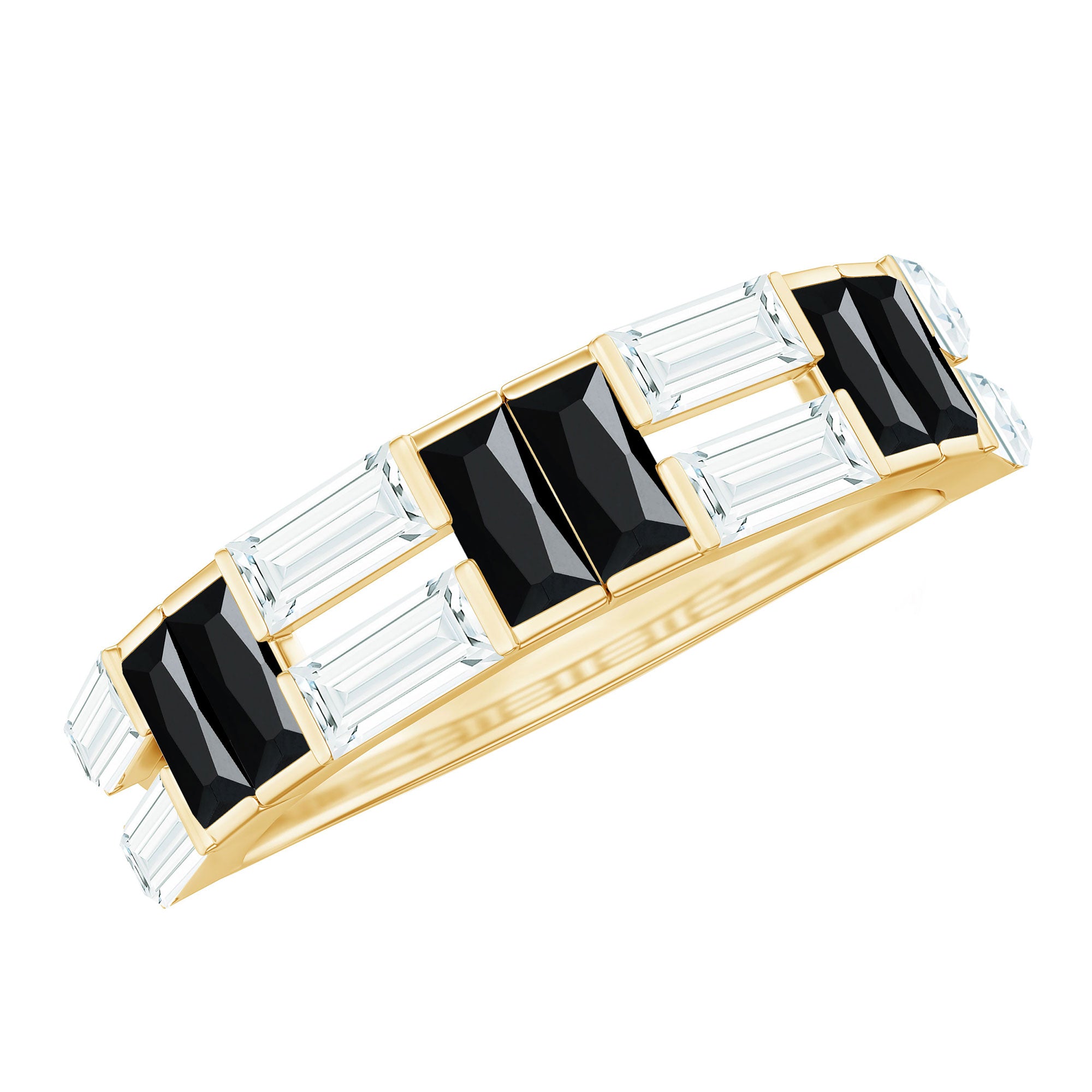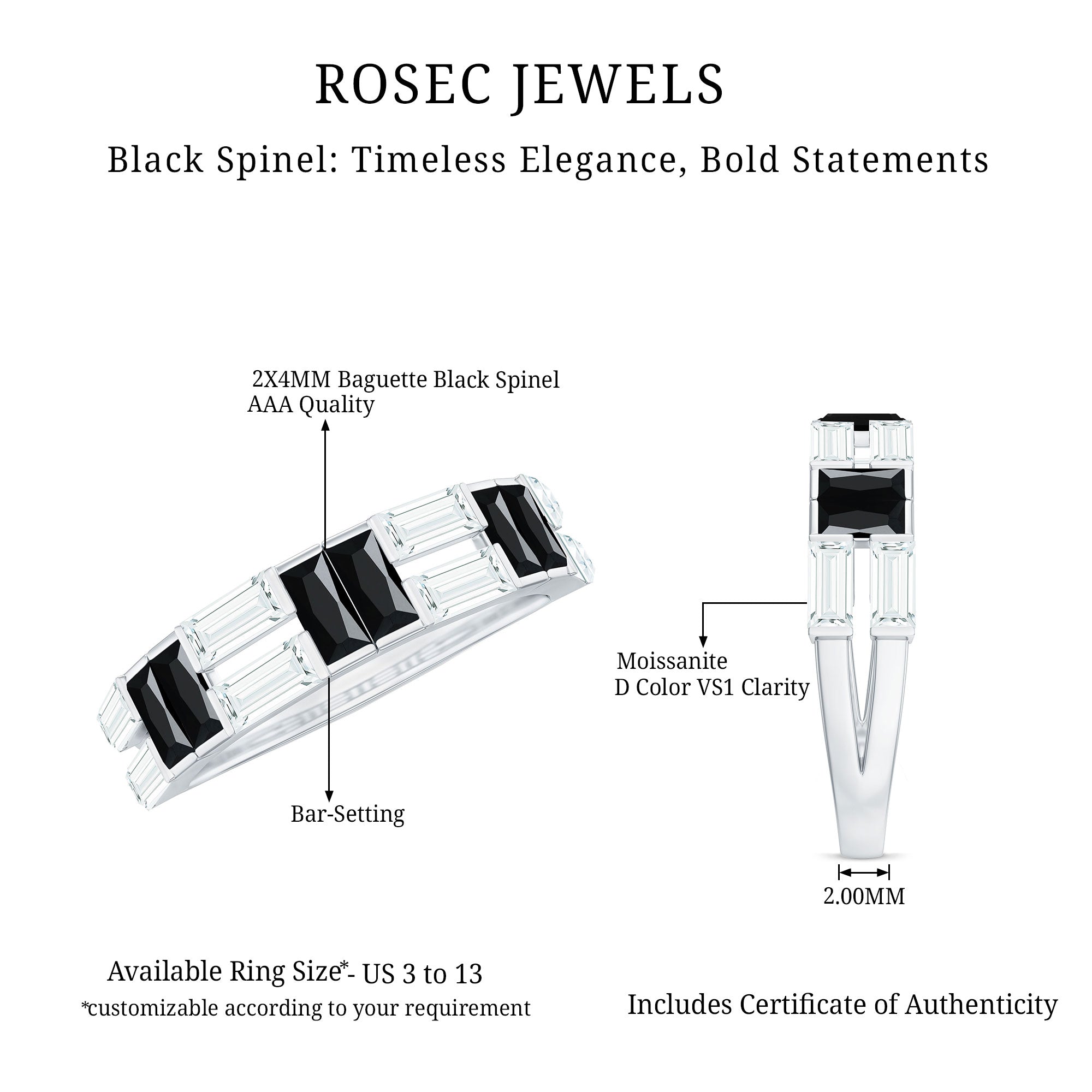 This Wide Eternity Band Ring has Baguette Cut Black Spinel in Bar Setting and Moissanite is a stand-alone piece of jewelry for office wear.