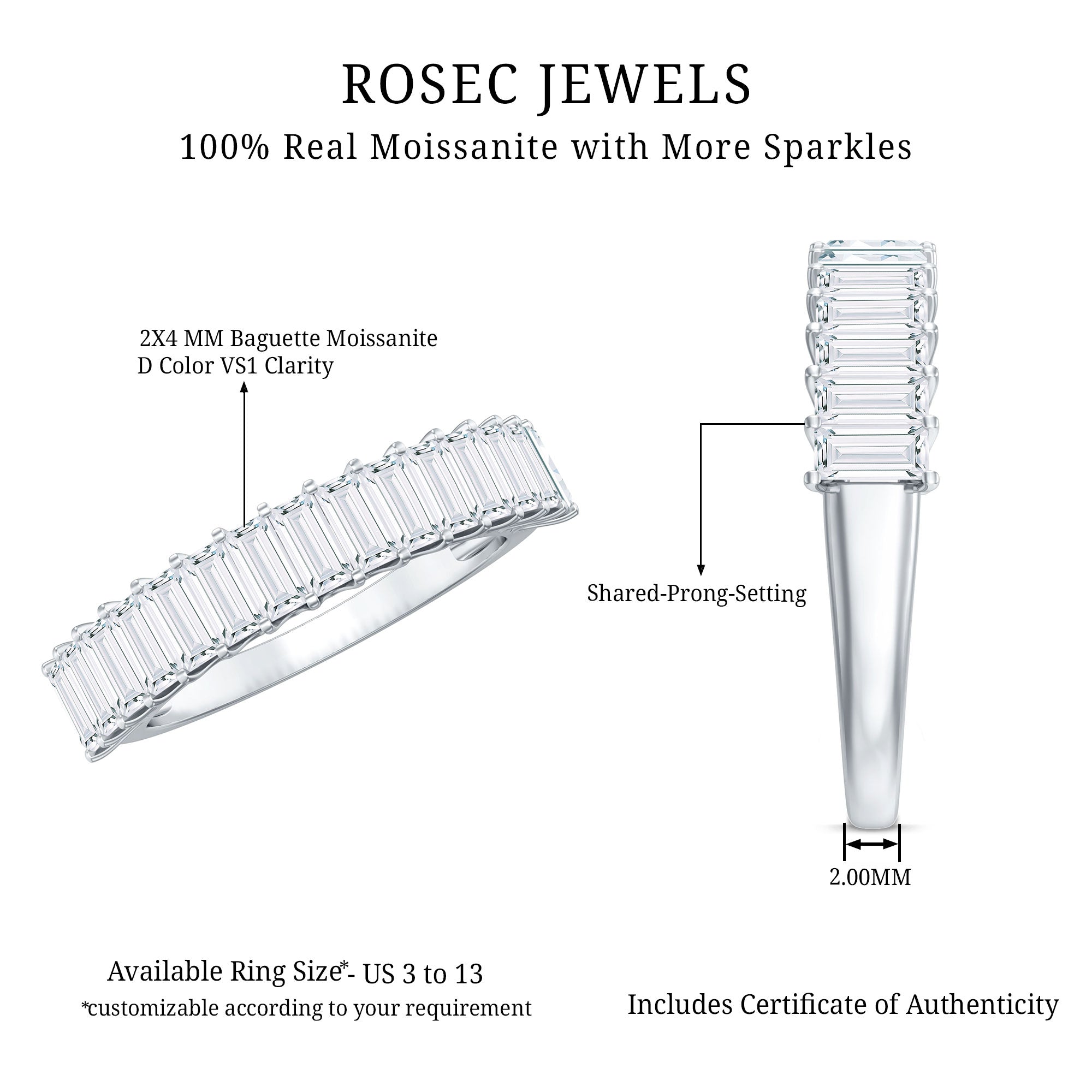 Minimal design and Maximum shine. This Moissanite Baguette Eternity Band is a celebration of modern elegance and timeless symbolism. Featuring a stunning row of 2X4 MM baguette cut moissanite stones, this Half Eternity Band brings bold brilliance to a minimalist design. The half circle design ensures everyday comfort without compromising on shine, perfect for those who love sparkle. Each stone is set in secure shared prong setting, allowing light to pass through effortlessly for a radiant effect. With D color and VS1 clarity, the moissanite gems shimmer with exceptional brilliance, making this Moissanite Stackable Ring an ideal choice for anniversaries, milestone moments, or simply as a stylish statement of self-love. Whether worn solo for a sleek, contemporary look or stacked with your favorite engagement ring or bands, this Moissanite Wedding Band fits every moment and mood. Crafted with care and paired with a gemstone certificate of authenticity, it comes beautifully packaged in a signature jewelry box, perfect for gifting or treasuring for yourself. Whether you are celebrating a wedding, anniversary, or meaningful chapter in your life, this Baguette Wedding Band is more than a piece of jewelry, it is a symbol of something unforgettable.