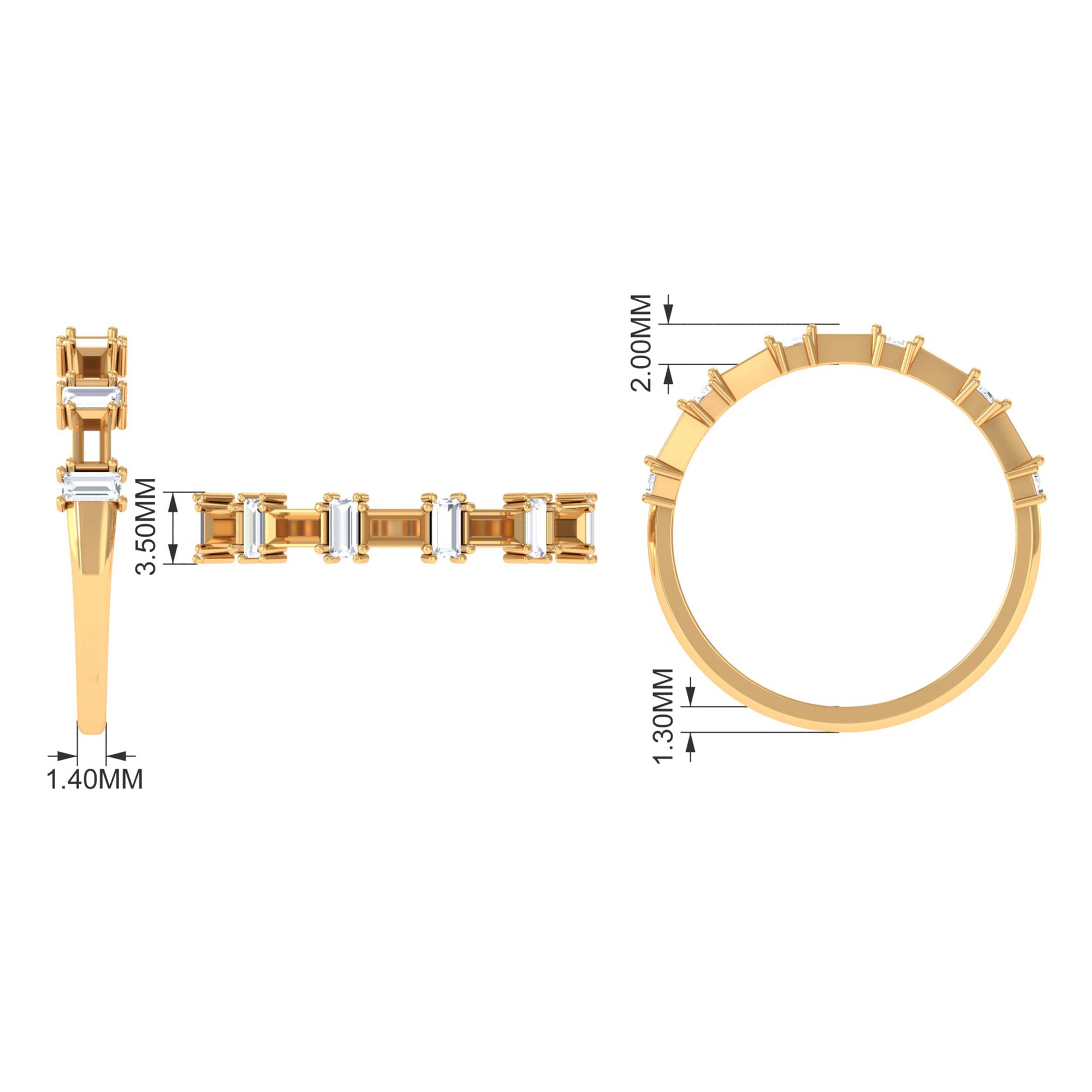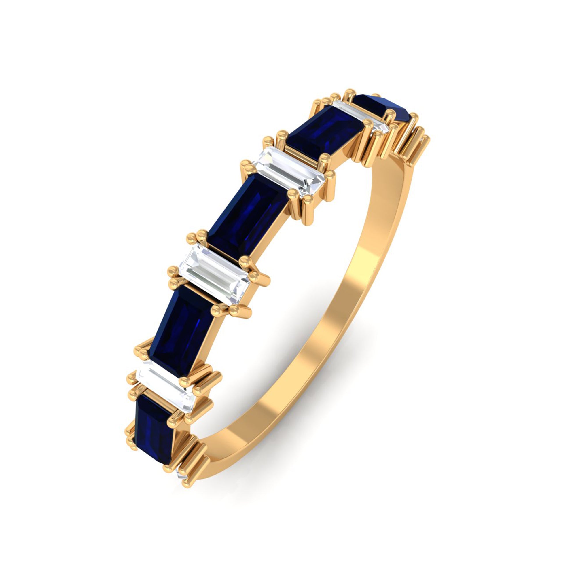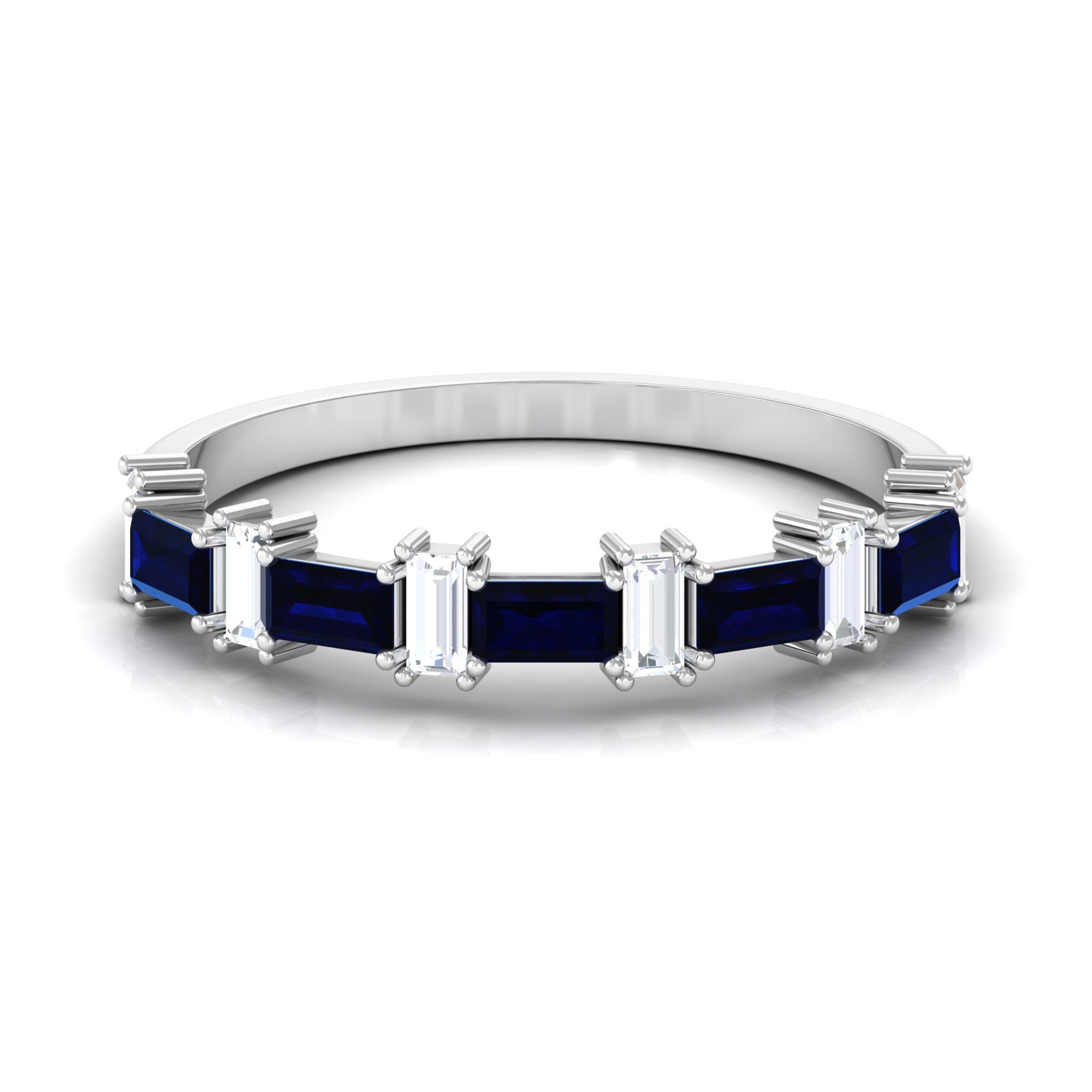 A timeless sparkle, designed just for you. Discover the half eternity band that perfectly balances sophistication and versatility. There’s something truly conspicuous about a piece of jewelry that compliments any moment. Whether youre wearing it alone, stacking it with your favorite rings, or using it as a wedding band, this half eternity band exudes grace and charm. This beautiful stackable ring is adorned with carefully chosen gemstones baguette cut lab created blue sapphire and dazzling baguette diamonds, it’s the perfect blend of designer style and everyday wear ability—offered at a price that effortlessly works into your lifestyle. Each gemstone represents a chapter—milestones, loved ones, or moments worth holding onto. A rich blue sapphire —symbolizing wisdom, loyalty, and enduring love. This Eternity Band Ring is crafted to gracefully enhance your current rings, introducing a hint of brilliance without overshadowing your appearance. Whether you are walking down the aisle or attending an evening gala, this Moissanite Eternity Band promises to be the centerpiece of your look. It is a ring that does not just sit on your hand, but speaks of elegance, confidence, and unforgettable style.