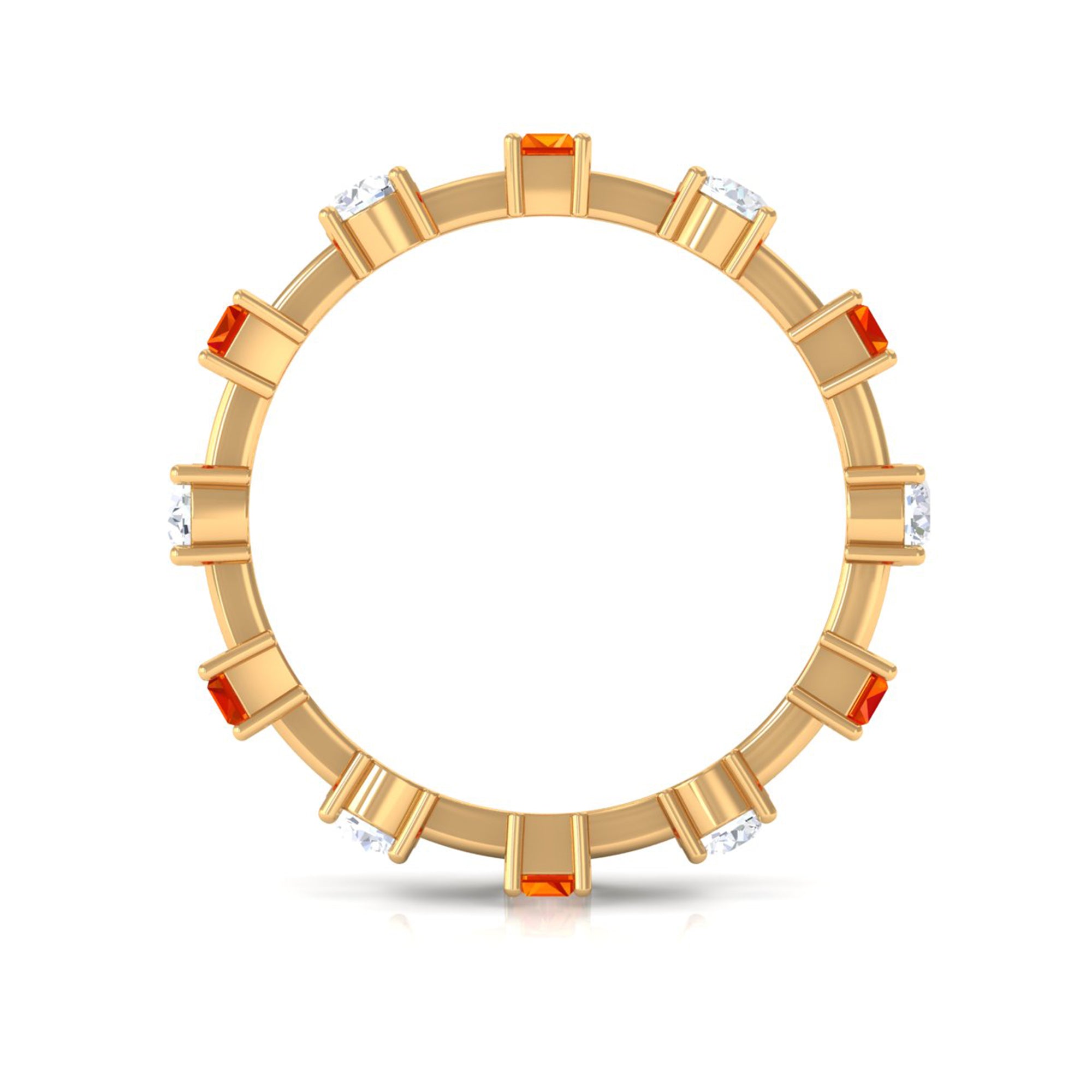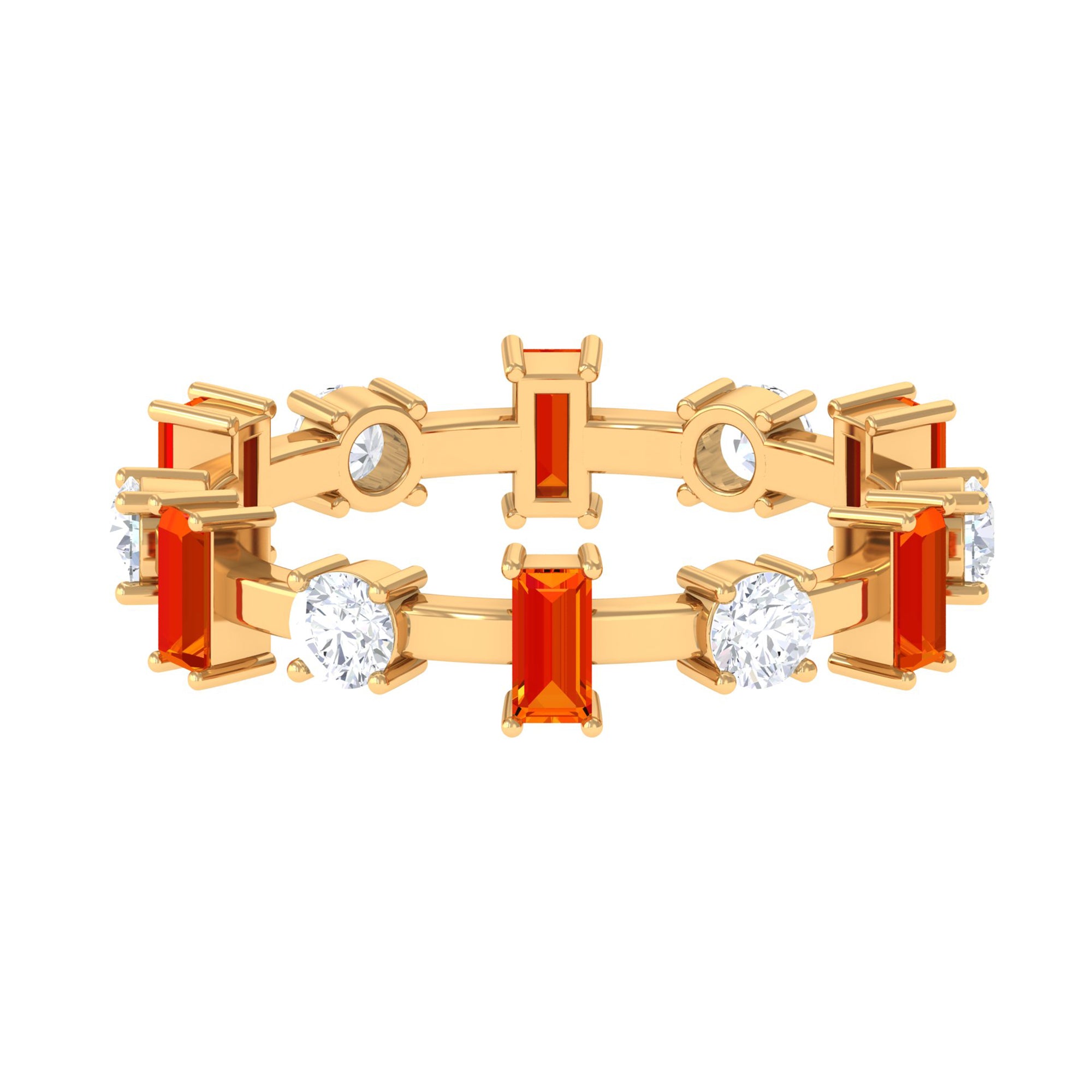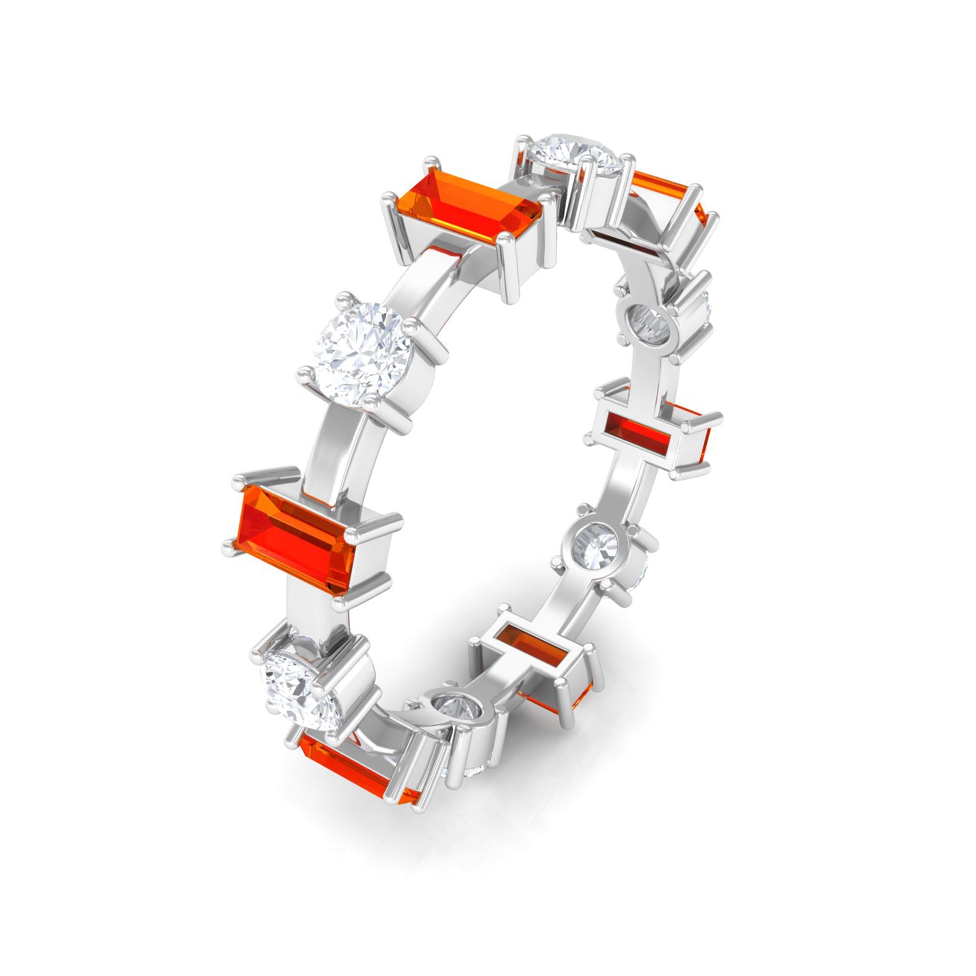 Capture the essence of everlasting beauty with our Eternity Ring. The striking created orange sapphires, expertly cut in a baguette shape, create a captivating and vibrant display of color. Alternating with brilliant Round Moissanite stones, this exquisite ring is a timeless symbol of eternal love and style.