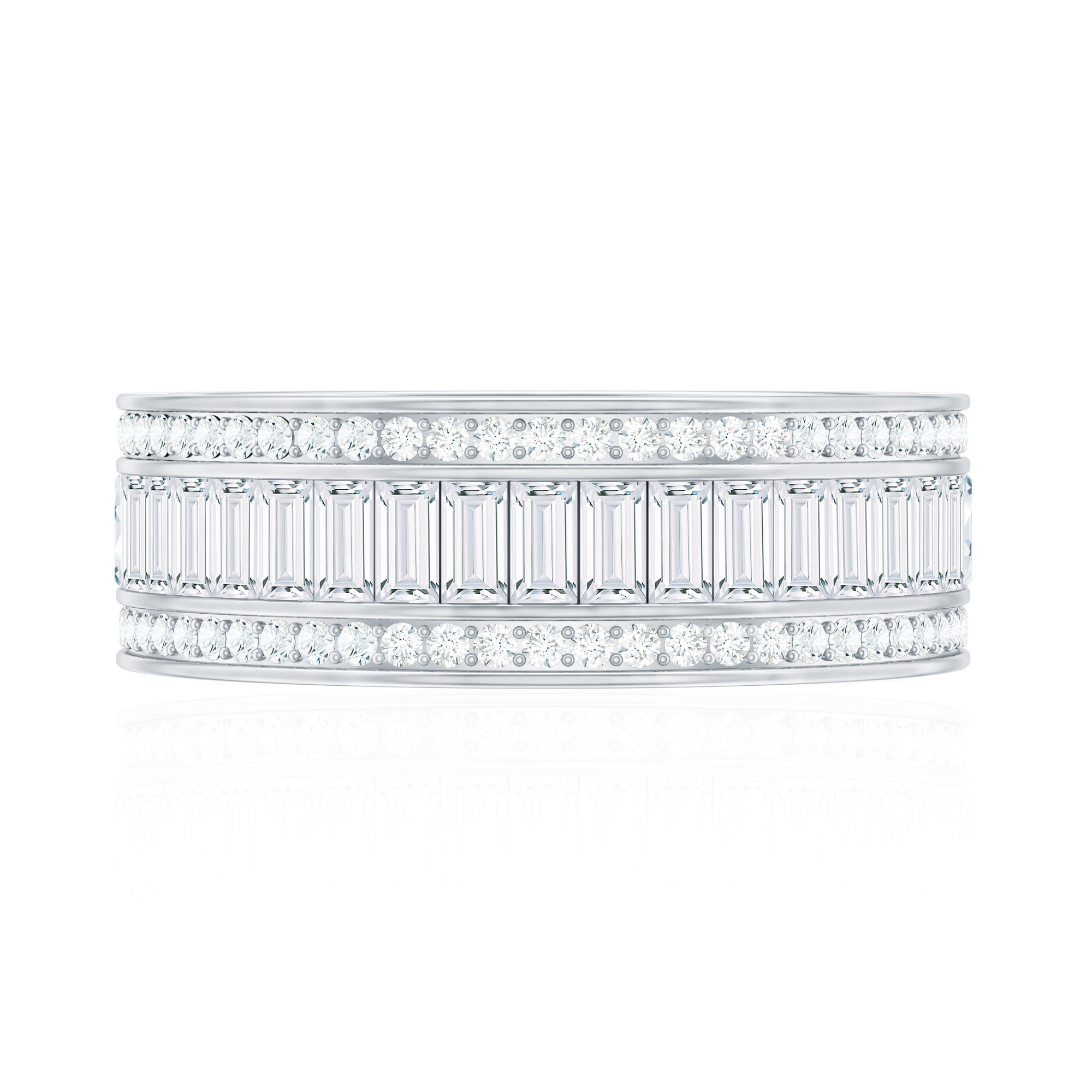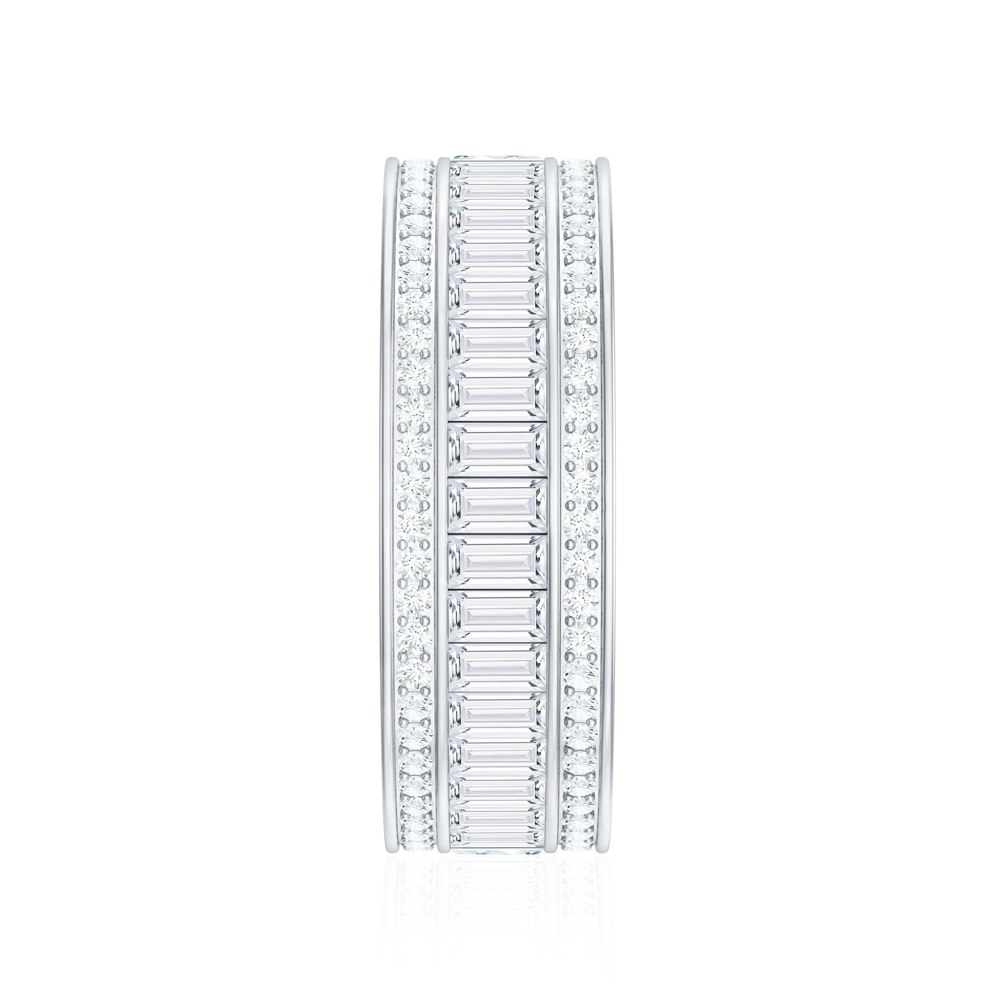 Embark on a journey of love and elegance with this enchanting Eternity Band Ring, a symbol of eternal devotion that will truly captivate your heart. Adorned with a striking design, this Wedding Band Ring showcases a stunning row of Baguette Shape Zircon gemstones securely nestled within a Channel Setting, beautifully framed by two rows of Round Shape Zircon gemstones. Each facet of this exquisite wide band ring represents the enduring beauty and timelessness of your love, making it the perfect choice for commemorating your special bond and commitment.