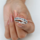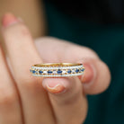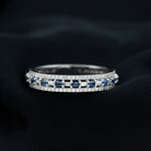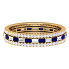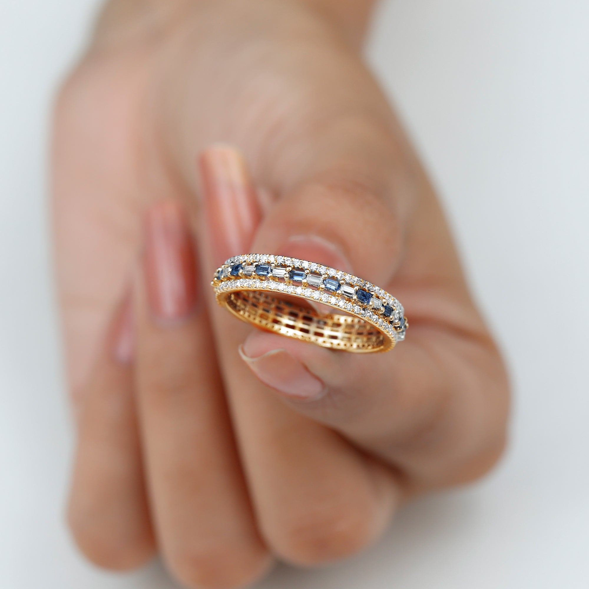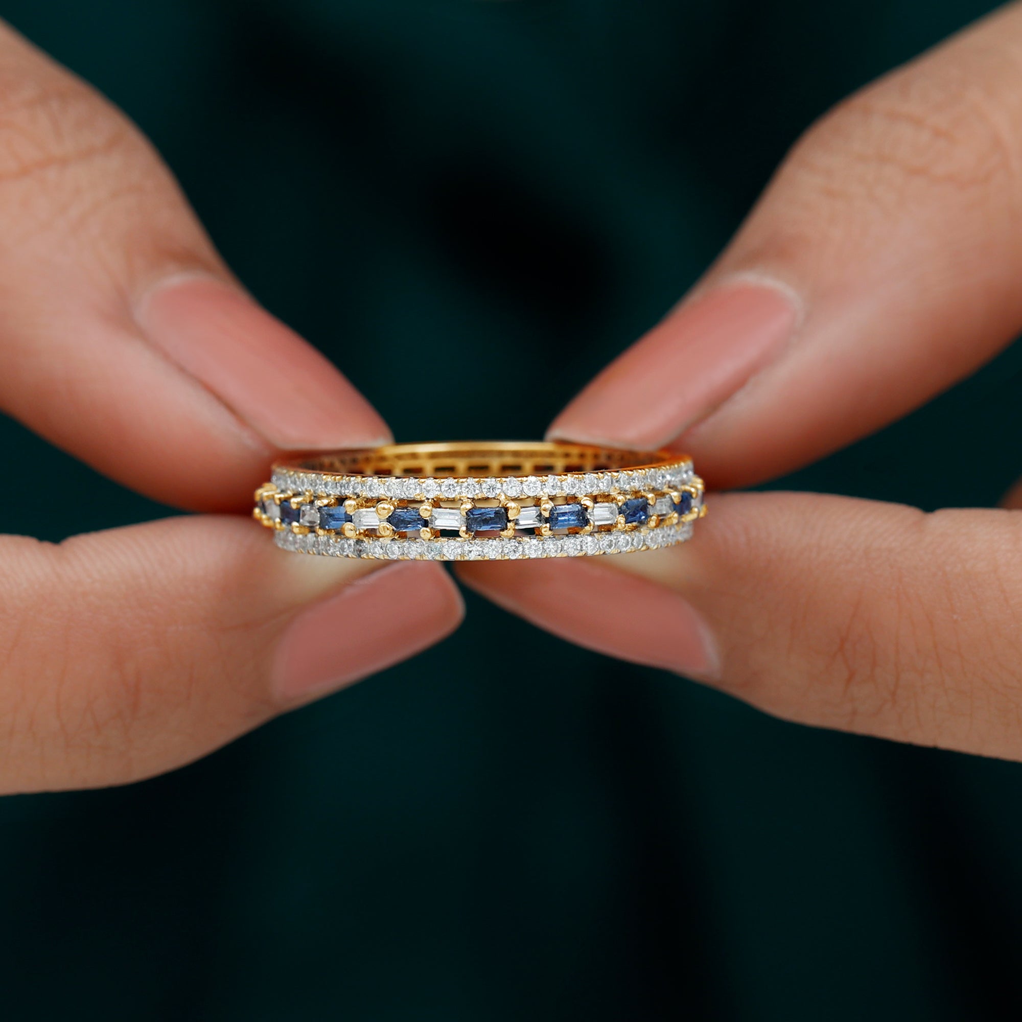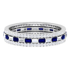 This exquisite wedding band ring features a captivating combination of Baguette Cut created blue sapphire and Baguette and Round Shape Moissanite stones, meticulously set alternately in a secure Prong Setting. This Eternity Band Ring is a stunning and sophisticated choice that will leave a lasting impression.